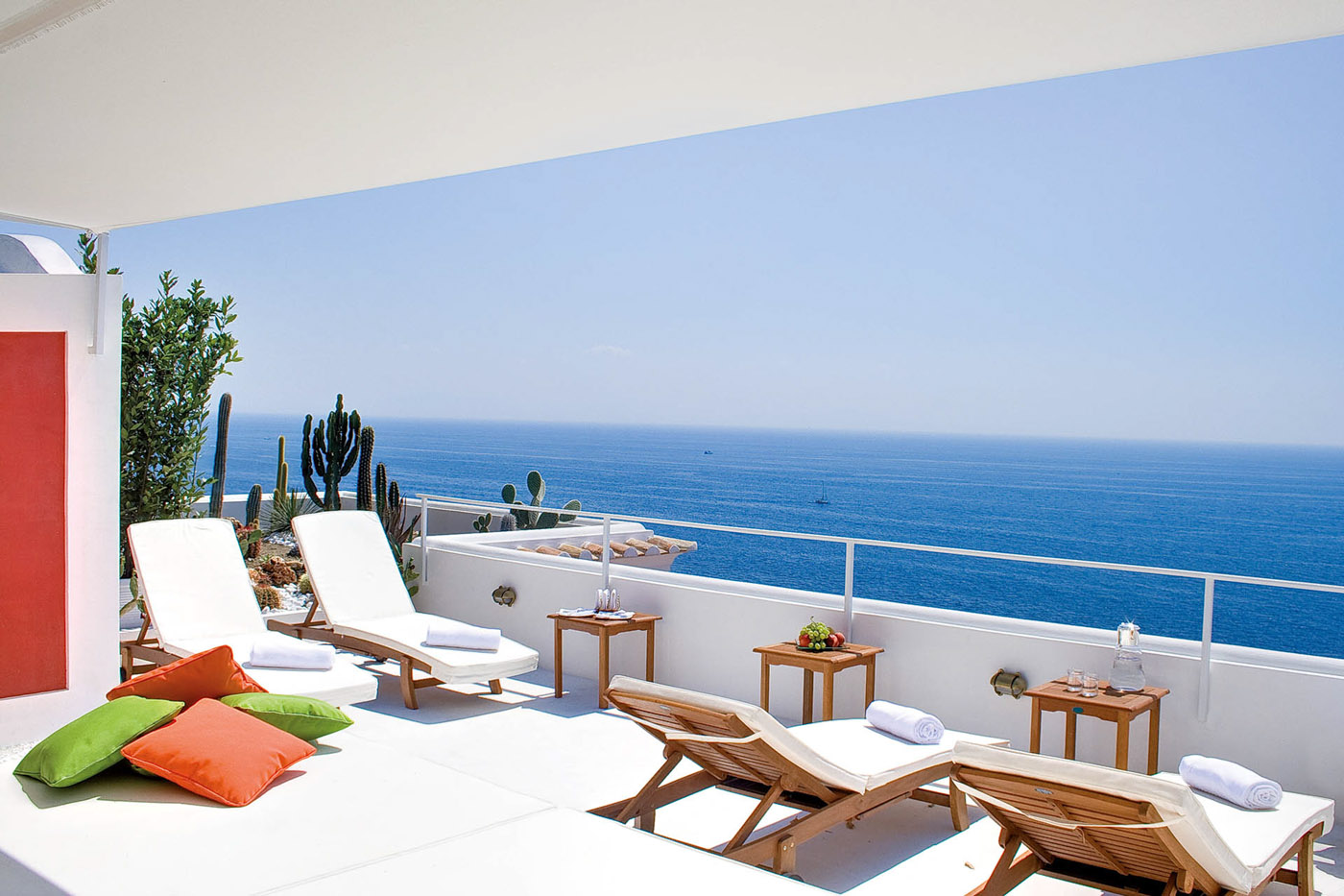 The modern, fully equipped kitchen leads out into the dining room. There is also access, by an internal staircase, to a beautiful rooftop terrace with cushions for relaxing and enjoying the magnificent sea views.