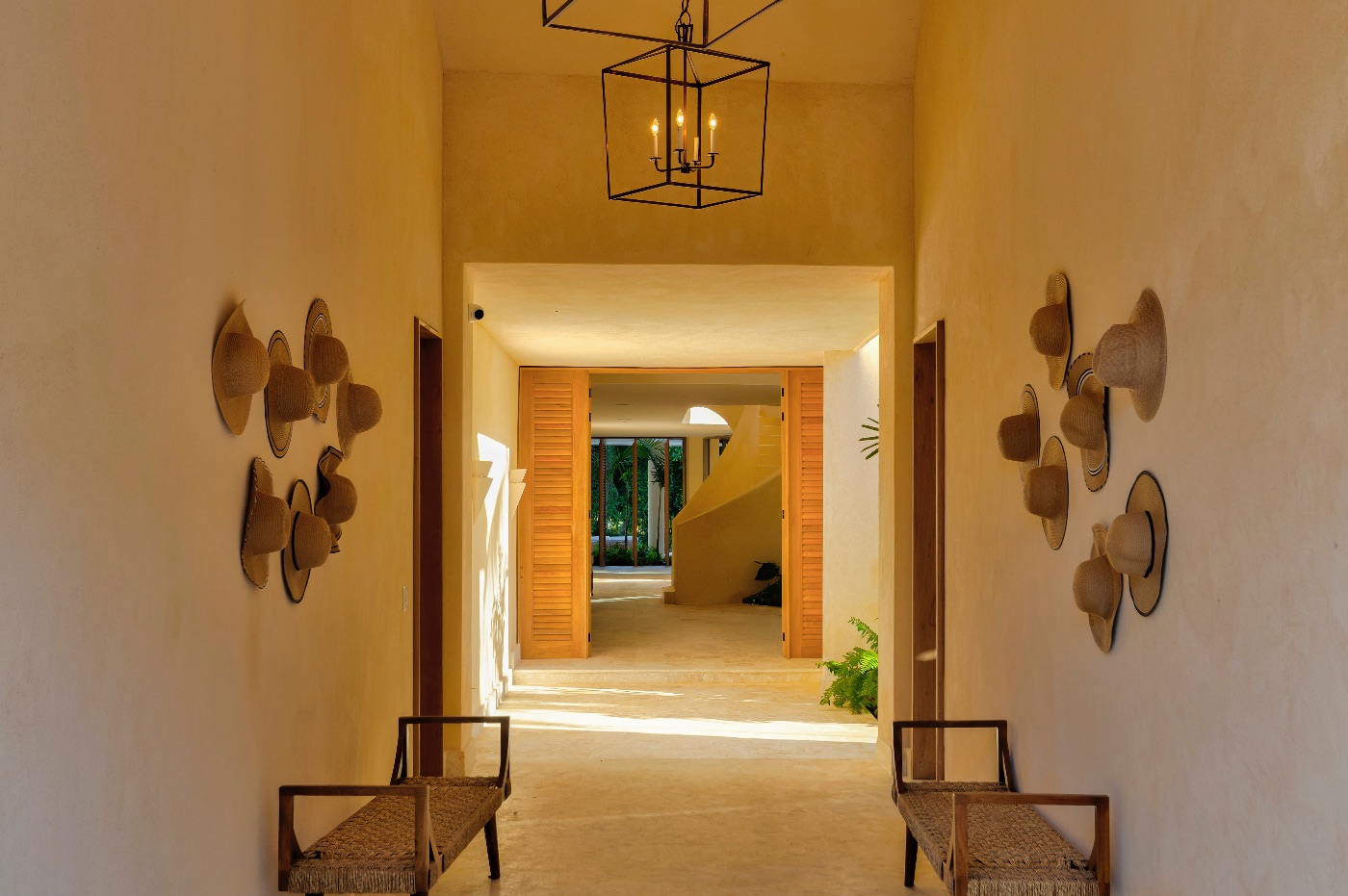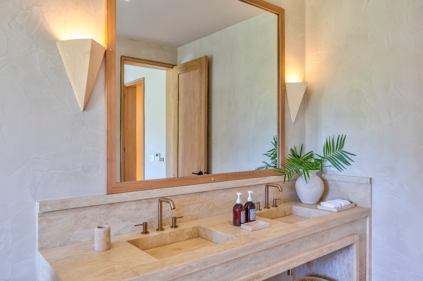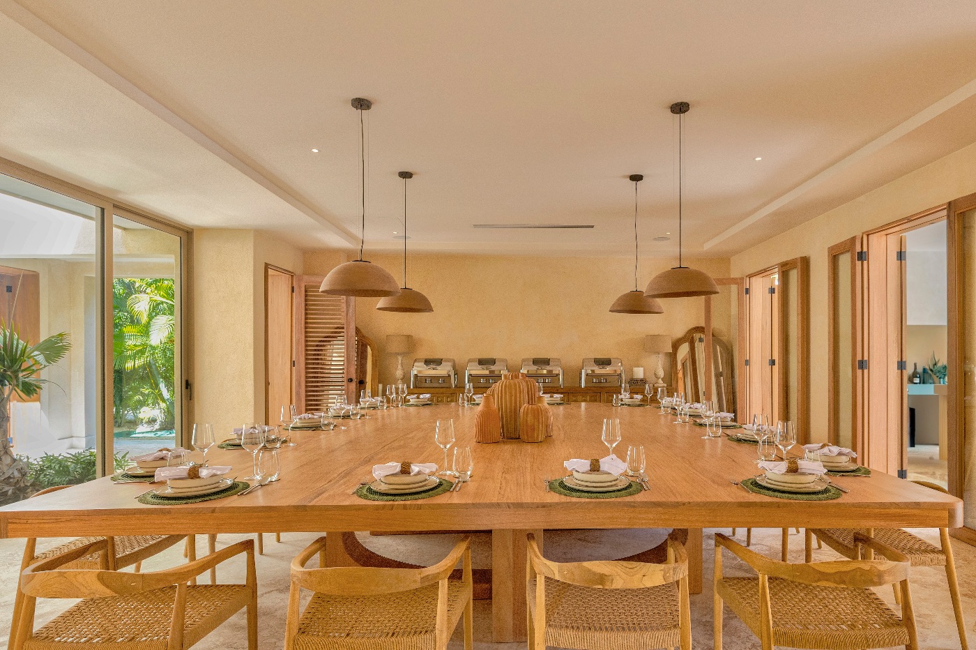 Sliding doors that blur the line between the living areas and the garden, lofty ceilings that breathe, and carefully chosen pieces layered with natural woods and textiles create a calm yet elegant interior design. Here, flow is key. The main floor serves as a focal point for events with two king suites for convenient access, while the upstairs bedroom collection accommodates all possible configurations, including couples and cousins.
