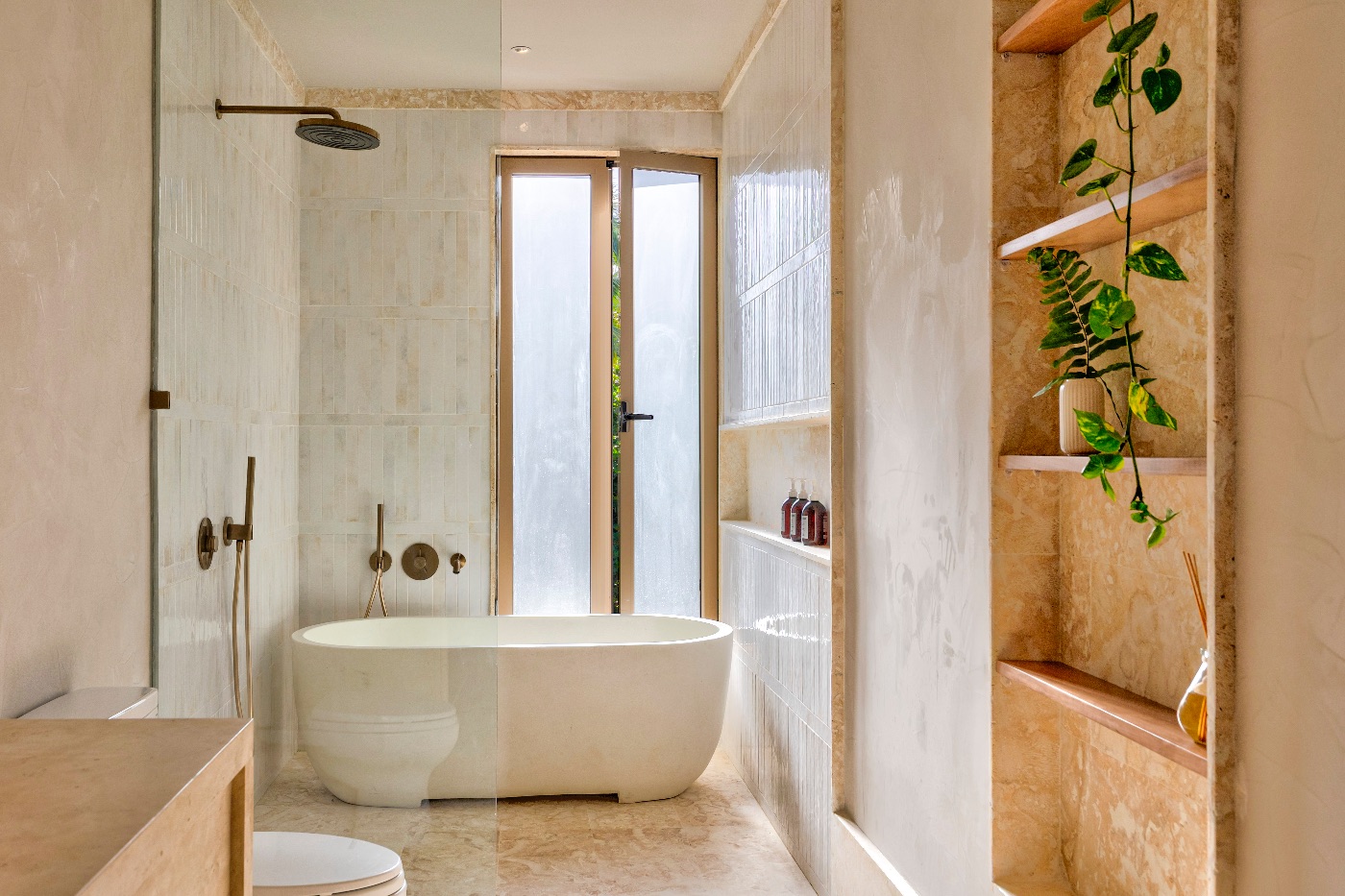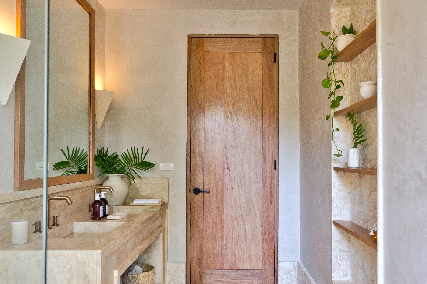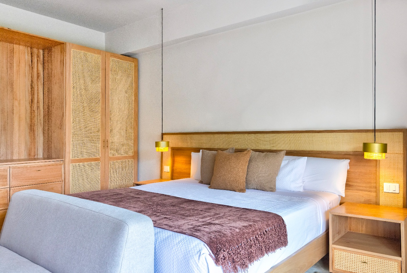 Sliding doors that blur the line between the living areas and the garden, lofty ceilings that breathe, and carefully chosen pieces layered with natural woods and textiles create a calm yet elegant interior design. Here, flow is key. The main floor serves as a focal point for events with two king suites for convenient access, while the upstairs bedroom collection accommodates all possible configurations, including couples and cousins.
