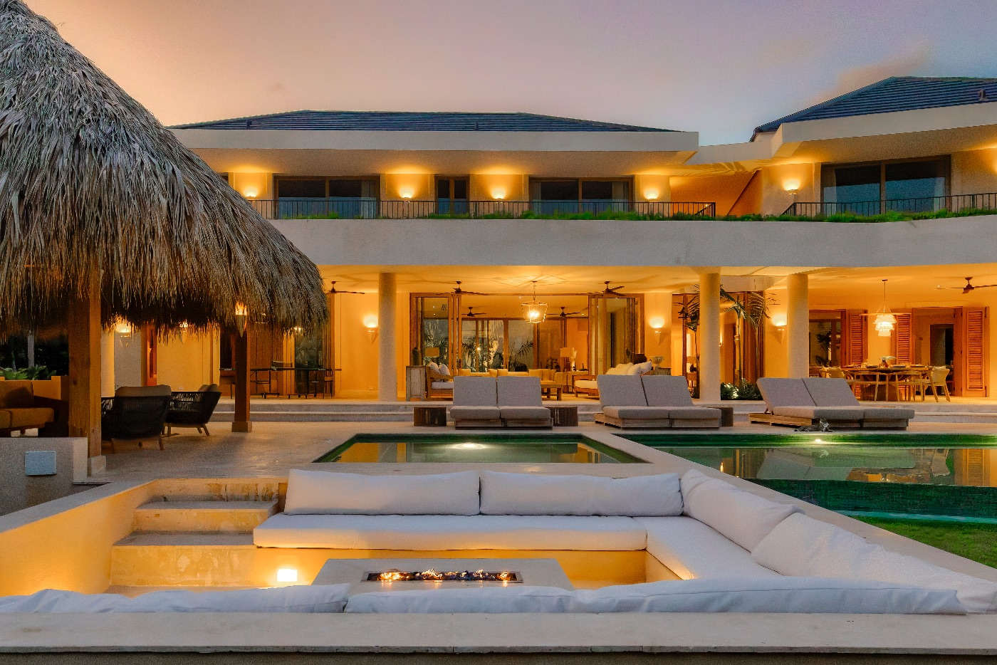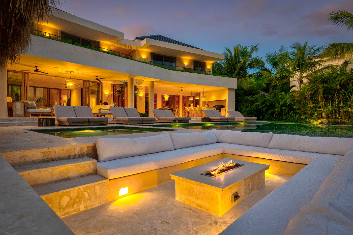 At night, the fire pit takes center stage, with stars overhead, palm silhouettes all around, and a house that has fulfilled your request by providing enough room for everyone to be together without ever feeling crowded.
