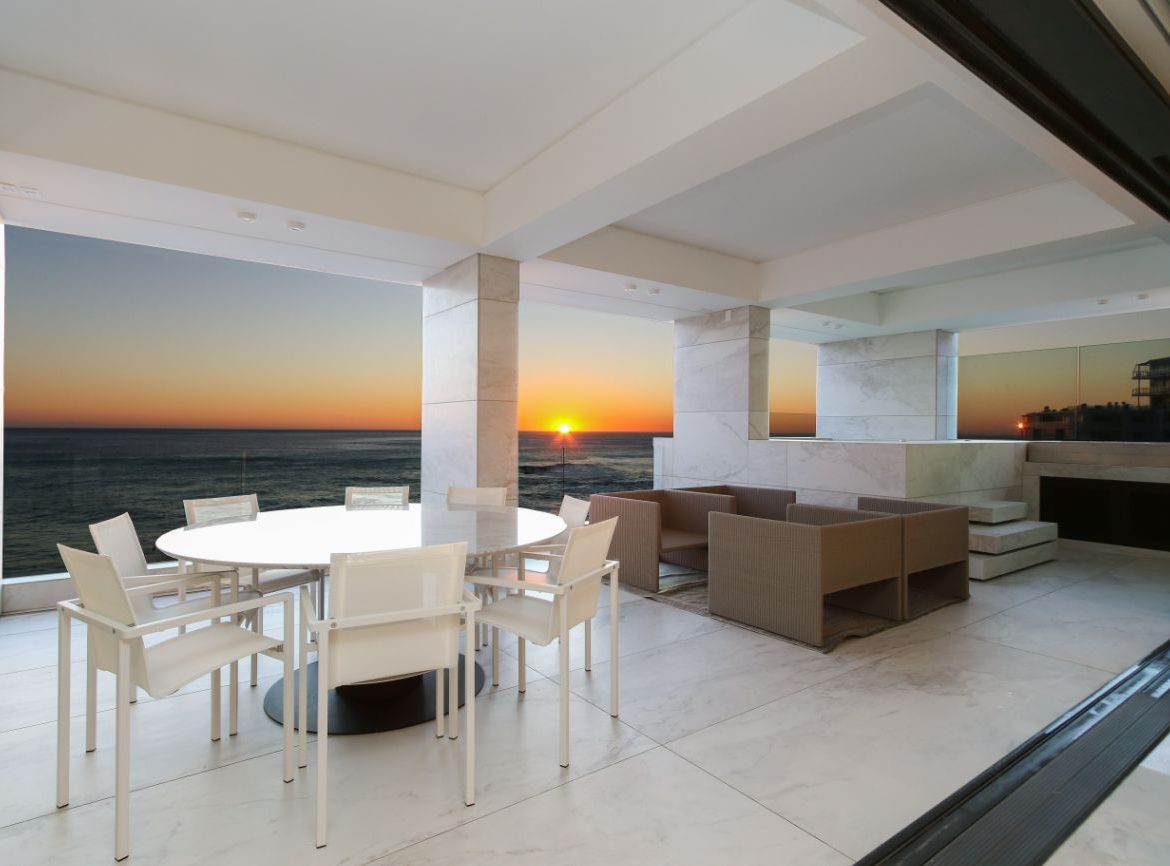 The soundscape, the constant hush of waves rising through glass-fronted rooms and slipping under marble thresholds, becomes an integral part of the architecture as soon as you walk in. Between sunrise and sunset, you can recall why Cape Town’s wind-sheltered Bantry Bay has long been the city’s most sought-after location. Sunrise finds the horizon washed in pale gold, and evening draws a line of fire across the ocean. The villa offers front-row intimacy with the coast without ever sacrificing privacy, just a short distance from the water and just a short drive from the Sea Point cafés and Clifton beaches.