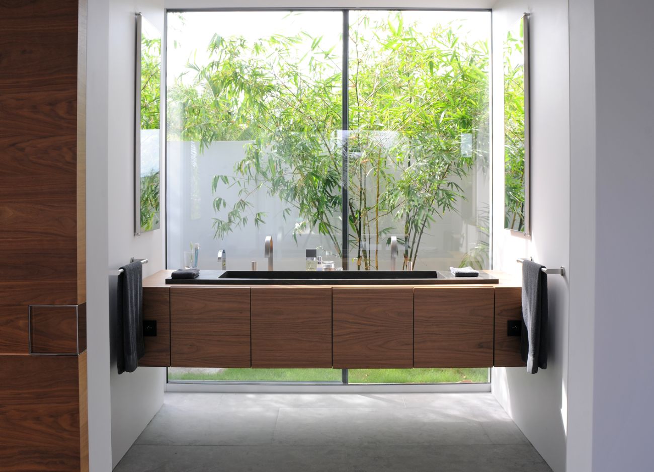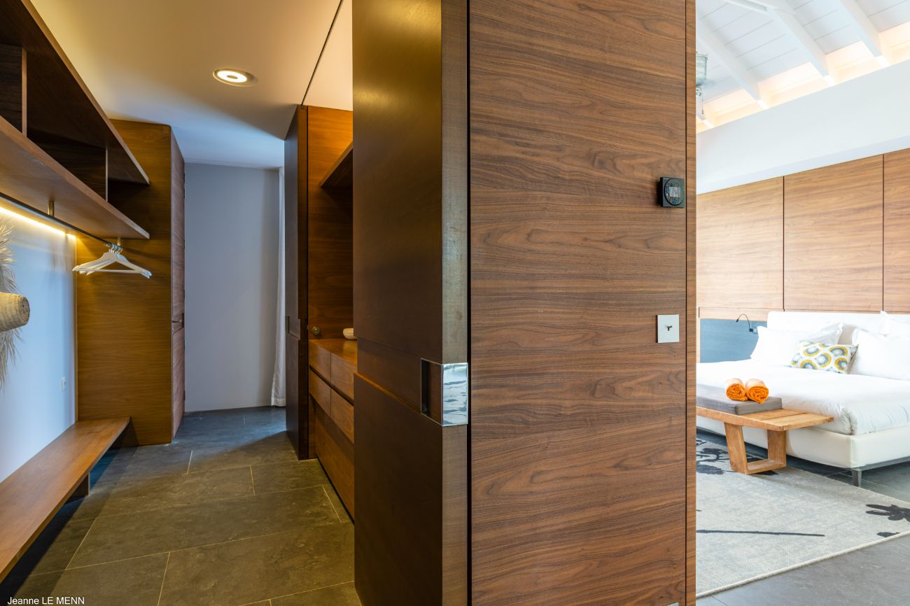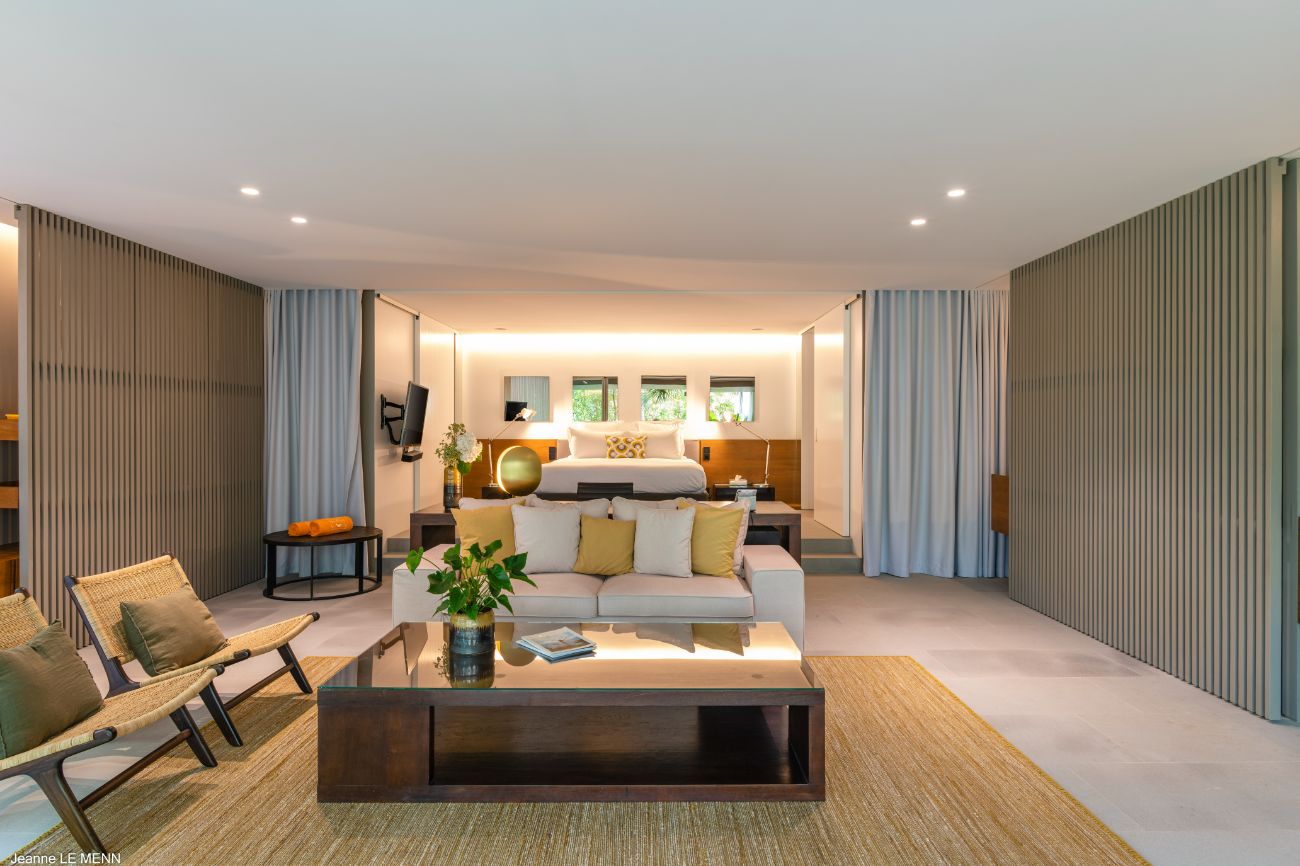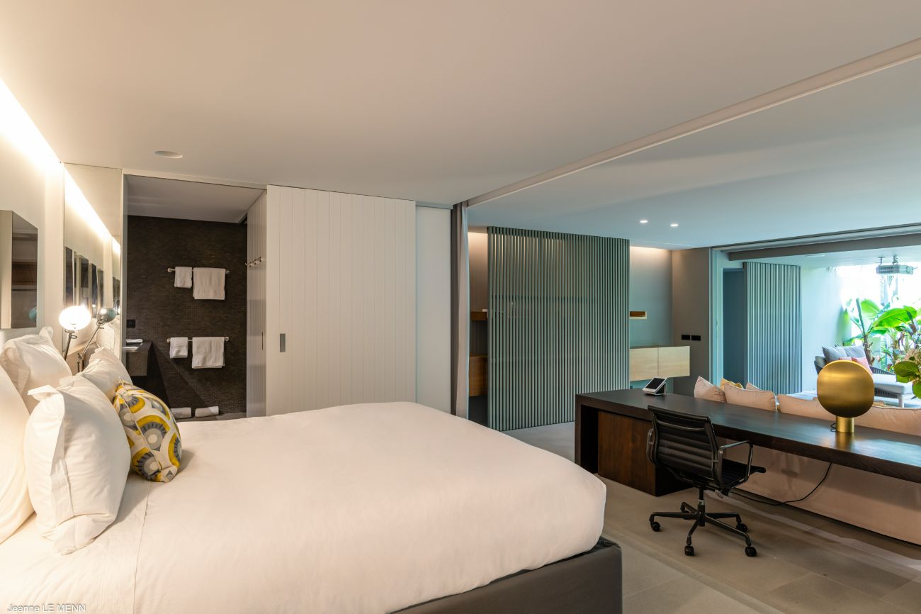 One suite leads to a private terrace and garden, a peaceful retreat perfect for reading in the evening or having coffee in the morning. The other two maintain a close and constant connection to nature by enjoying their own private terraces. The color scheme is consistent throughout the four suites; thoughtful storage, luxurious bedding, and silent climate control guarantee restful, undisturbed sleep.