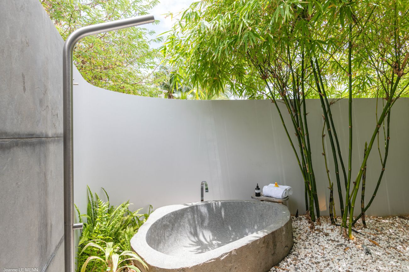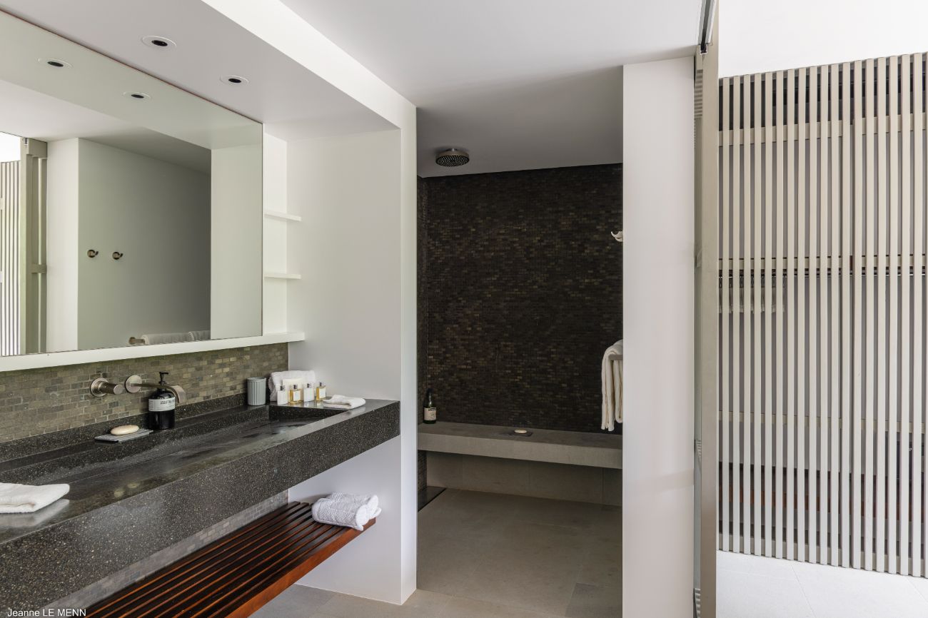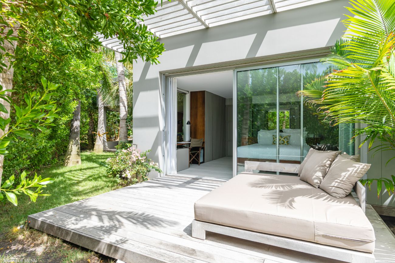 The experience is enhanced by the details. Perfect for friendly tournaments before dinner, a pétanque court adds a fun and authentically French touch. Circulation is effortless thanks to the indoor-outdoor flow of the layout: breakfast at the bar, a swim in the heated pool, a nap on the shaded lounge, a twilight barbecue in the garden lounge, and then returning to the terrace to watch the stars come out over the ocean. The elegant yet understated design language of Villa Bakea emphasizes the island’s genuine pleasures—light, breeze, view, and time—through the use of high-quality materials and a muted color scheme.