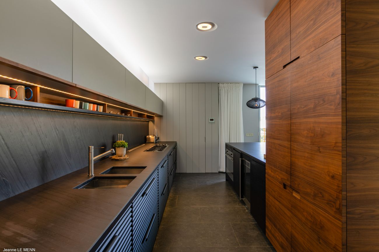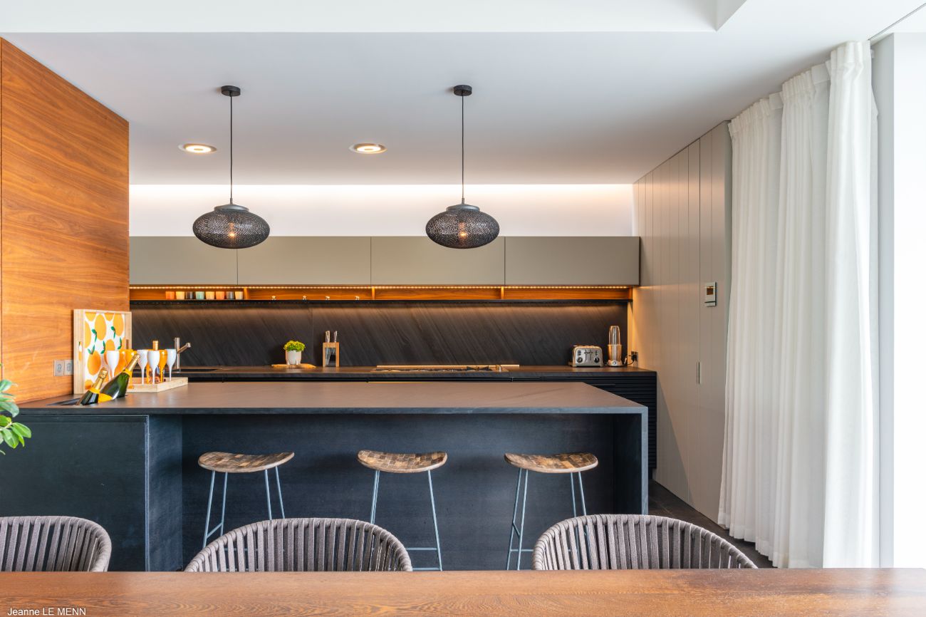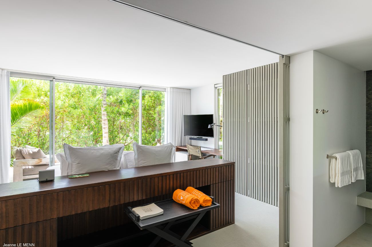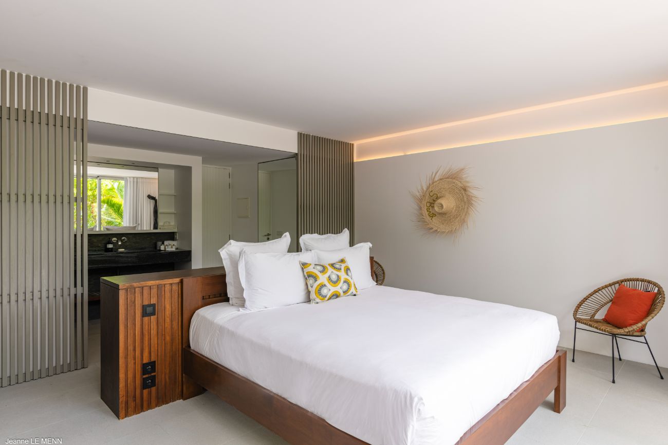 The experience is enhanced by the details. Perfect for friendly tournaments before dinner, a pétanque court adds a fun and authentically French touch. Circulation is effortless thanks to the indoor-outdoor flow of the layout: breakfast at the bar, a swim in the heated pool, a nap on the shaded lounge, a twilight barbecue in the garden lounge, and then returning to the terrace to watch the stars come out over the ocean. The elegant yet understated design language of Villa Bakea emphasizes the island’s genuine pleasures—light, breeze, view, and time—through the use of high-quality materials and a muted color scheme.