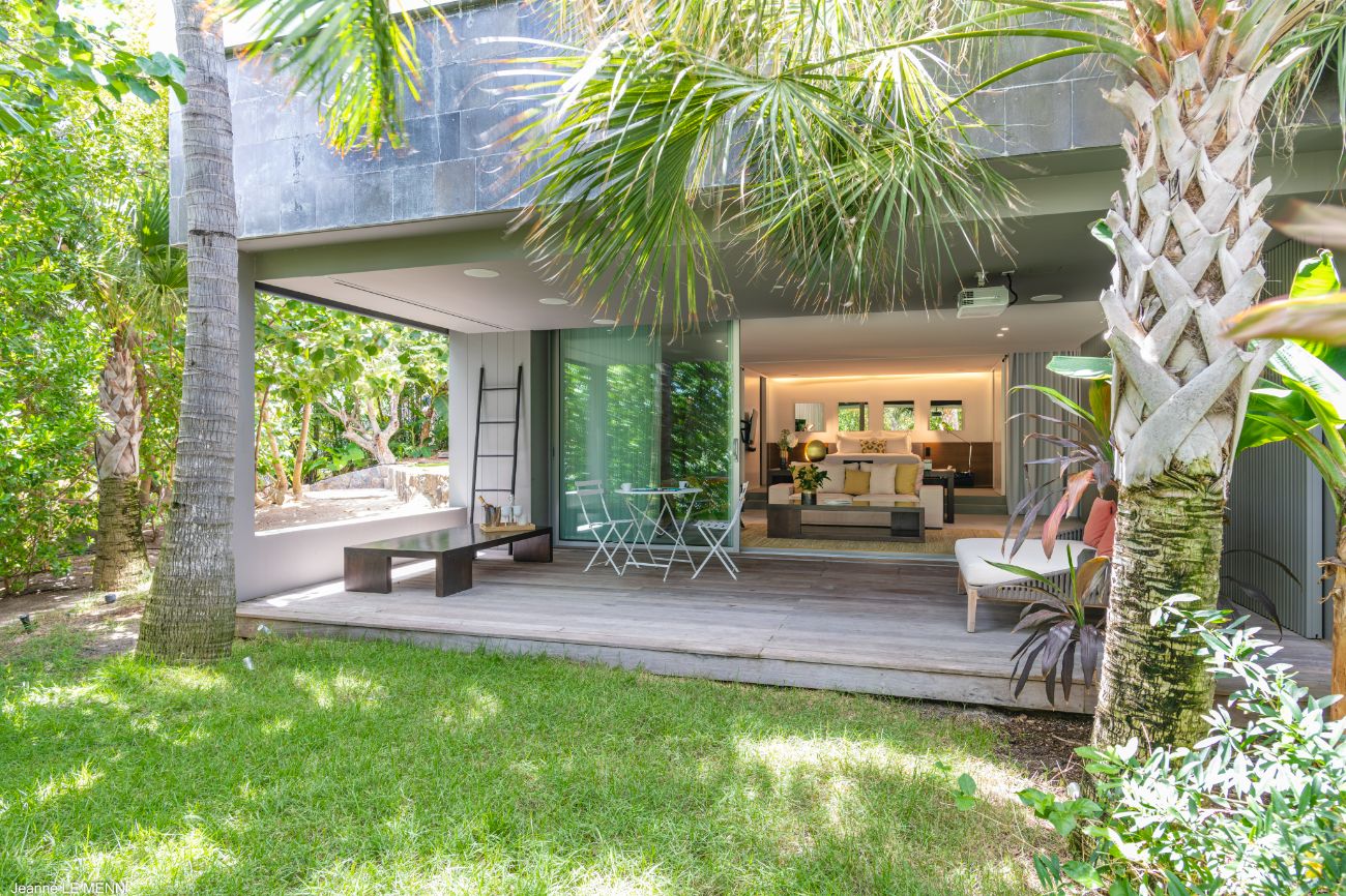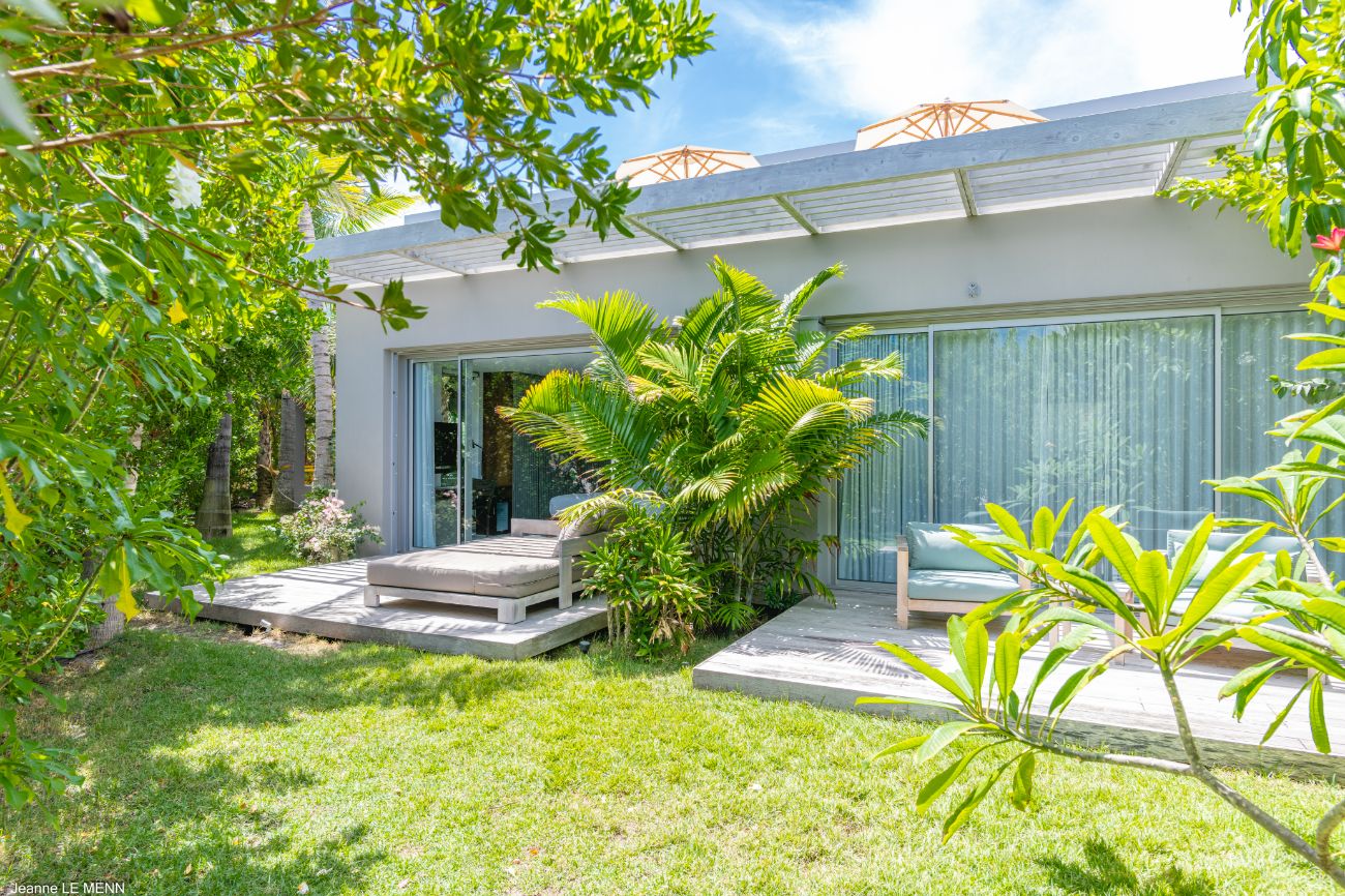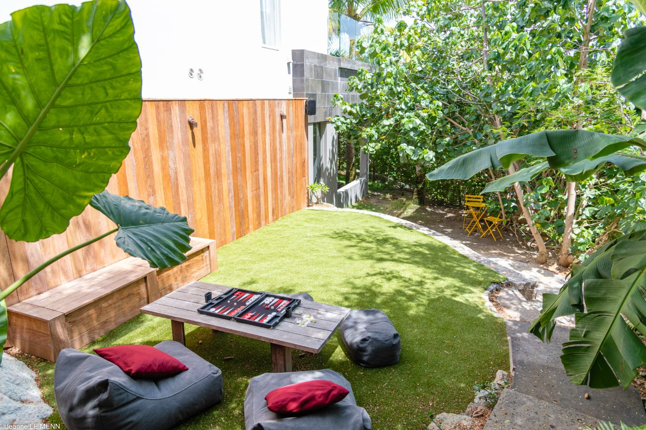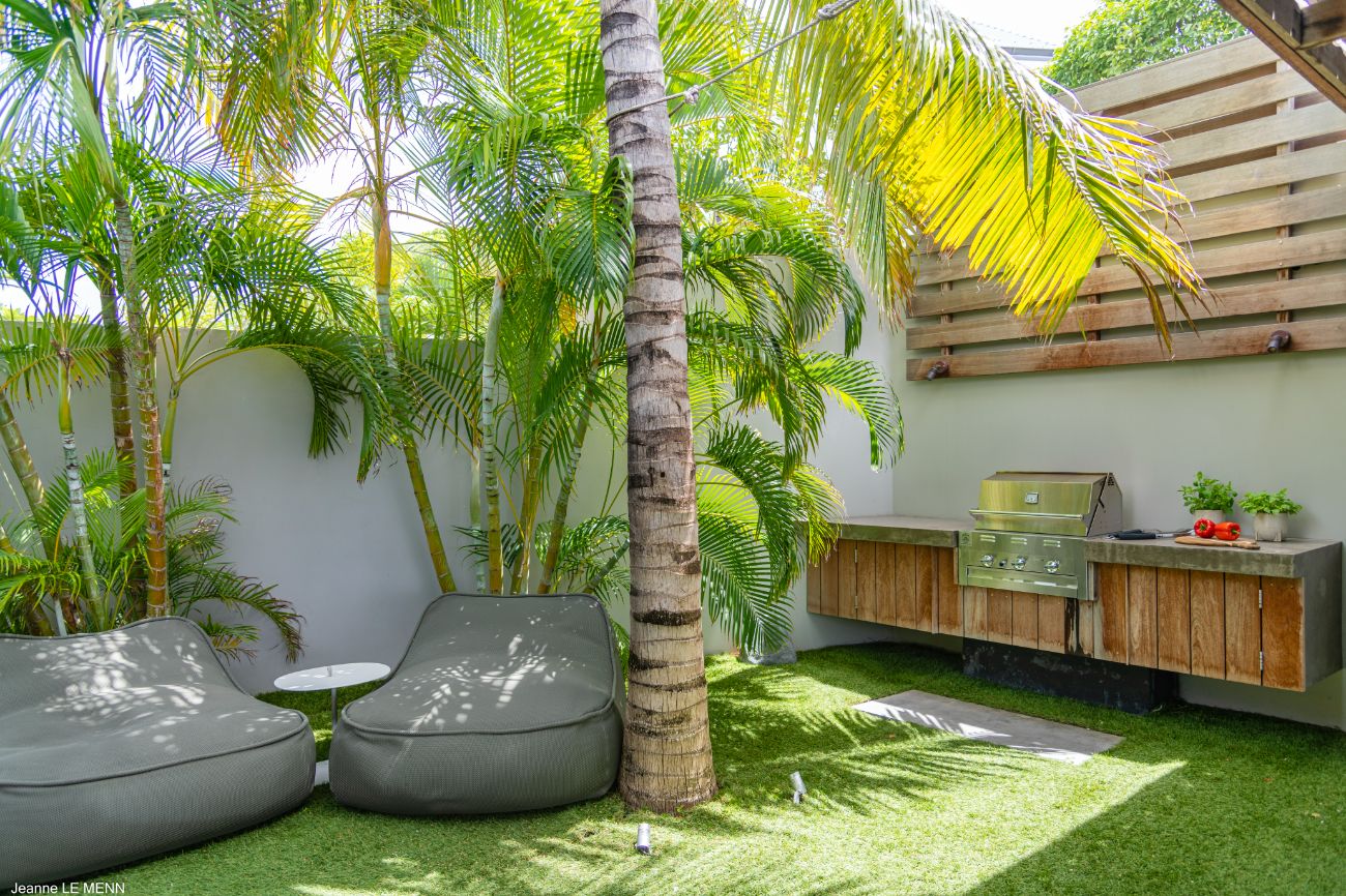 If you want more seclusion, head to the second alfresco area at the back of the villa, which is an outdoor living room on a plush lawn with wide built-in benches surrounded by low tables and covered in sun-drenched orange cushions. This quiet corner is anchored by a barbecue, allowing a night of barefoot grilling to take place while trade winds and palm trees provide the background music. **Lush vegetation—local shrubs, flowering greens, and palms—**envelops the house in a revitalizing silence wherever you look.