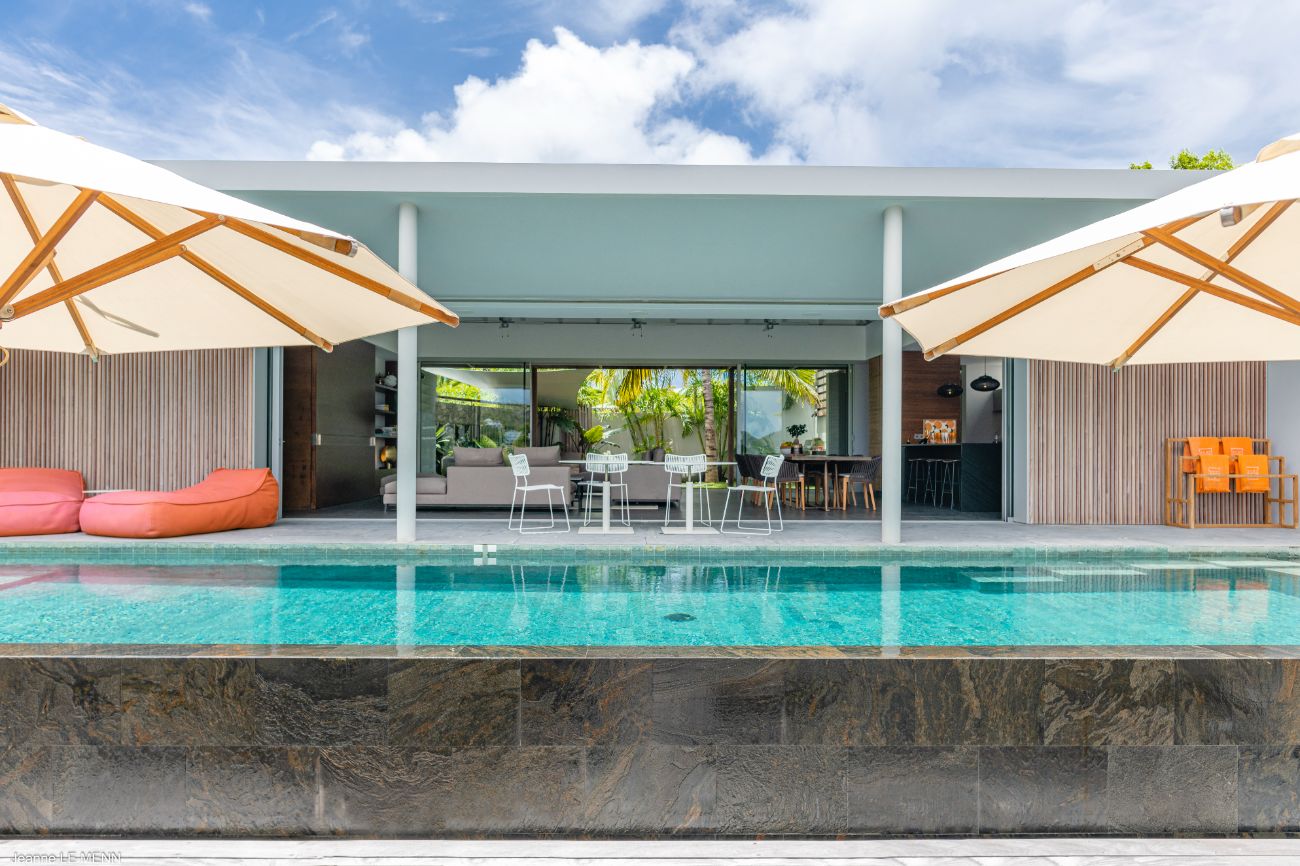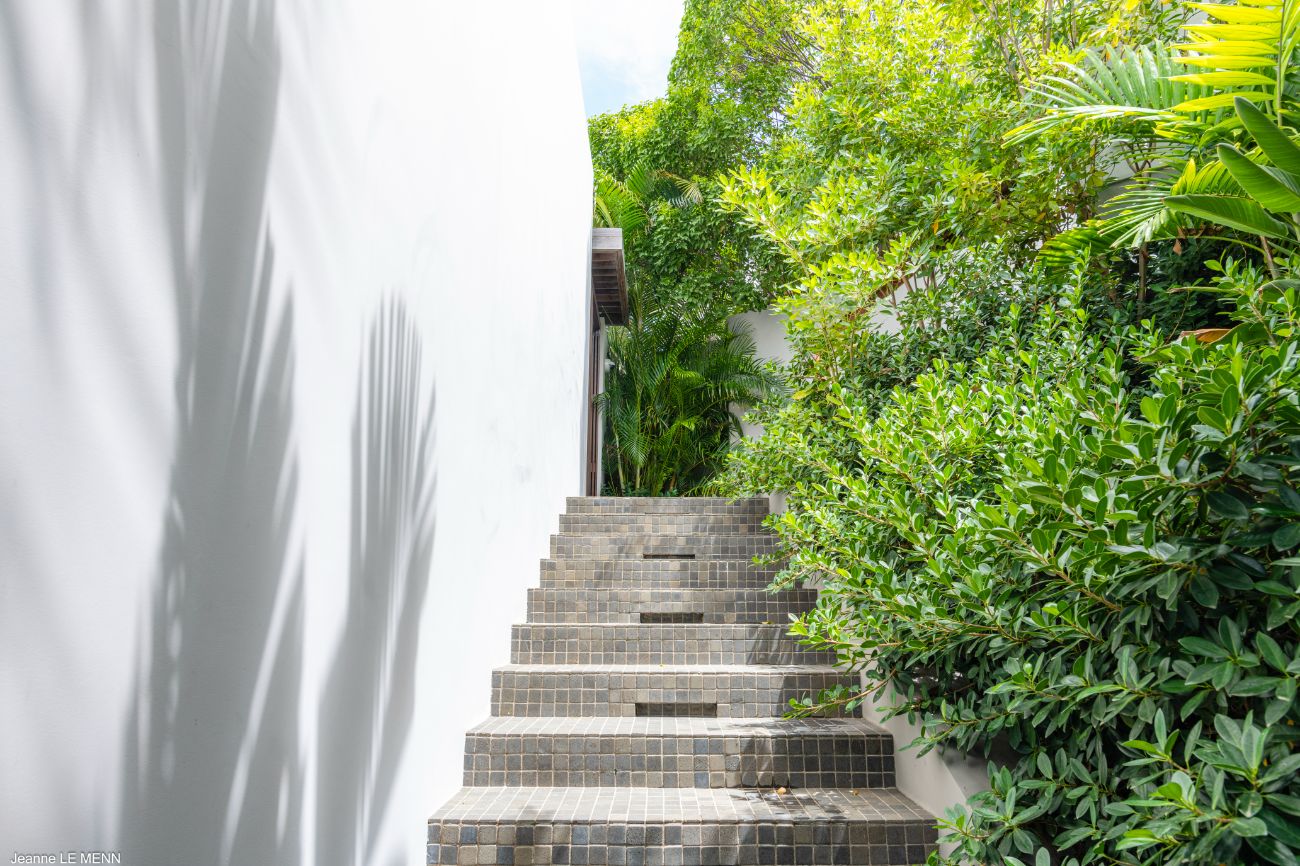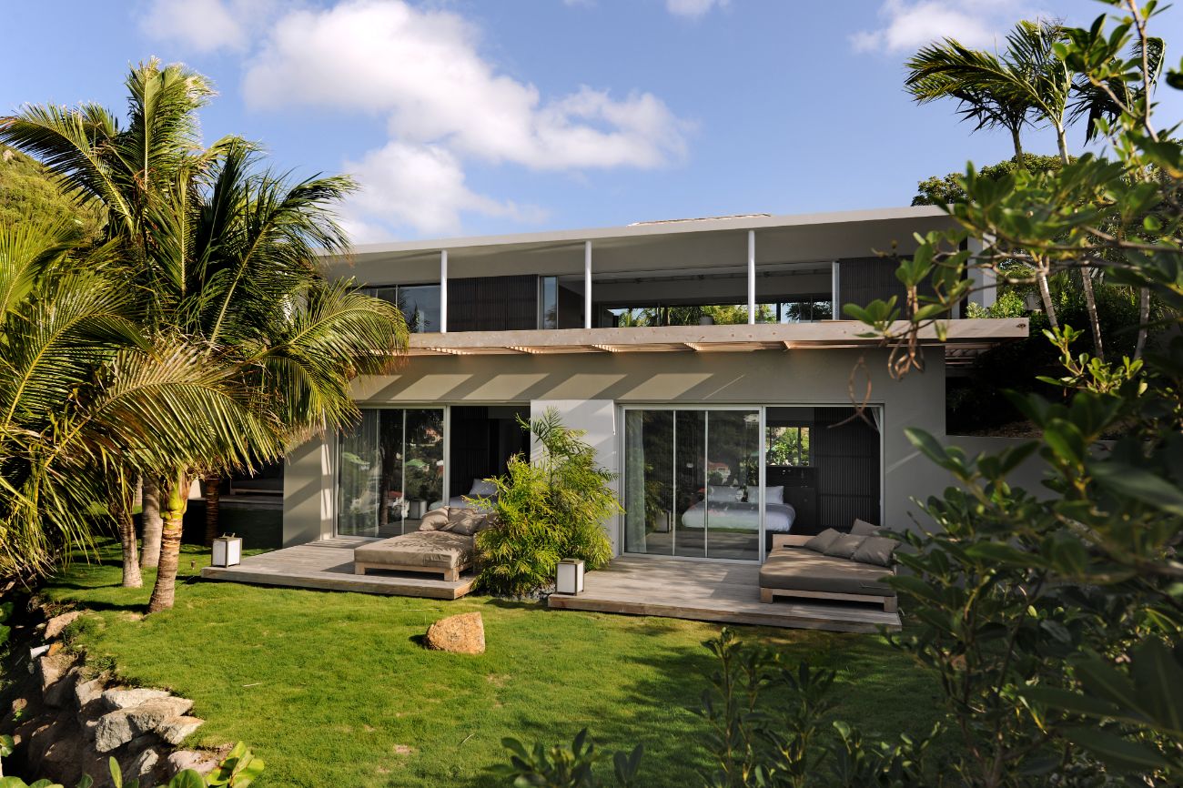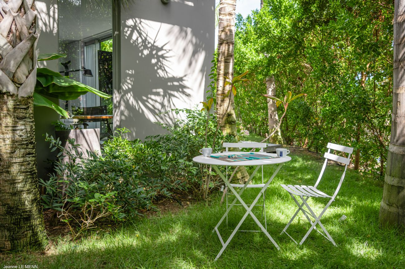 If you want more seclusion, head to the second alfresco area at the back of the villa, which is an outdoor living room on a plush lawn with wide built-in benches surrounded by low tables and covered in sun-drenched orange cushions. This quiet corner is anchored by a barbecue, allowing a night of barefoot grilling to take place while trade winds and palm trees provide the background music. **Lush vegetation—local shrubs, flowering greens, and palms—**envelops the house in a revitalizing silence wherever you look.