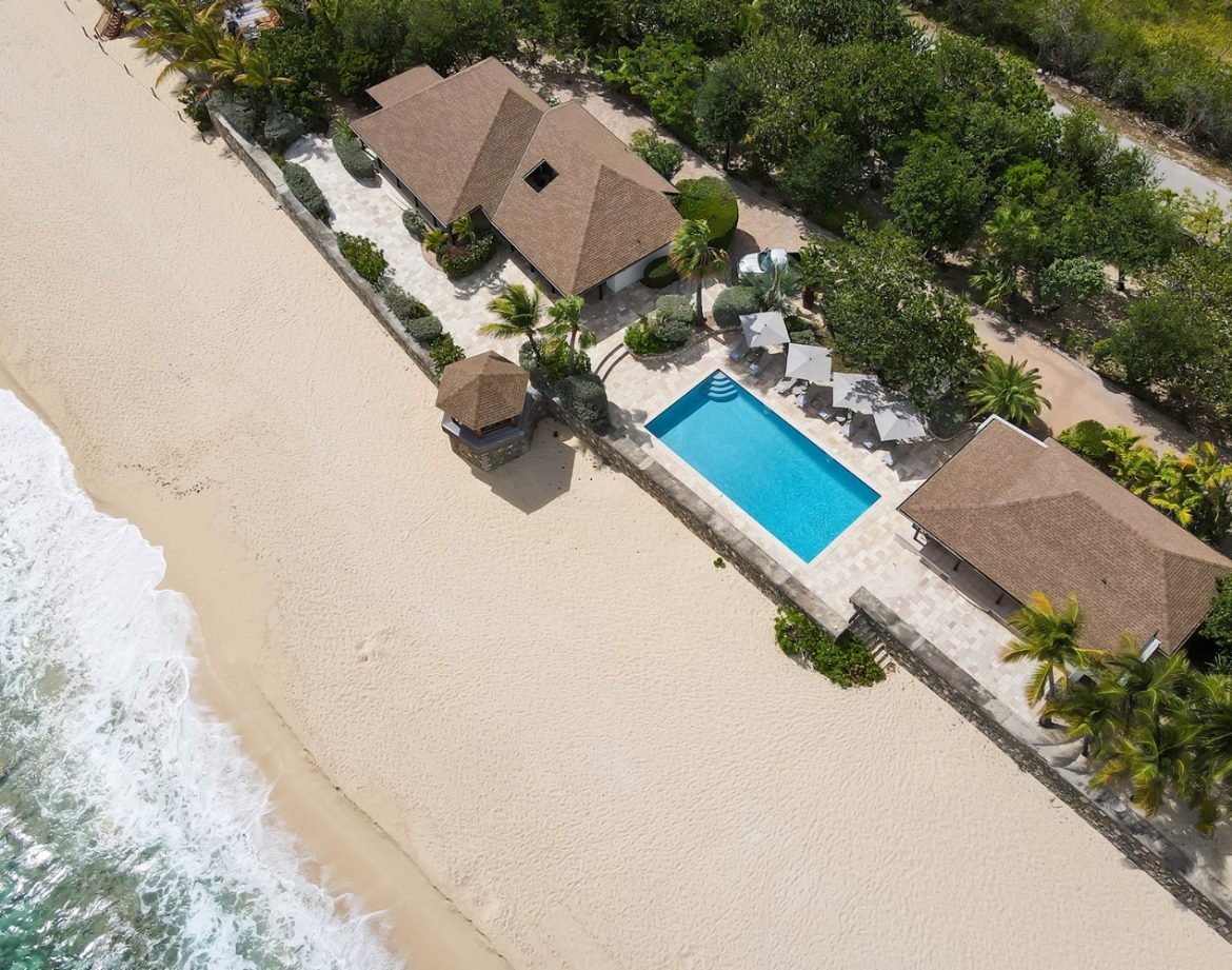 You will enjoy listening to the surf rolling in from oceanfront living areas with a pool, rows of loungers in the sun, a gas barbecue and from the shaded alfresco dining area. Inside the glass wall doors and large windows connect the outdoor, filling the open-plan great room with warm ocean breezes. Laid-back wicker chairs in the sitting area continue the easygoing vibe, as does a pass-through to an al-fresco bar in the fully equipped kitchen. There are two suites off the great room and two in a separate pavilion at the other end of the pool terrace perfect for a private fee. All four suites have en-suite bathrooms.