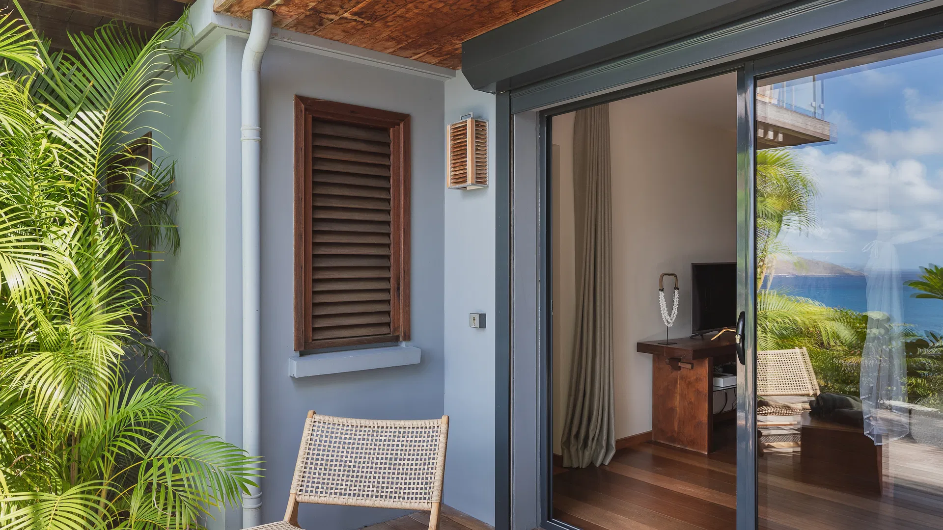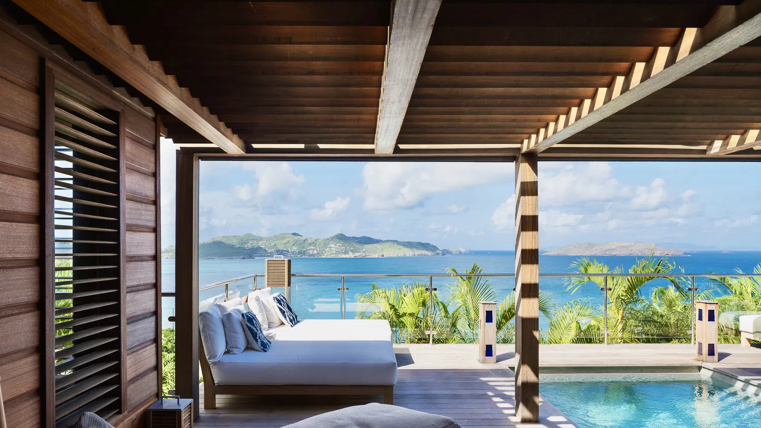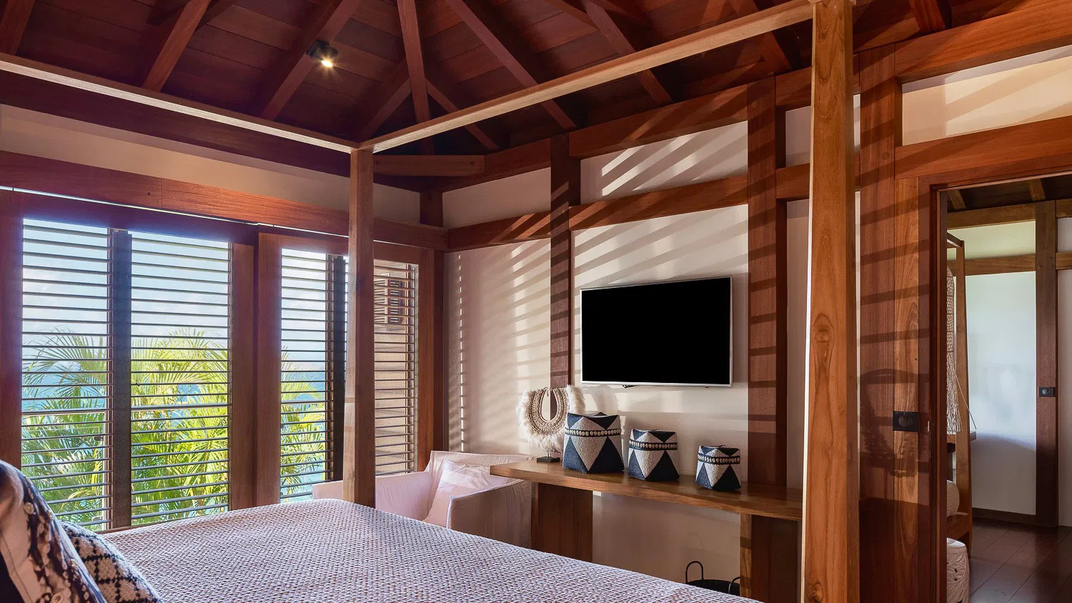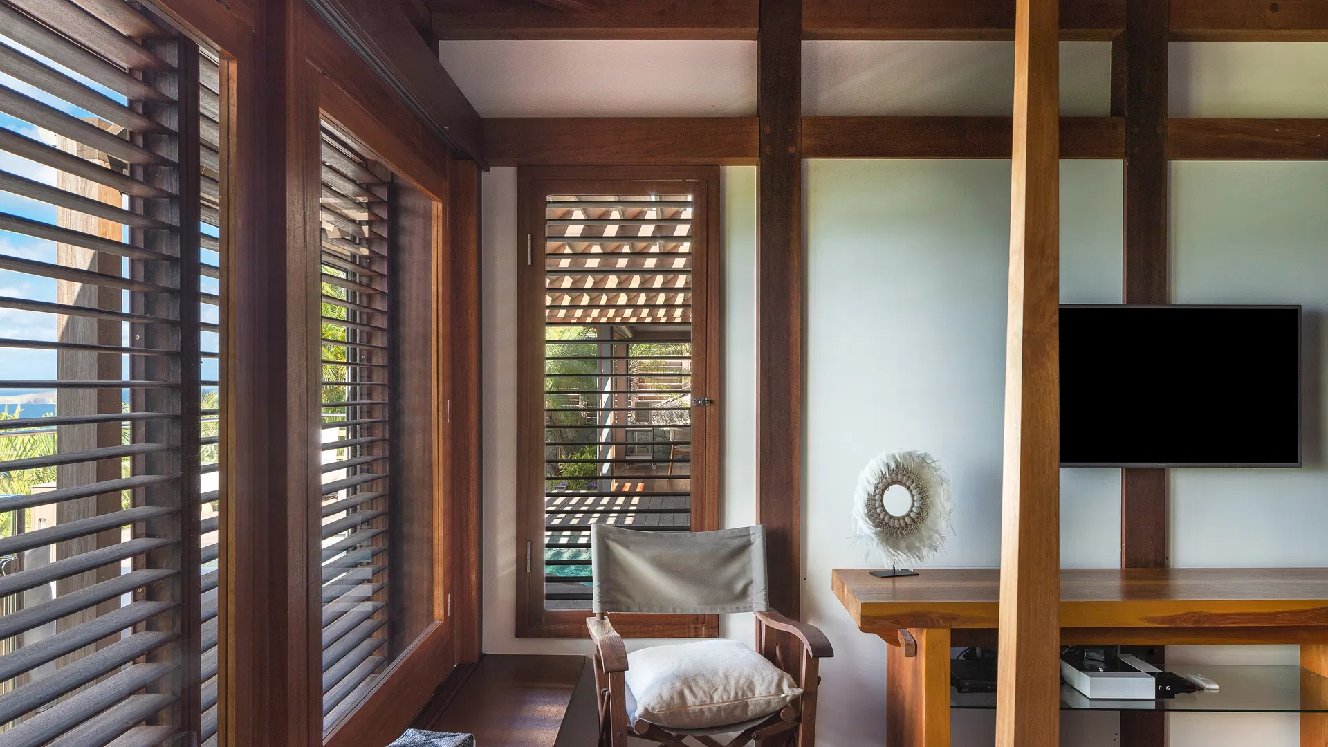 At the heart of the villa lies its most striking feature: a semi-indoor heated swimming pool that blurs the line between interior and exterior living. Framed by lounge seating, palm trees, and gentle island breezes, this unique space becomes a peaceful sanctuary throughout the day—whether for a refreshing swim or quiet moments of relaxation.
