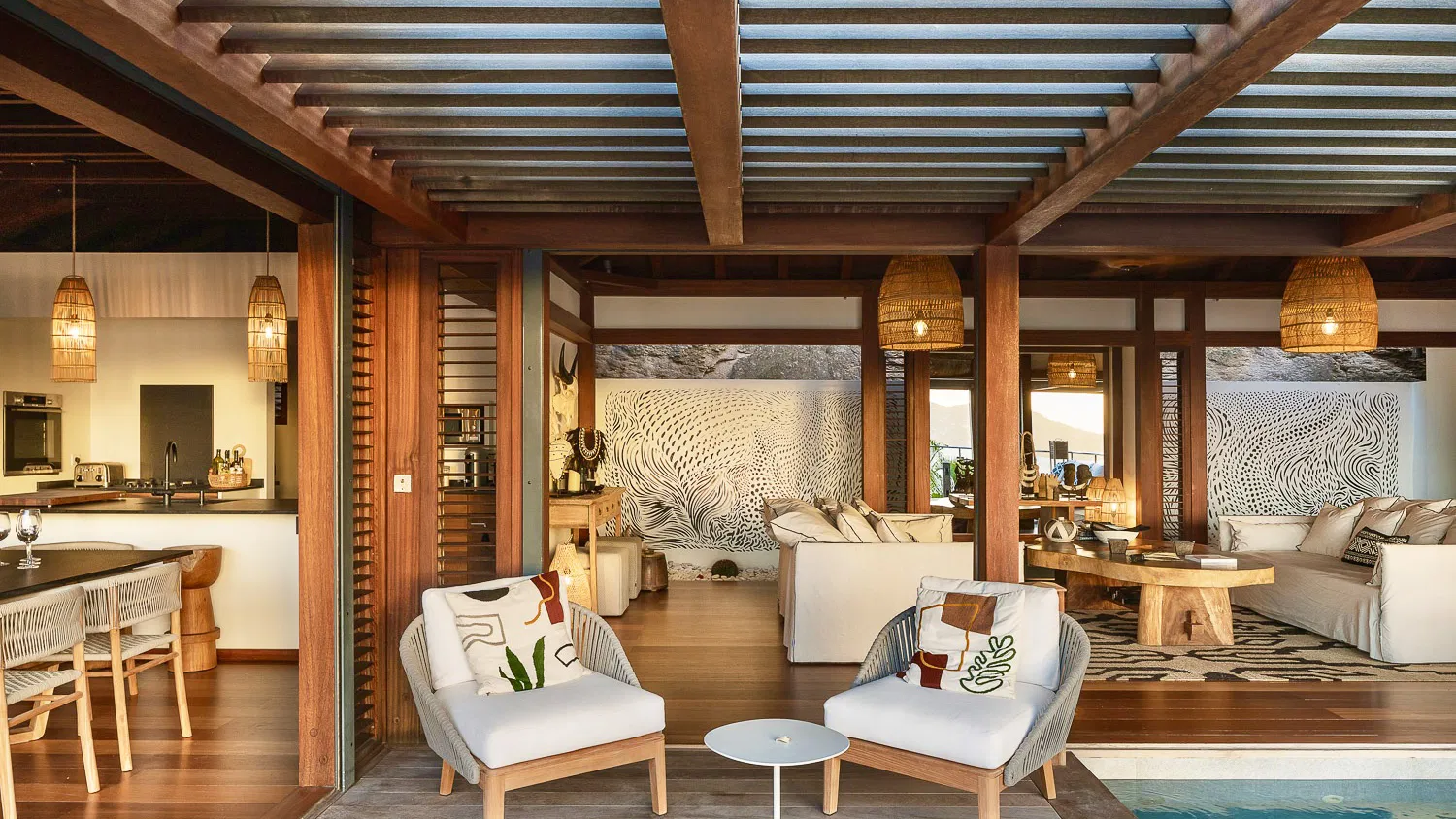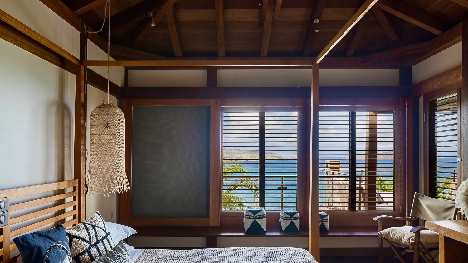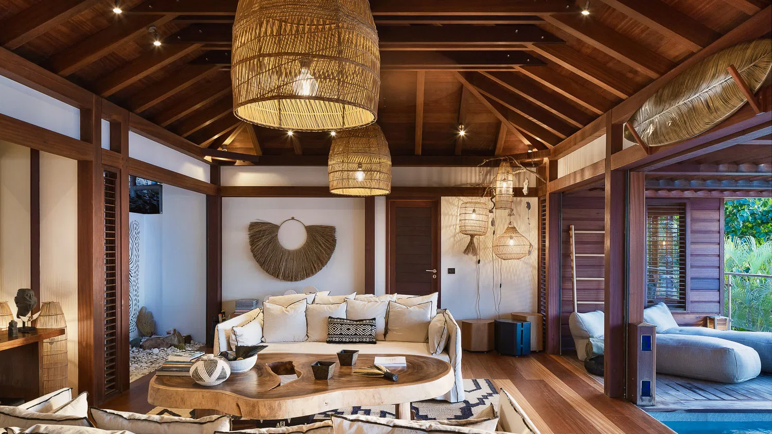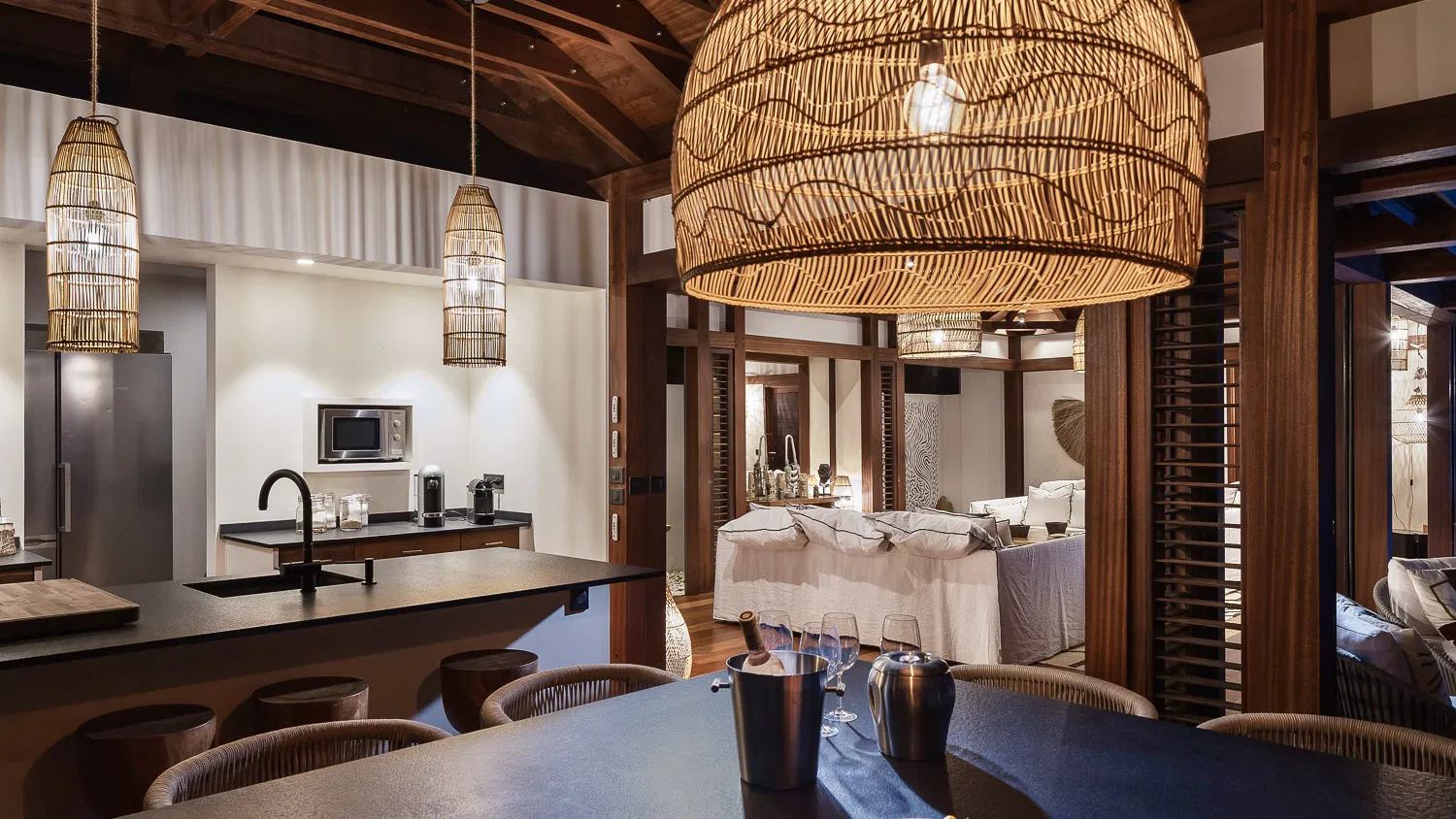 Inspired by Balinese aesthetics, the interiors are warm, textural, and inviting—featuring natural wood finishes, woven details, and soft, ambient lighting. The main living space opens entirely to the outdoors, where the horizon stretches endlessly across the bay, creating a setting that feels both intimate and expansive.