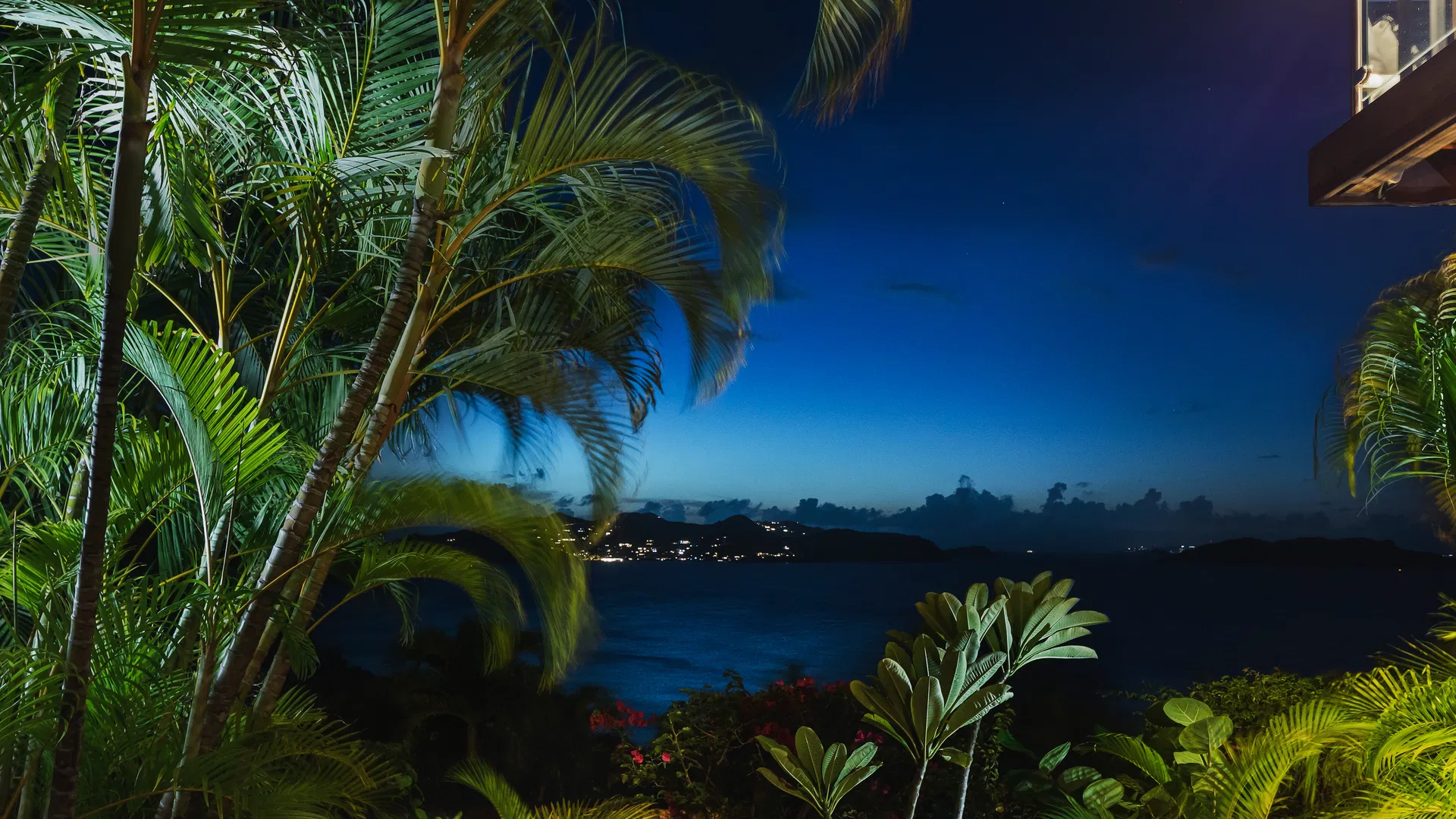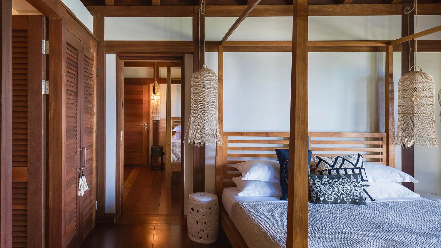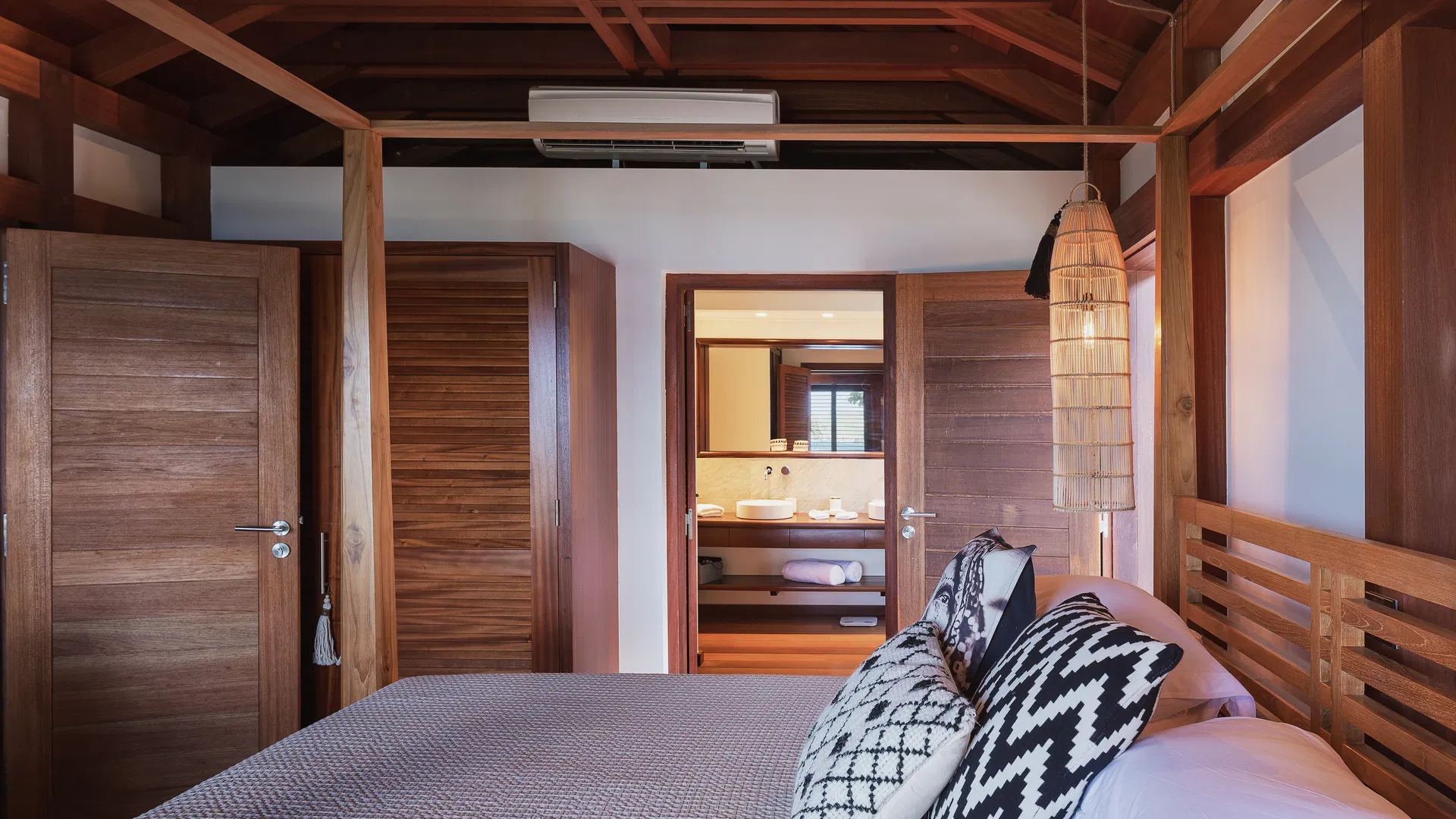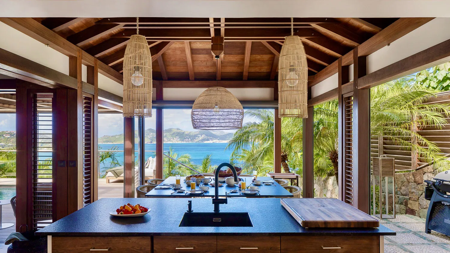 Inspired by Balinese aesthetics, the interiors are warm, textural, and inviting—featuring natural wood finishes, woven details, and soft, ambient lighting. The main living space opens entirely to the outdoors, where the horizon stretches endlessly across the bay, creating a setting that feels both intimate and expansive.