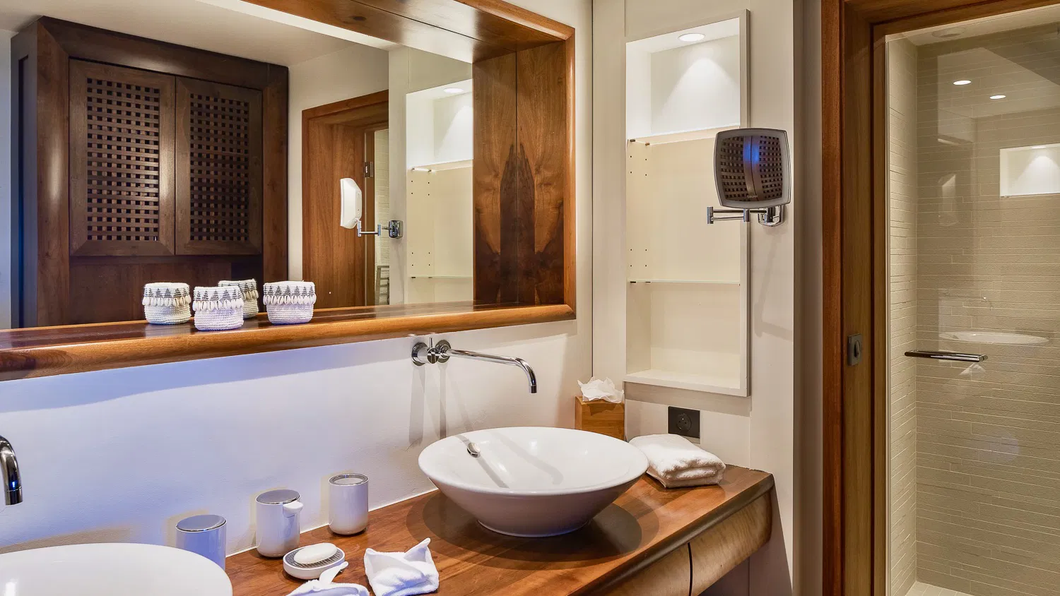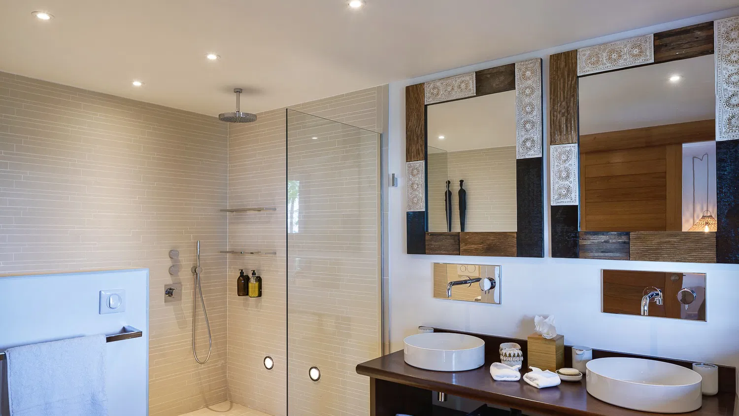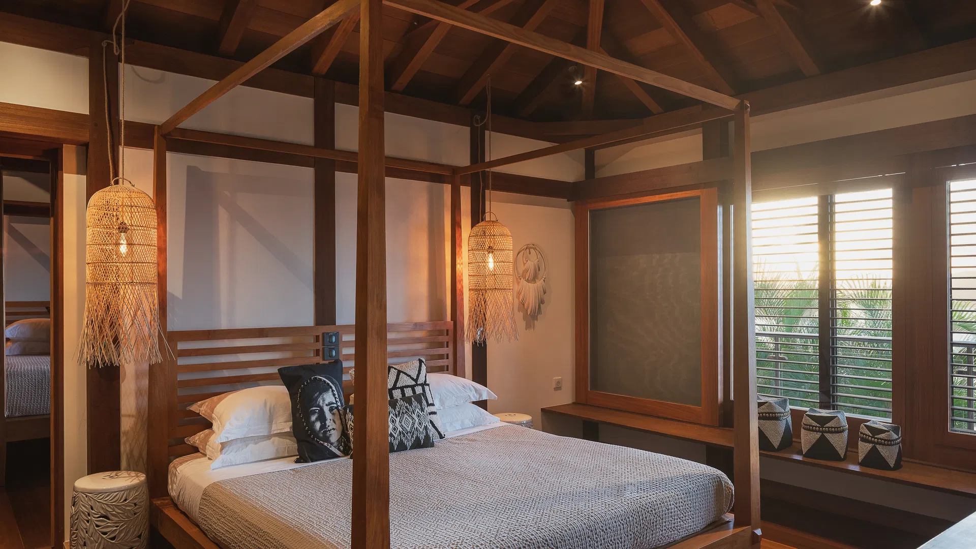Villa Coco Loco is designed across two levels and accommodates families or groups in four elegant bedrooms, each featuring king-size four-poster beds, en-suite bathrooms, and walk-in closets. Two bedrooms are located on the main level near the living areas, while two additional suites on the lower level offer enhanced privacy. One of the bathrooms features an outdoor shower, and two bedrooms can be interconnected—ideal for families traveling with children.