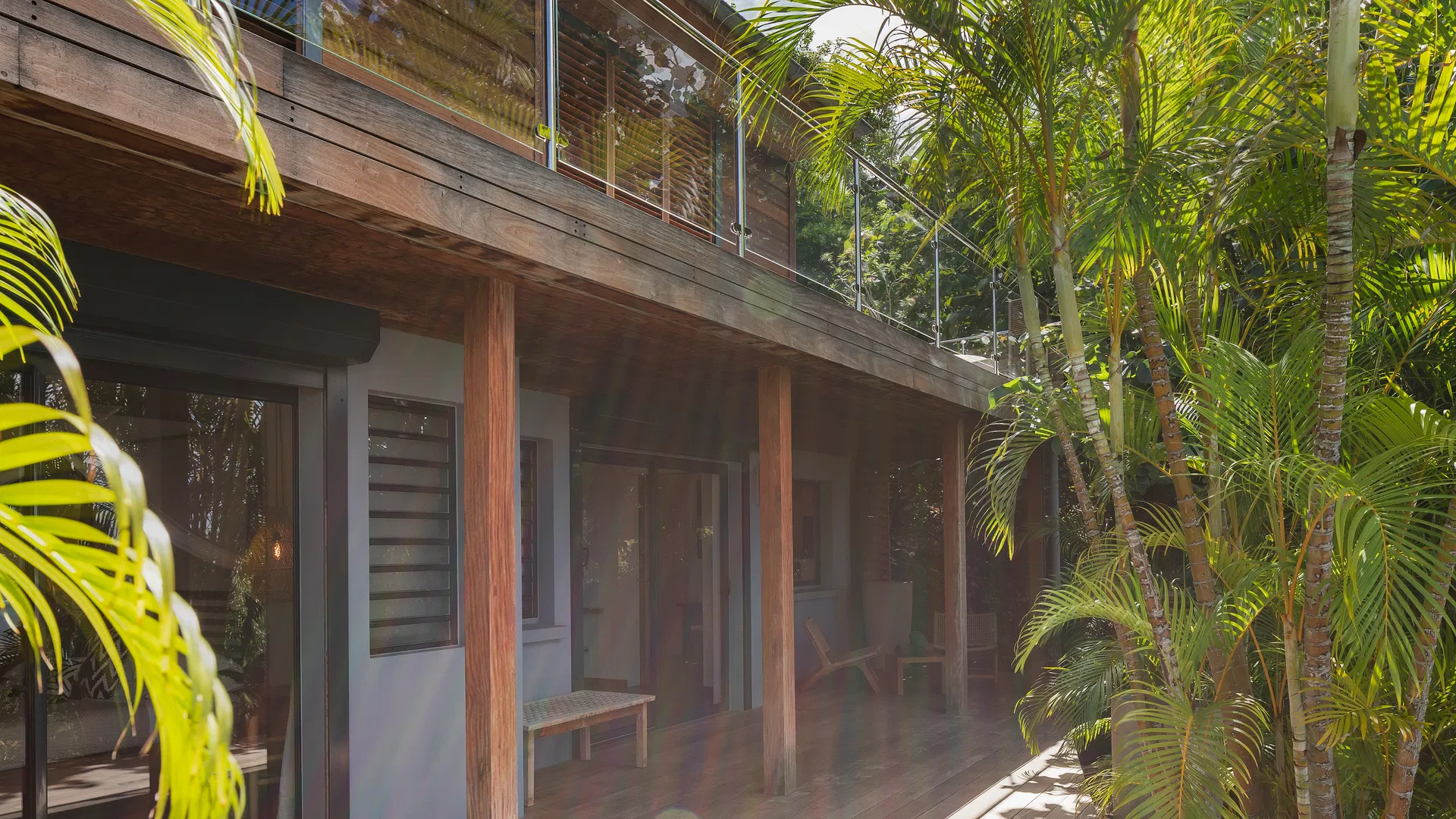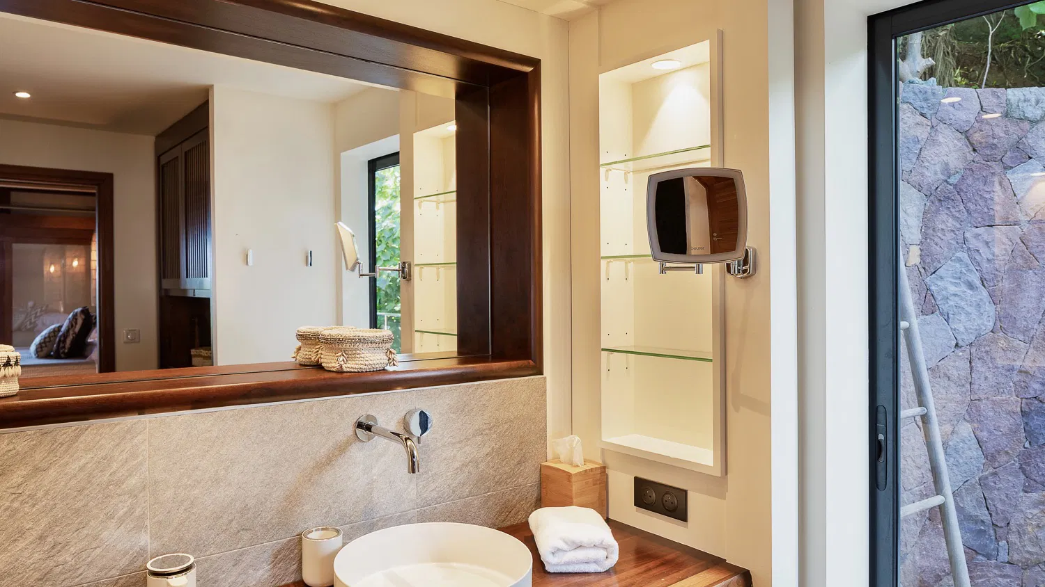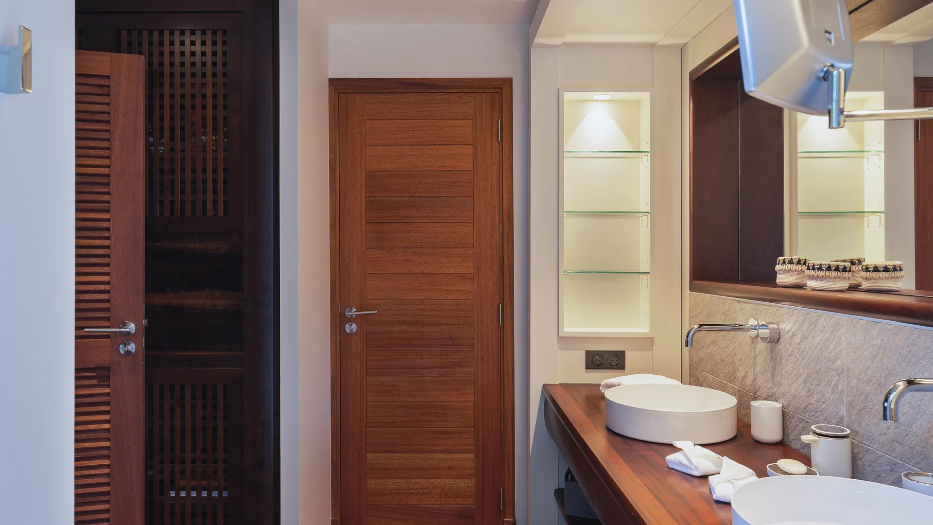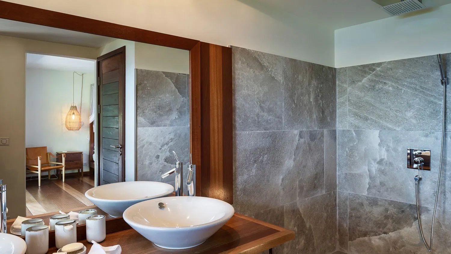Villa Coco Loco is designed across two levels and accommodates families or groups in four elegant bedrooms, each featuring king-size four-poster beds, en-suite bathrooms, and walk-in closets. Two bedrooms are located on the main level near the living areas, while two additional suites on the lower level offer enhanced privacy. One of the bathrooms features an outdoor shower, and two bedrooms can be interconnected—ideal for families traveling with children.