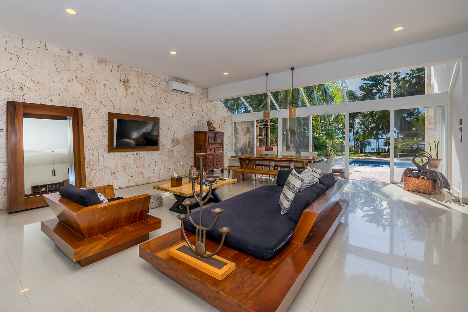 You wake to the slow hush of the Caribbean Mexico and the house answers with glass: every bedroom, every living room, every quiet corner faces the ocean so the water becomes part of your story. Villa Eden is a modern five-bedroom beachfront villa on Cozumel’s west coast that sleeps up to ten guests. Think stone walls softened by designer furnishings, wooden decks that hover above the water, and a rooftop garden built for sunsets and soft conversation. It’s intimate enough for a family and grand enough for a small celebration.