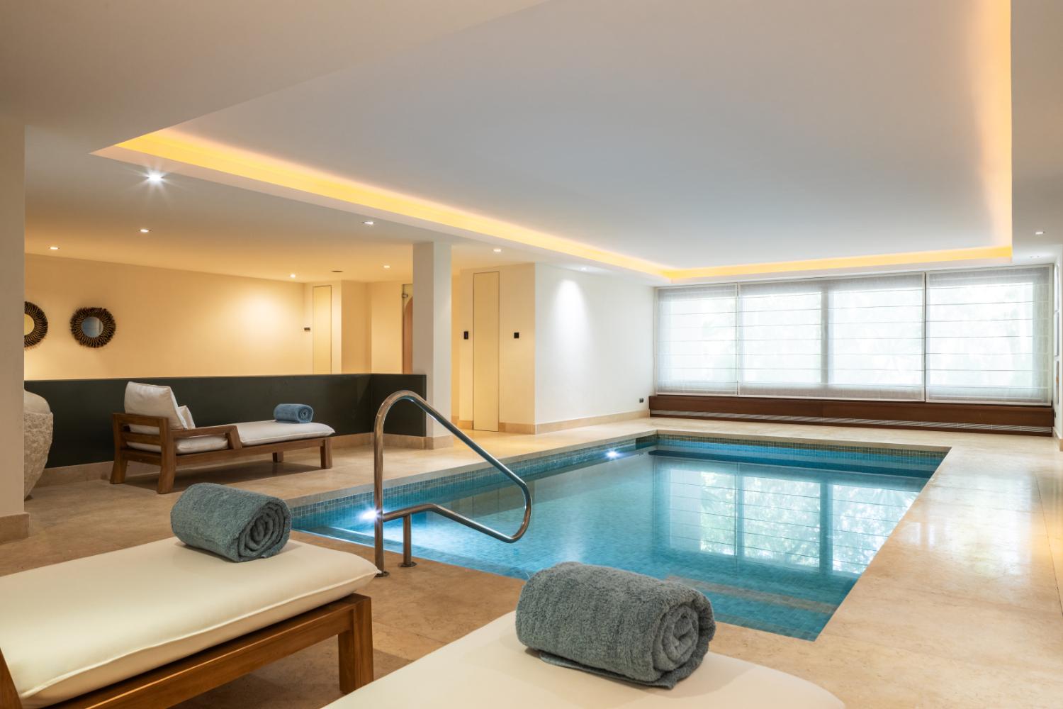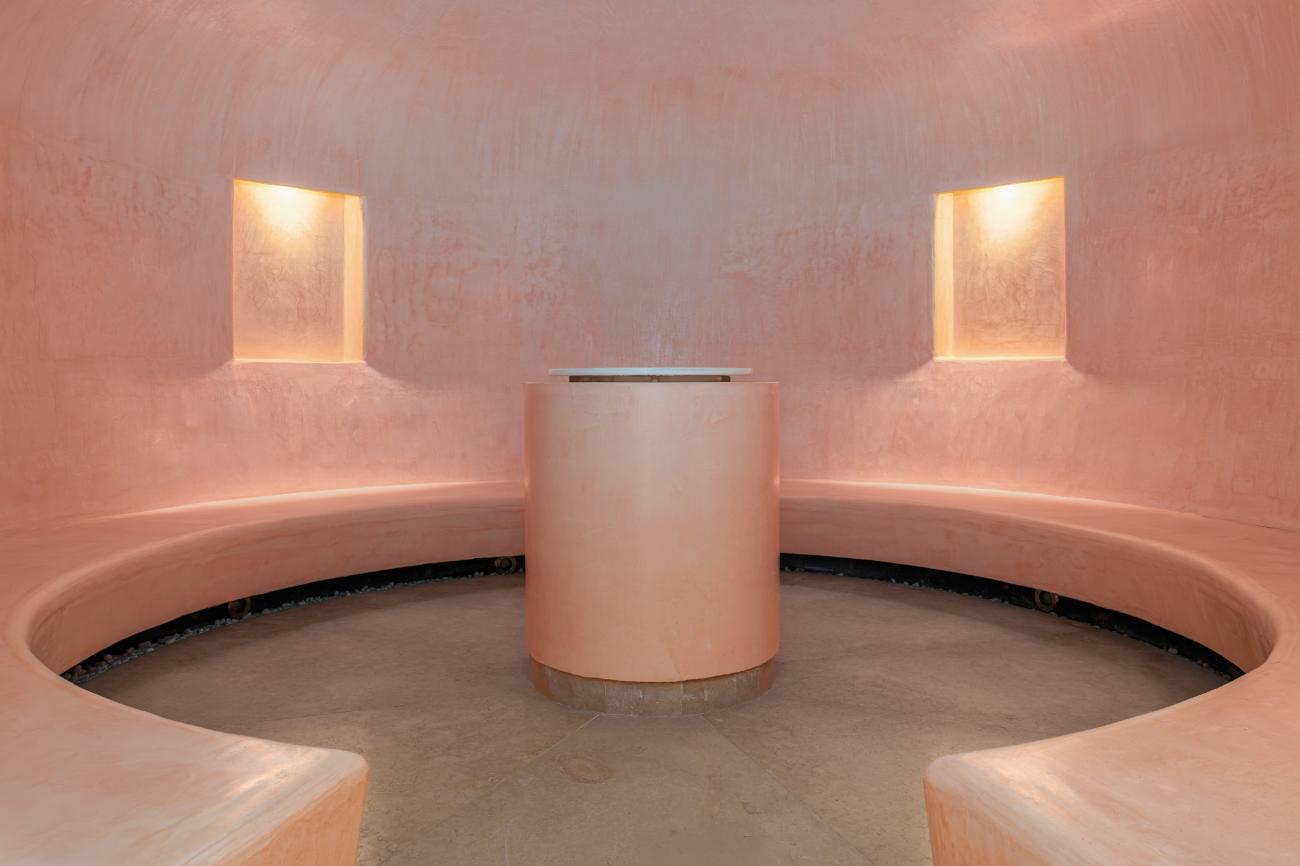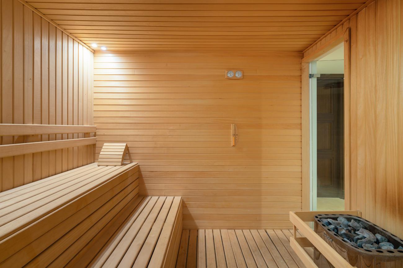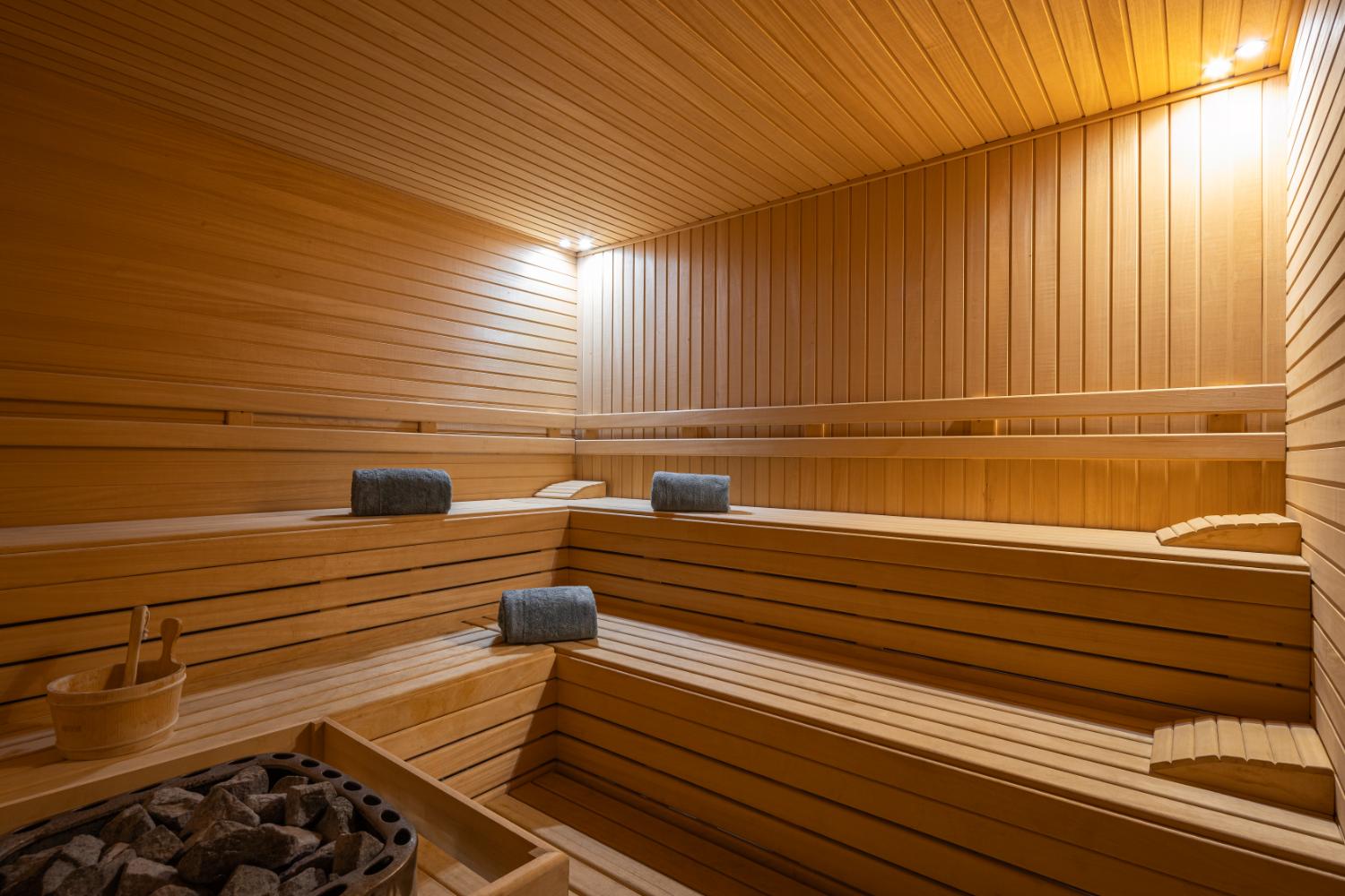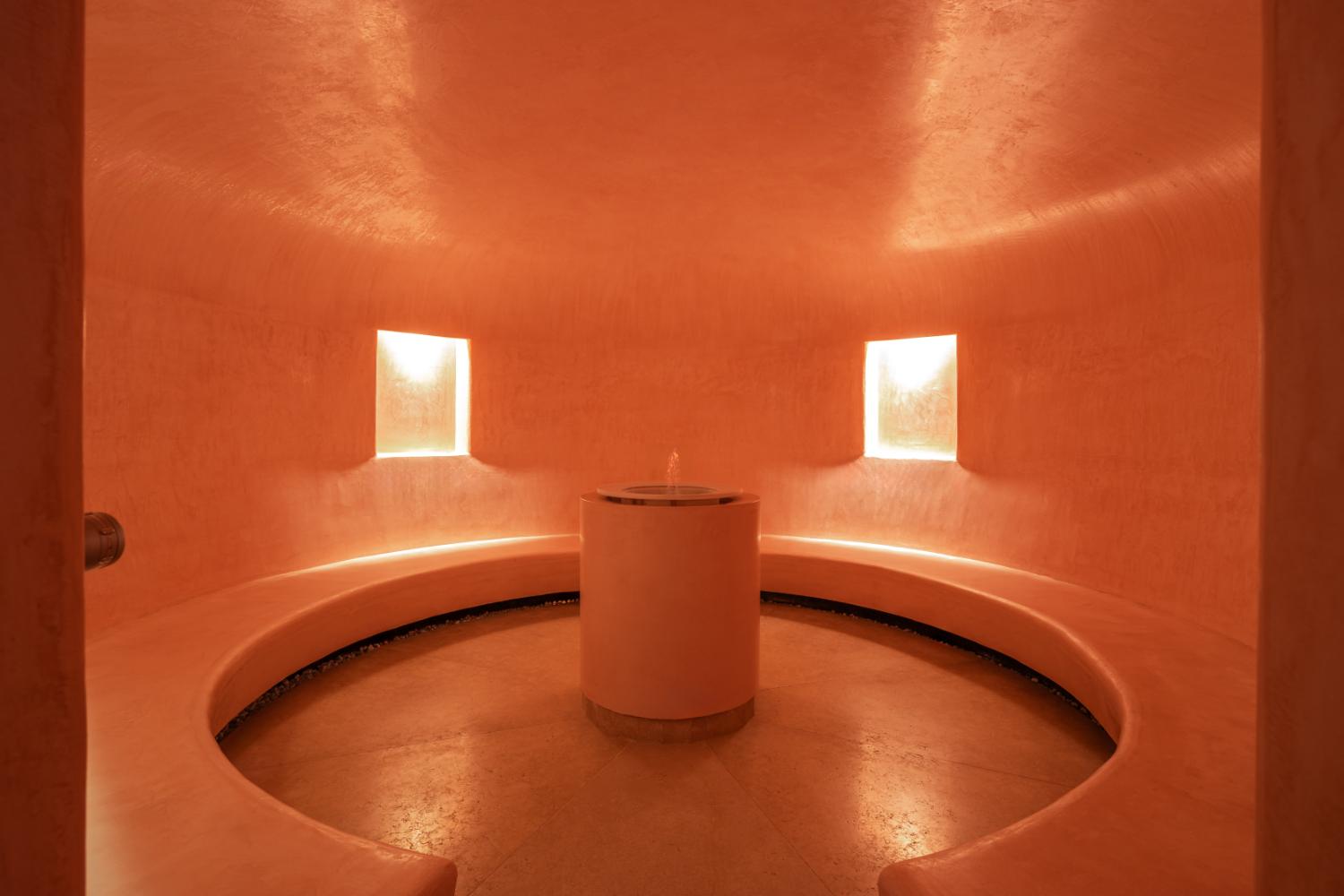 - Indoor health amenities include a massage room, sauna, hammam, gym, and heated pool with cold plunge.