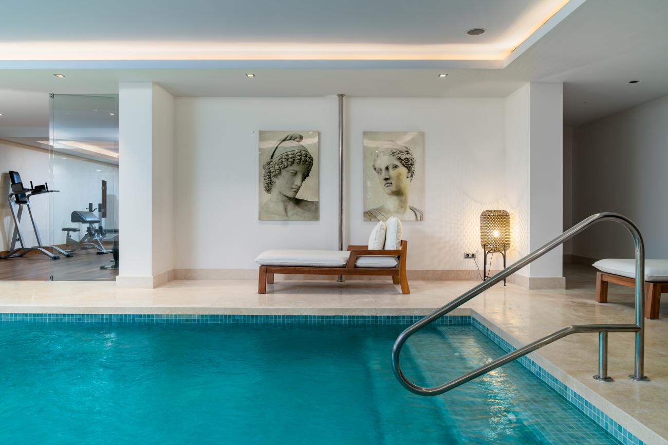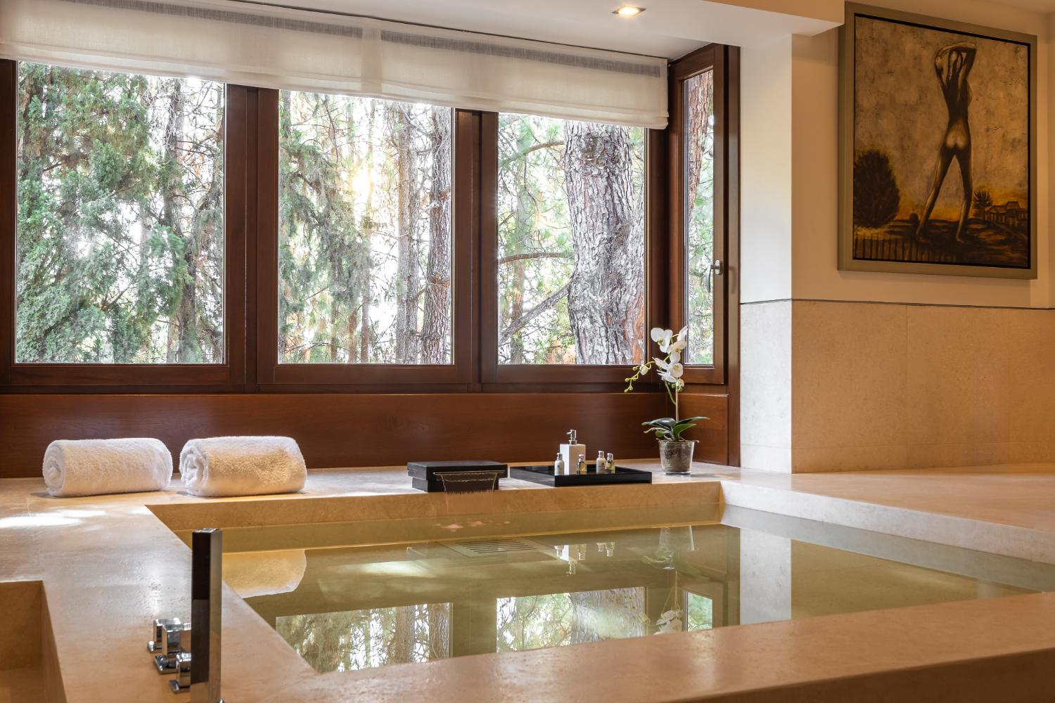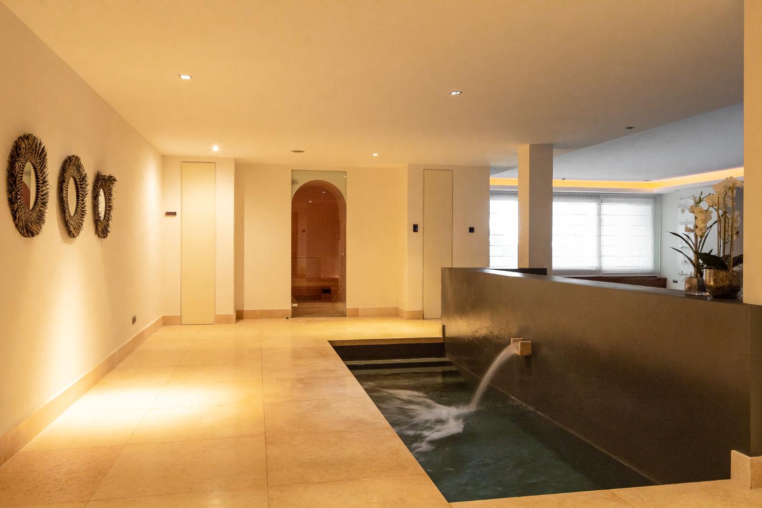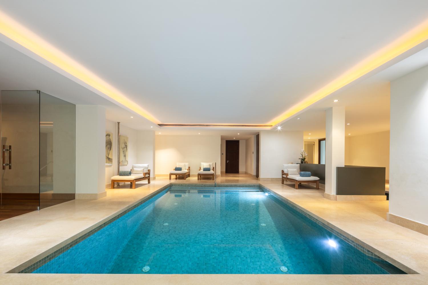 - Indoor health amenities include a massage room, sauna, hammam, gym, and heated pool with cold plunge.