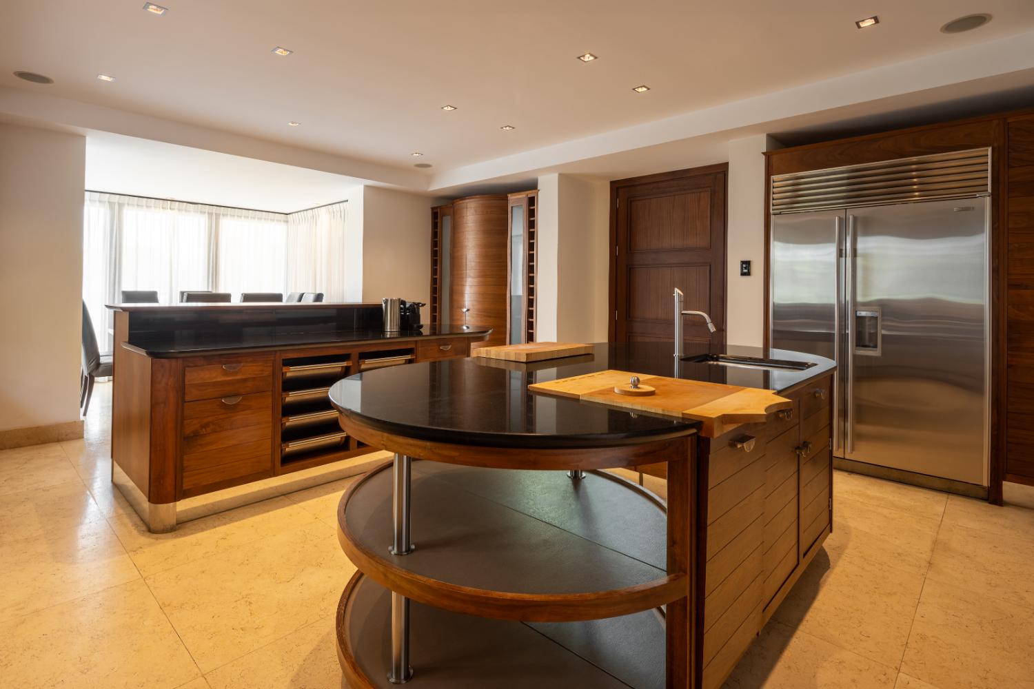 The entrance sets the mood: a double-story hall with an indoor balcony, well-proportioned architectural lines, and long-lasting, aesthetically pleasing materials. Conversations flow naturally from inside to outside as the space flows forward to a living room with beam ceilings that opens to a covered terrace. The gourmet kitchen, equipped with professional-heritage Wolf appliances, invites everything from chef service to ambitious home cooking, while a separate formal dining room across from it sets the scene for lengthy meals.