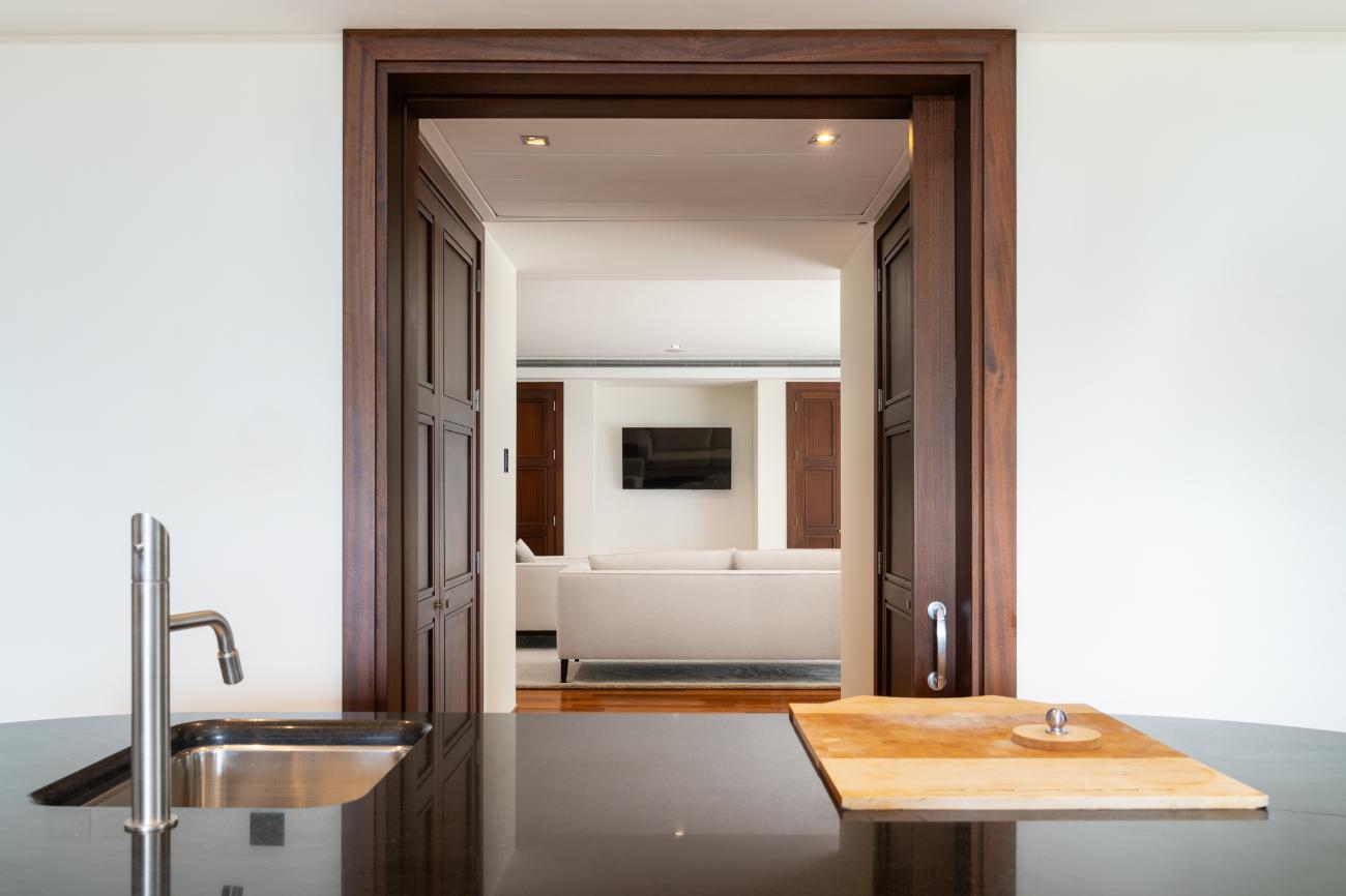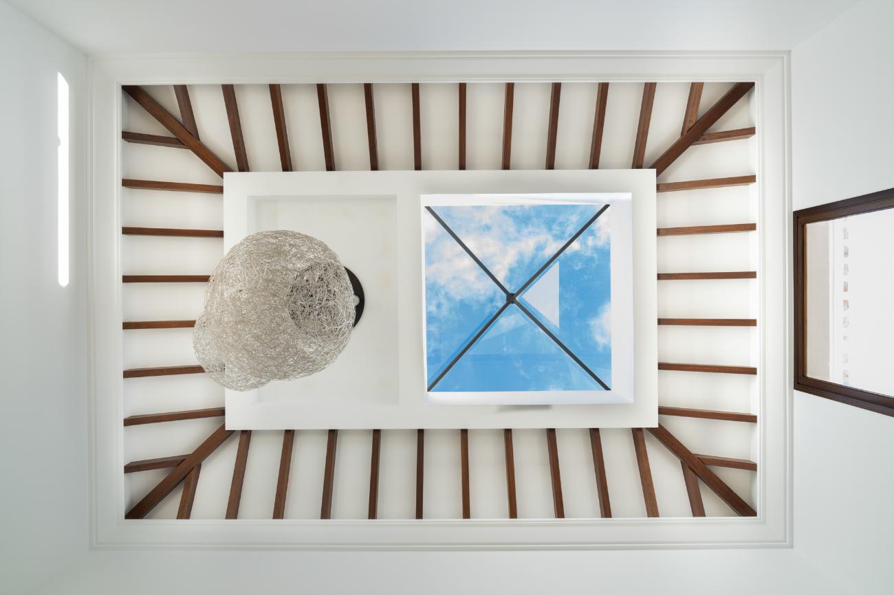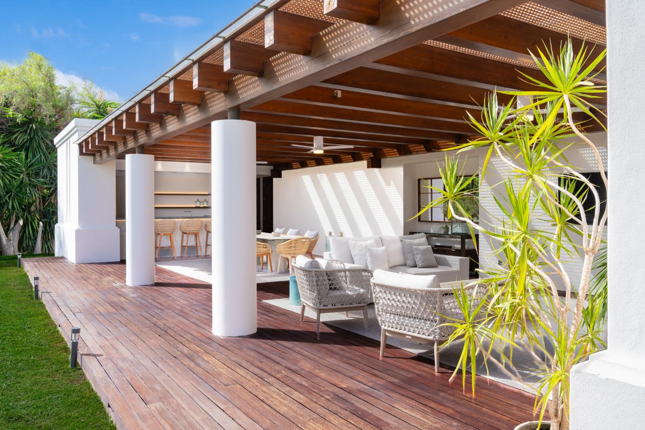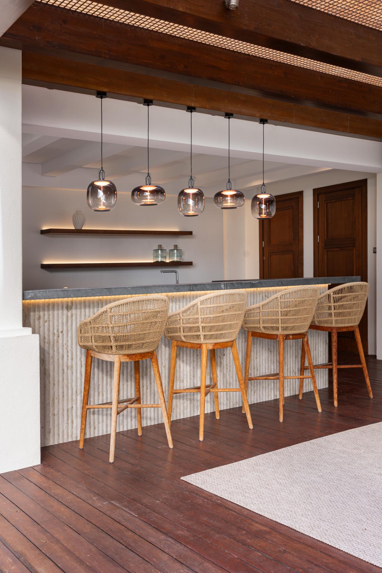 A deep main terrace with a view of the sea offers the vantage point you sought, complete with shaded sofas for comfortable conversation, a solarium for sun worshippers, and a modern glass-topped dining table for late-night alfresco meals. A carved wooden aperitif table with stool seating at the other end serves as your sunset ritual, while a BBQ station is available for grilled lunches. Constant sea-view balconies on the first floor provide peaceful areas for reading and stargazing at night.