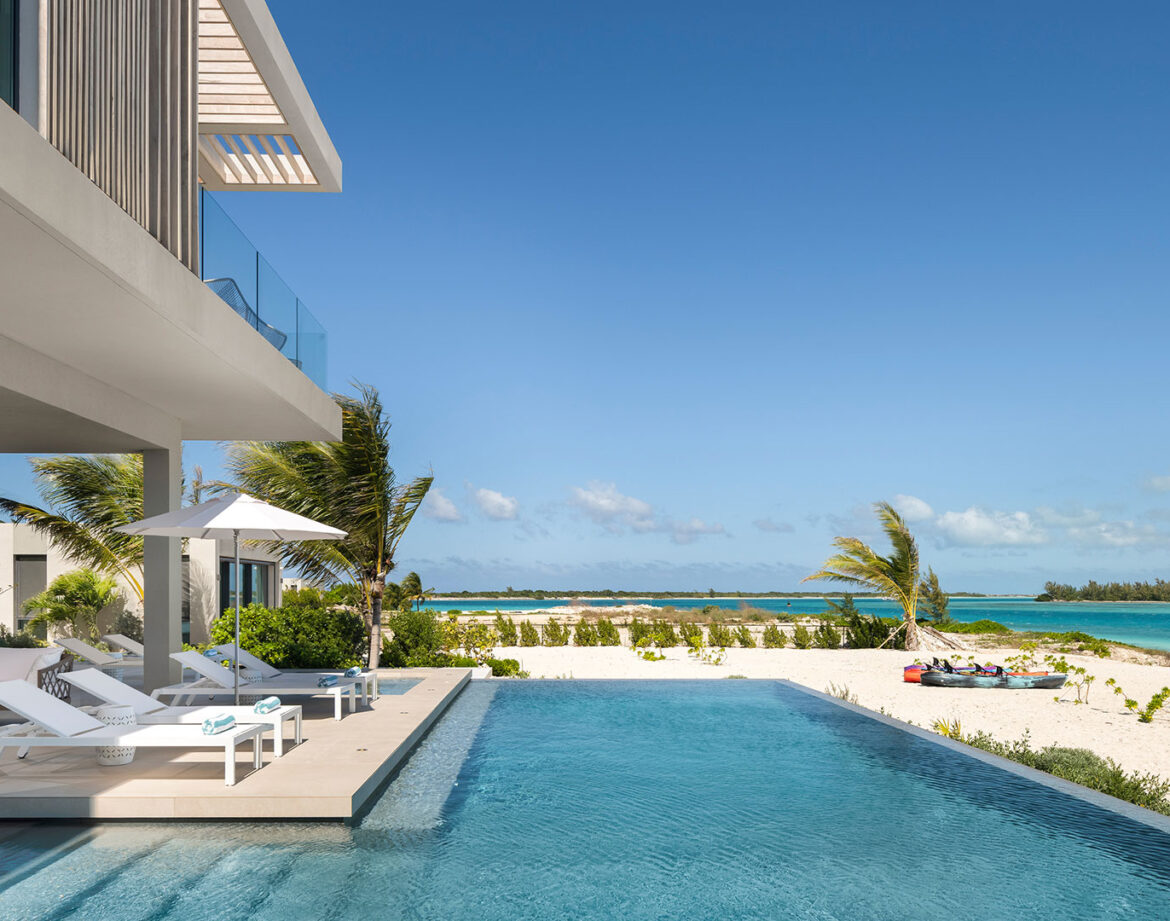 Villa Emerald Breeze, with its six bedrooms and private guesthouse arranged around a heated infinity pool and the blues of Grace Bay and the Cays stretching across the horizon, is revealed by sunlit glass and clean lines as you follow the palm-lined drive.