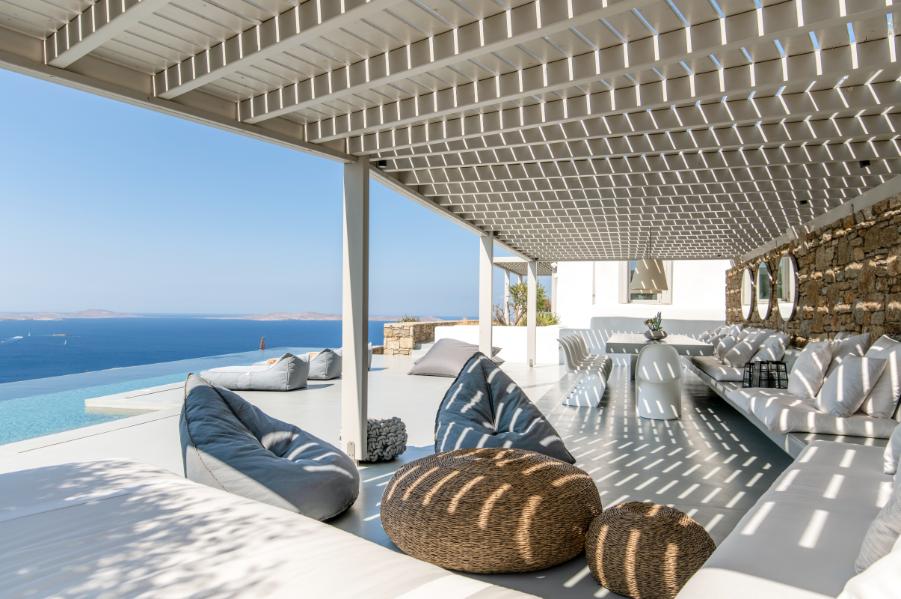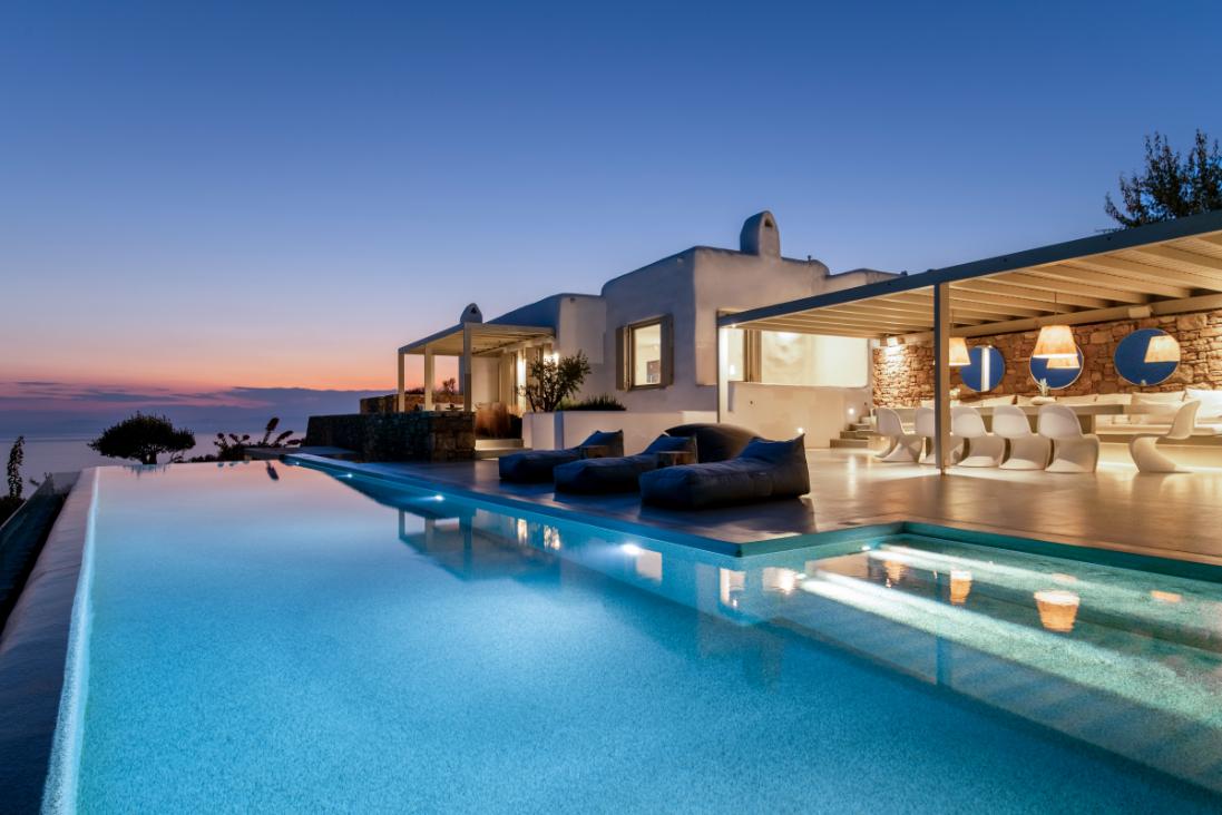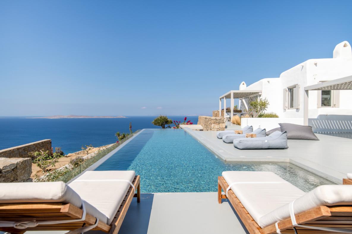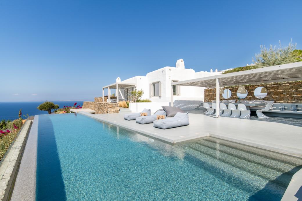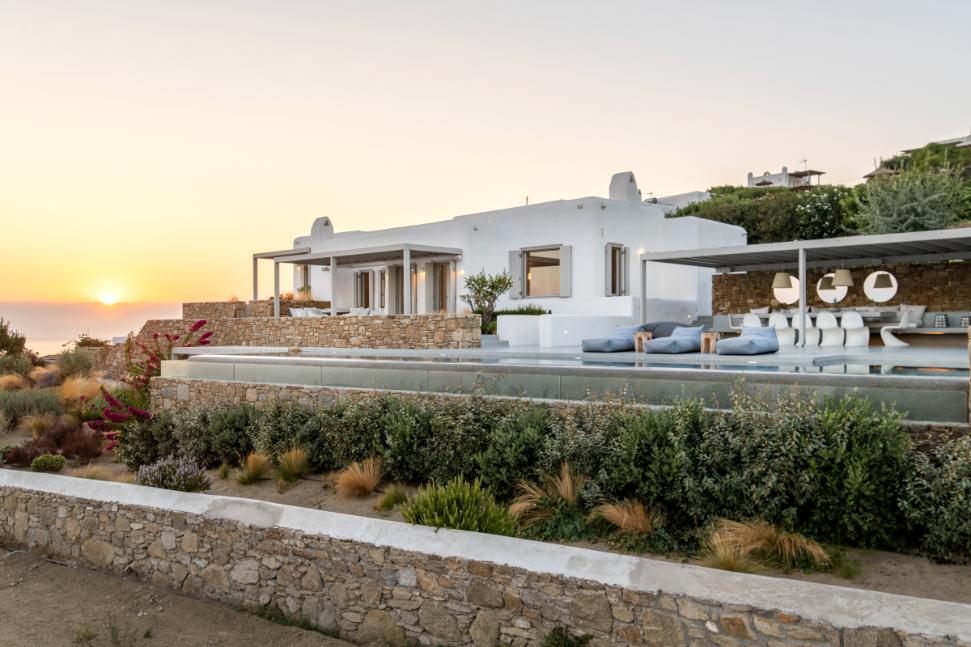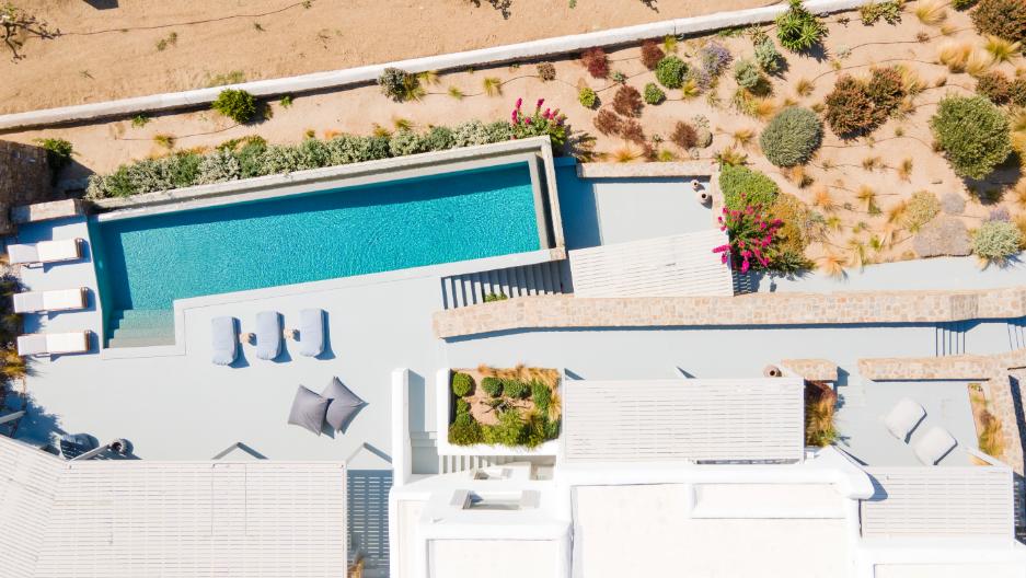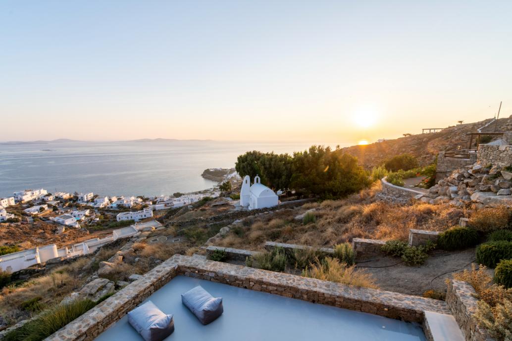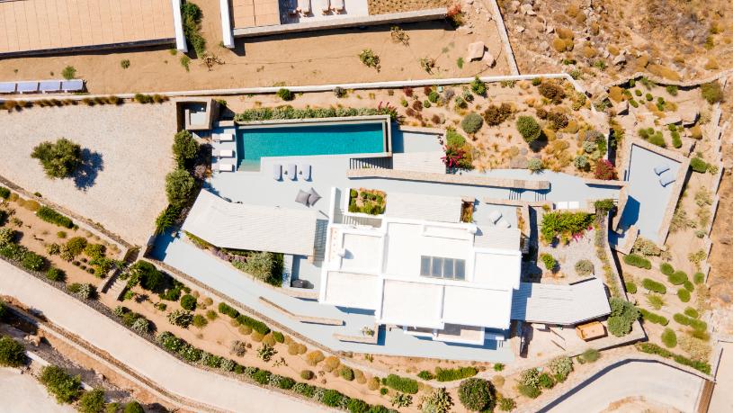 Nestled on the mountainside above Tourlos, Villa Faros is a spacious modern haven designed for leisurely mornings, long pool days, and sunsets over the Aegean at the height of the day. You can see the whitewashed charm of Mykonos Town across the sea from here; it’s far enough to enjoy total peace and quiet, yet close enough to feel connected. The outdoor living areas are wonderfully usable all year round thanks to their thoughtful orientation and protection from the fierce northerly summer winds.
