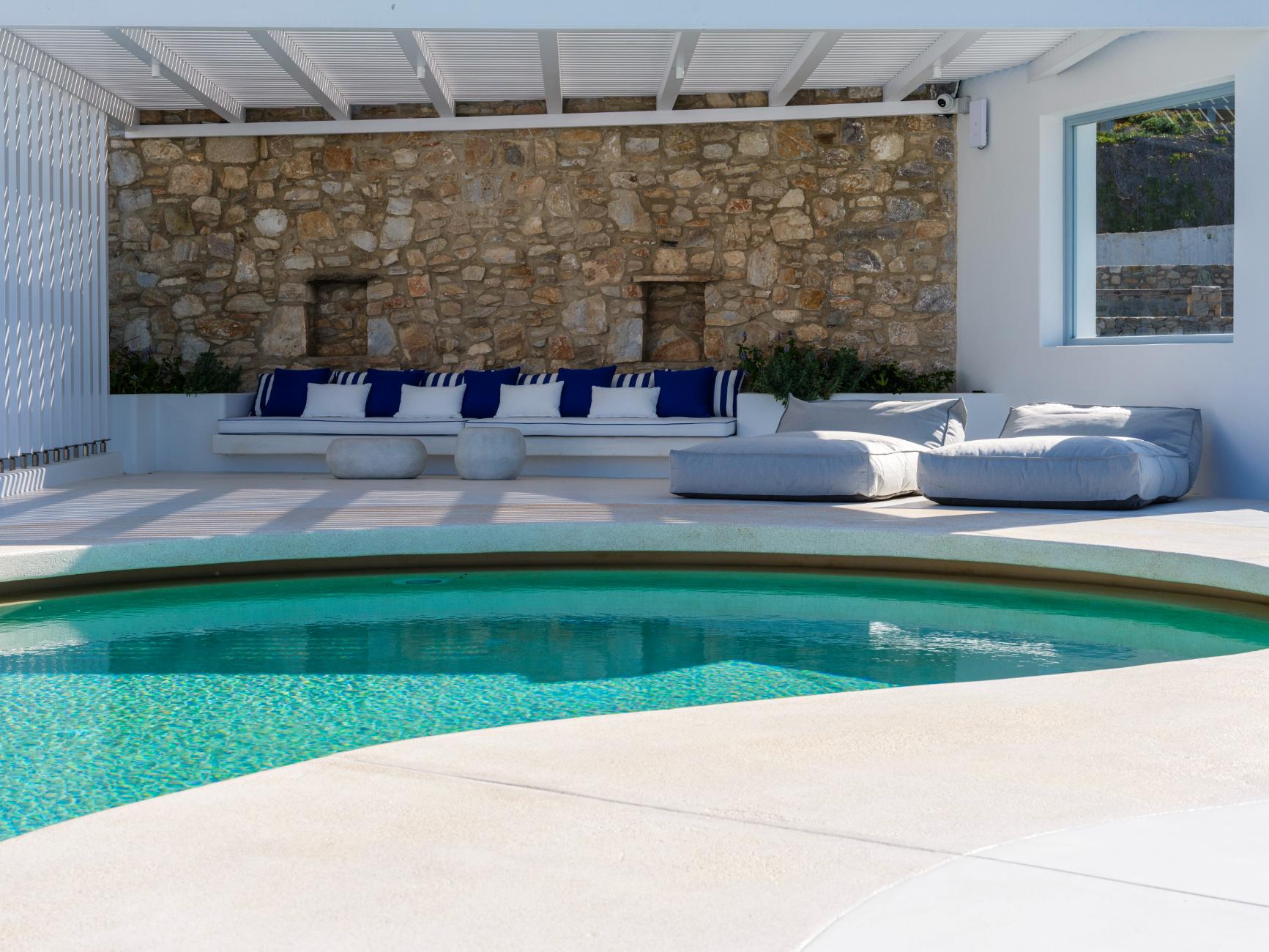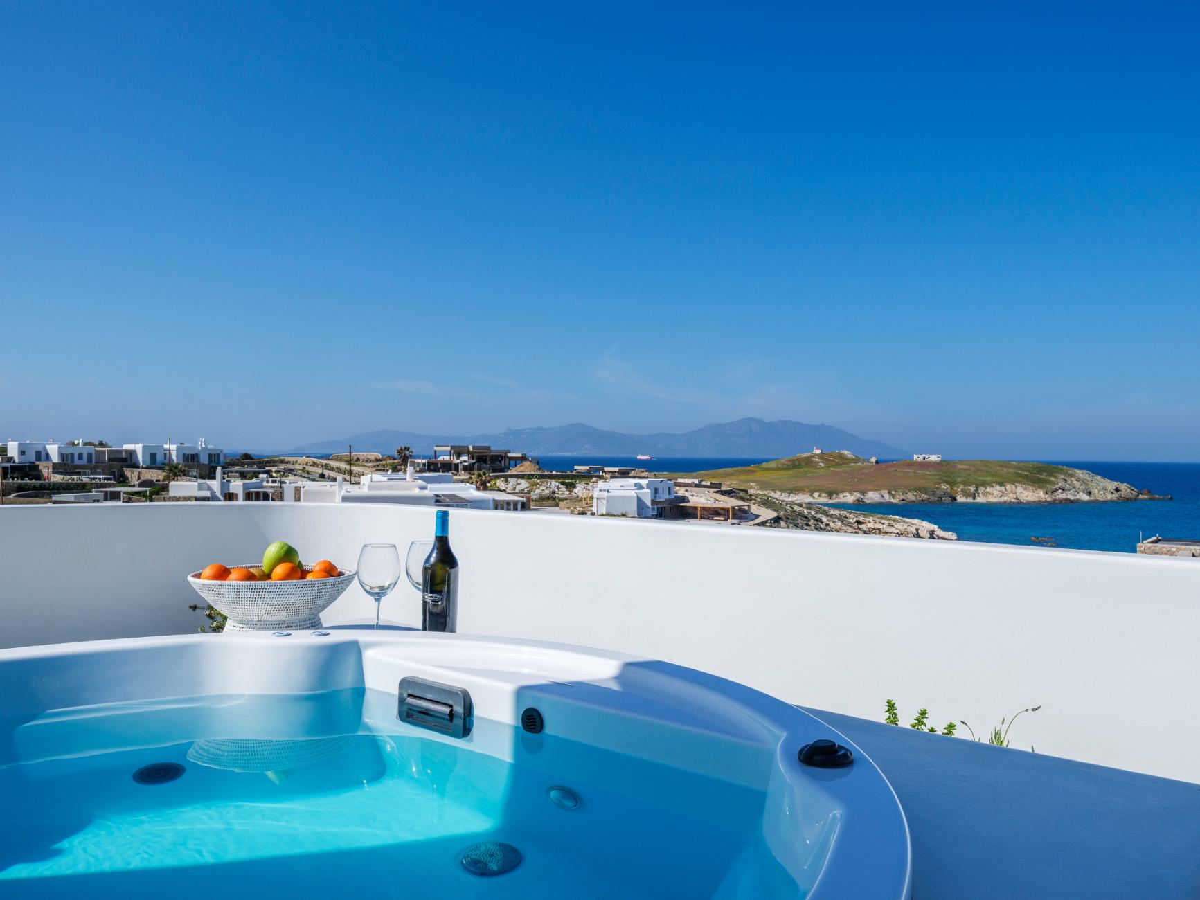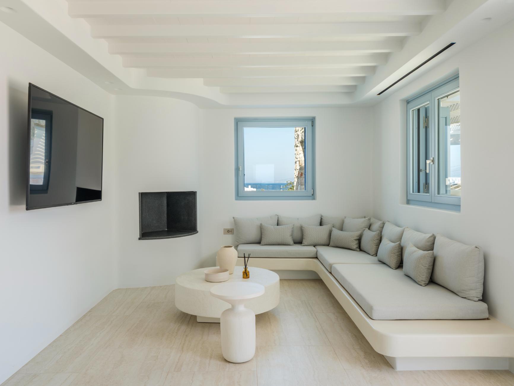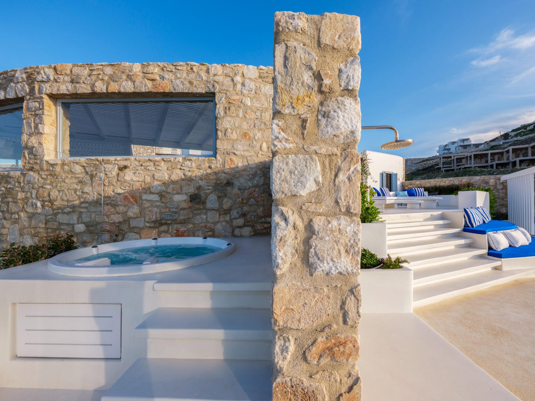 What makes Villa Kiya different is simple: it combines a true entertainer’s outdoor setup for large gatherings with three independent sea-view jacuzzi suites—so you get both a social villa and a “private hotel suite” feeling in one, a standout among Greece Villas on Mykonos.