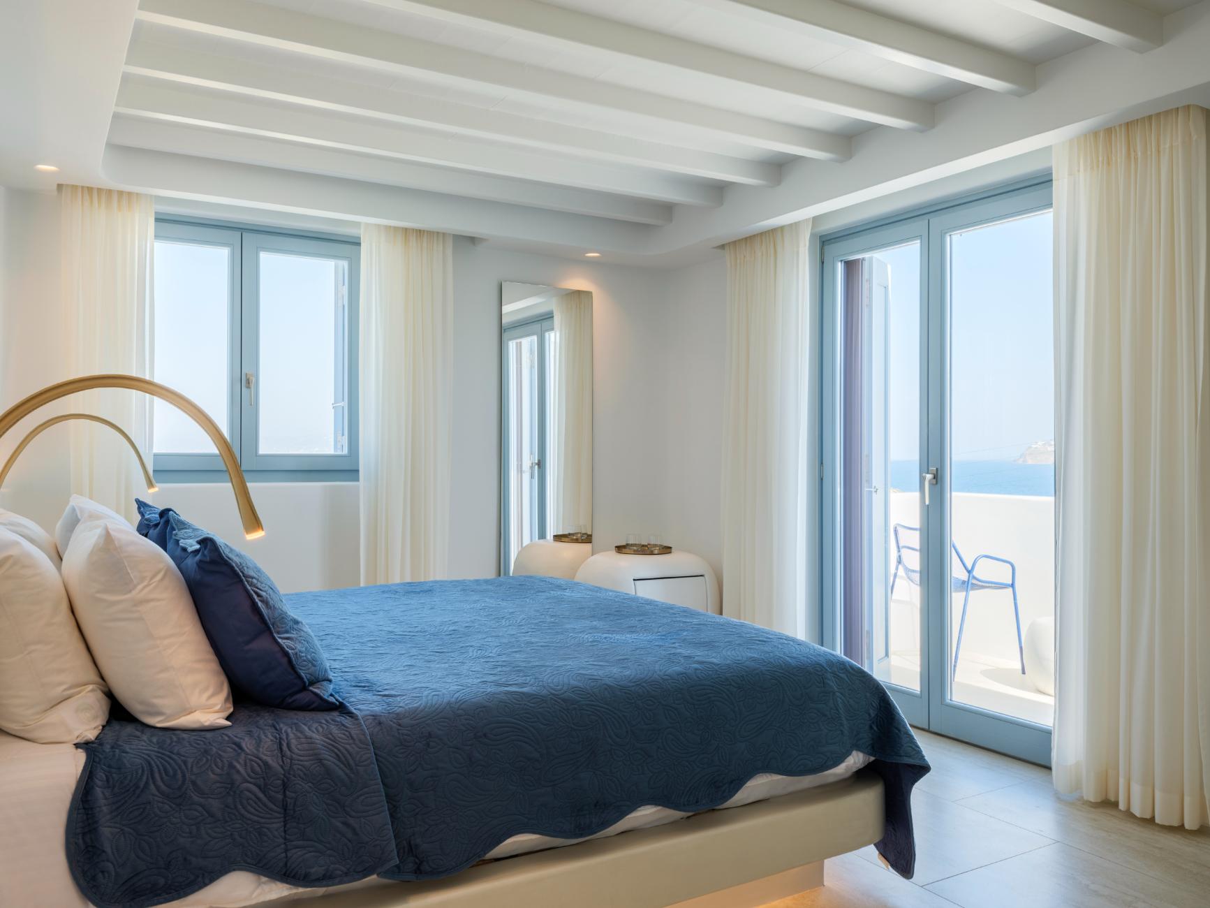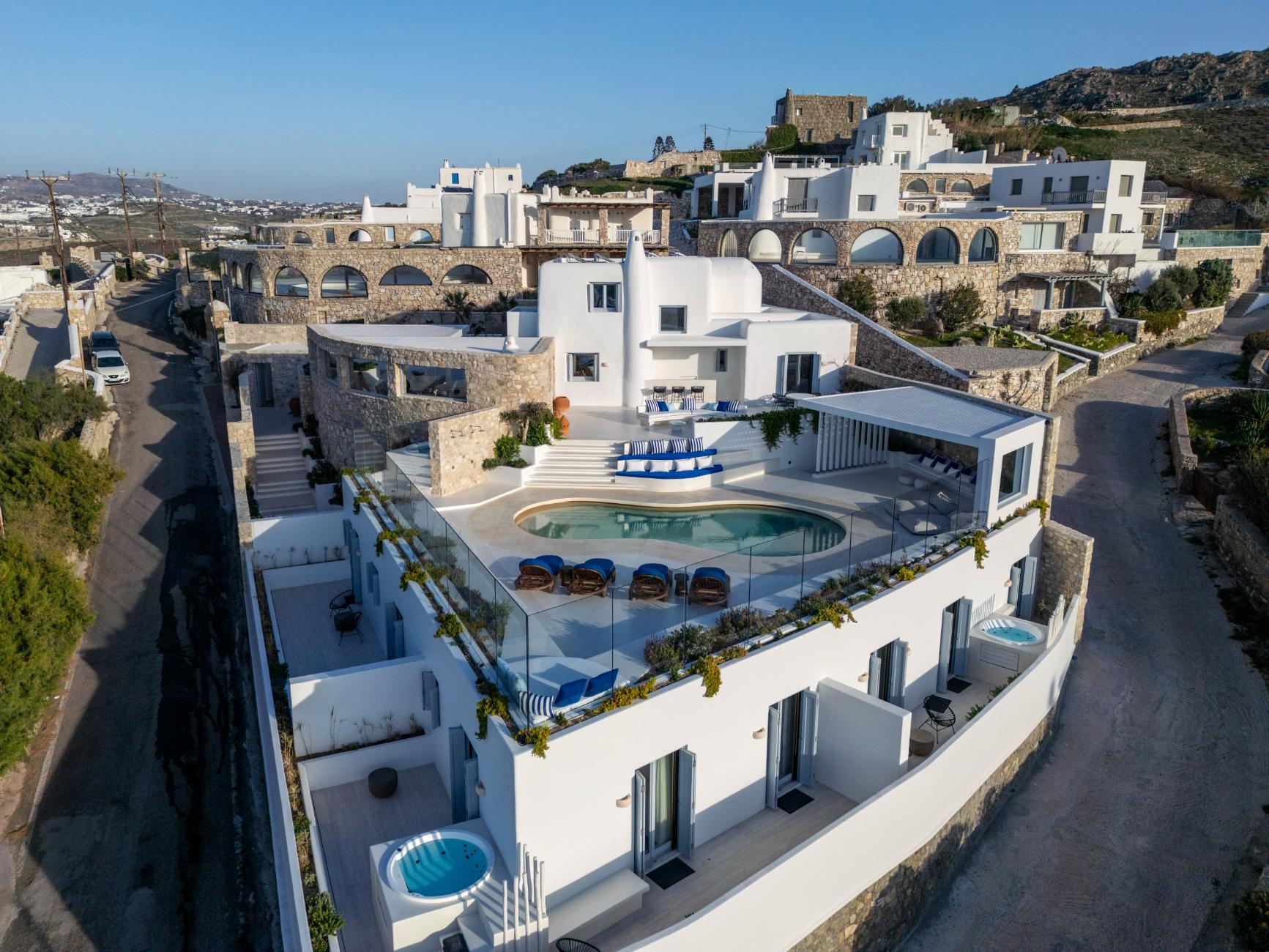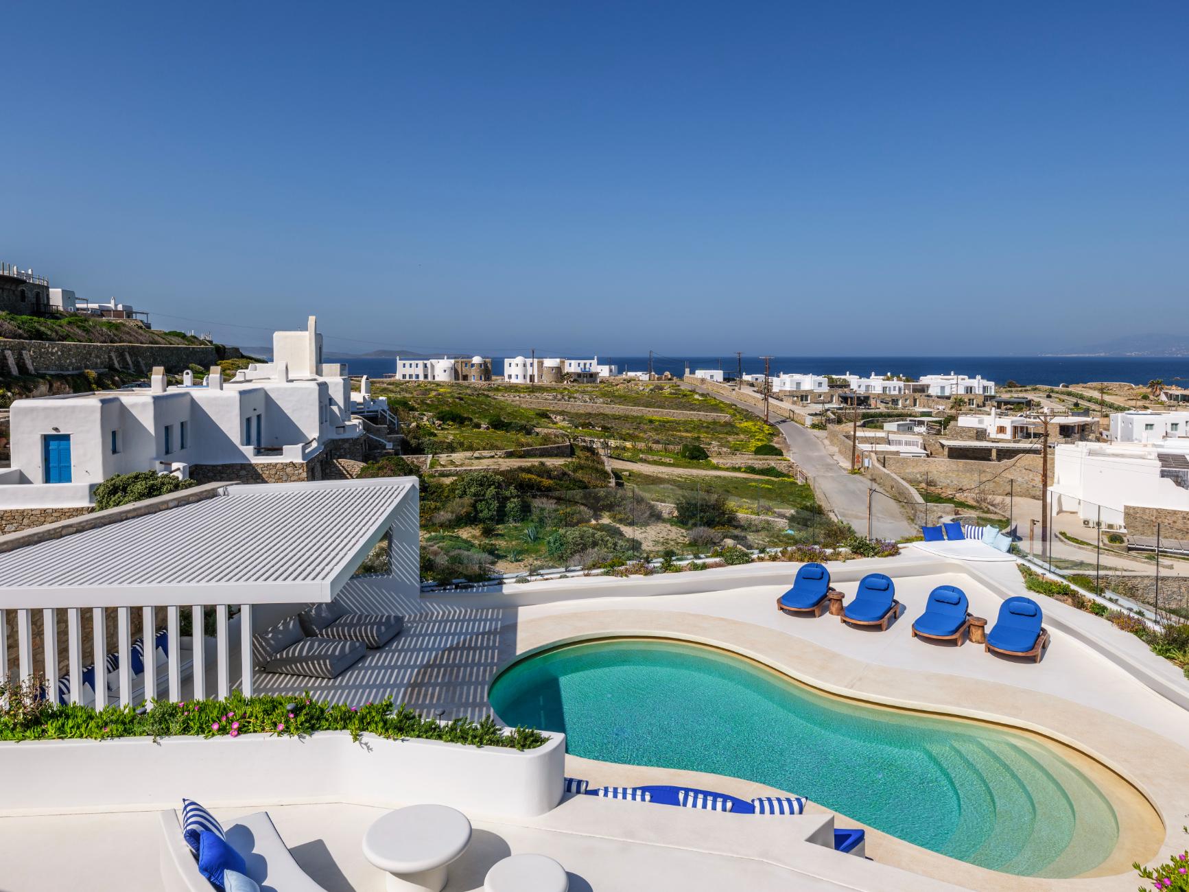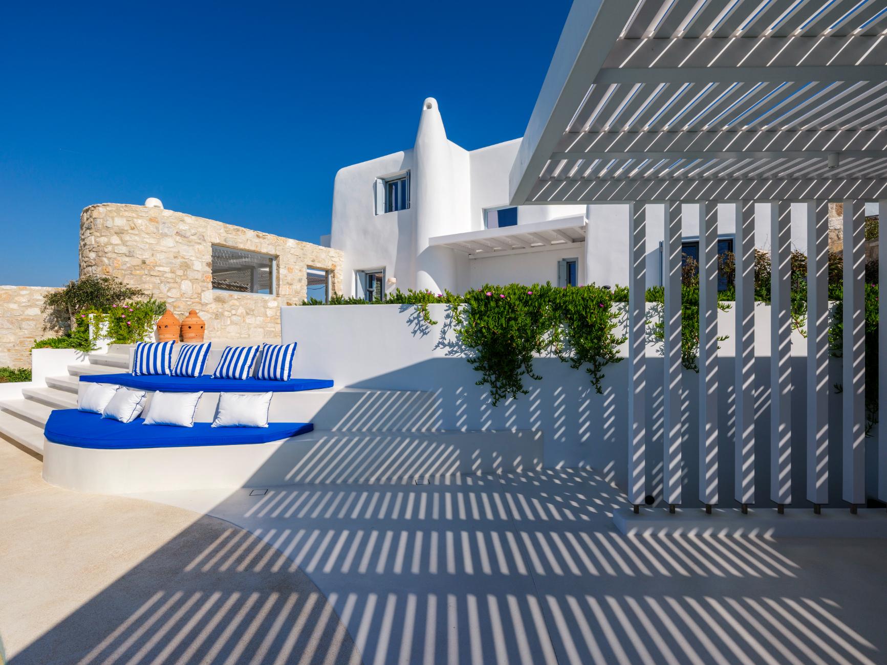 What makes Villa Kiya different is simple: it combines a true entertainer’s outdoor setup for large gatherings with three independent sea-view jacuzzi suites—so you get both a social villa and a “private hotel suite” feeling in one, a standout among Greece Villas on Mykonos.