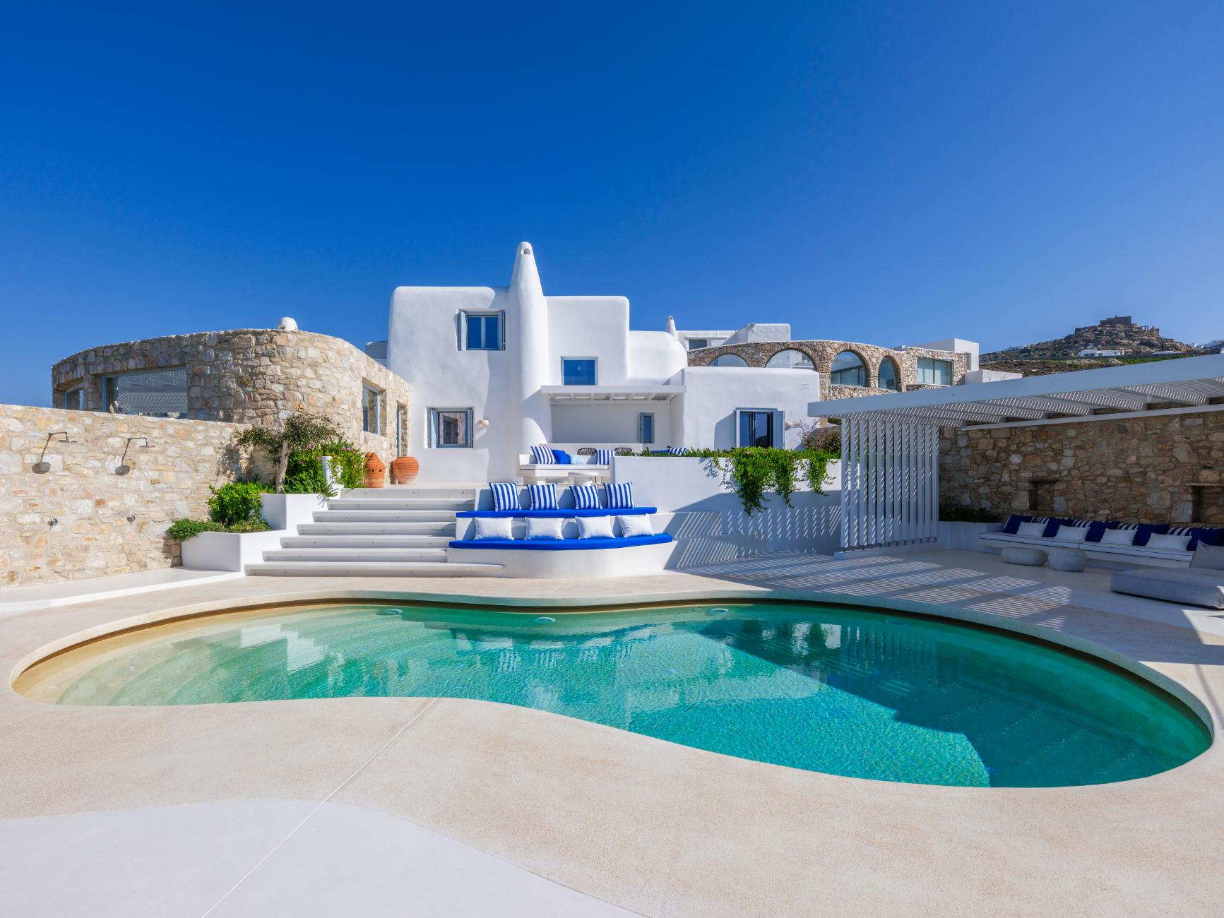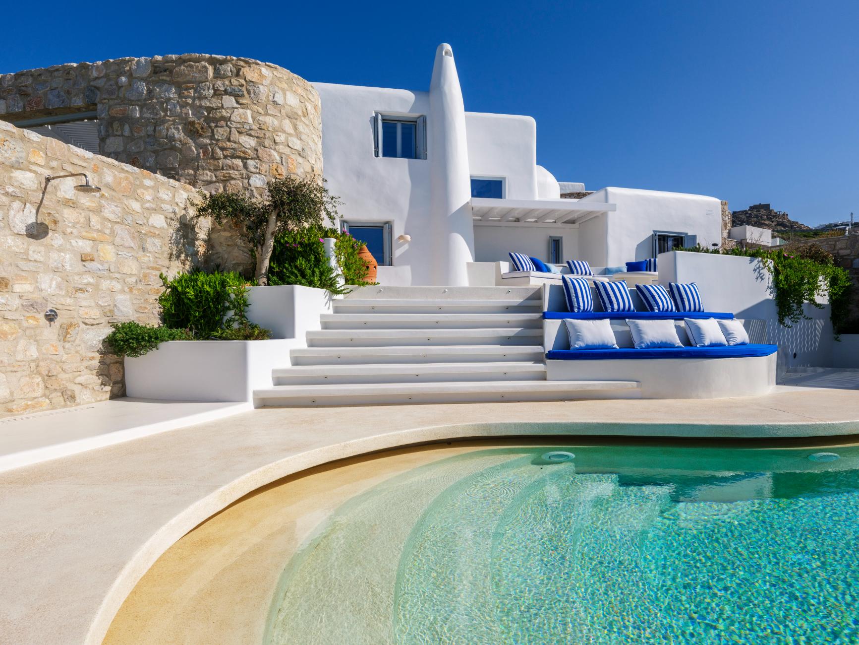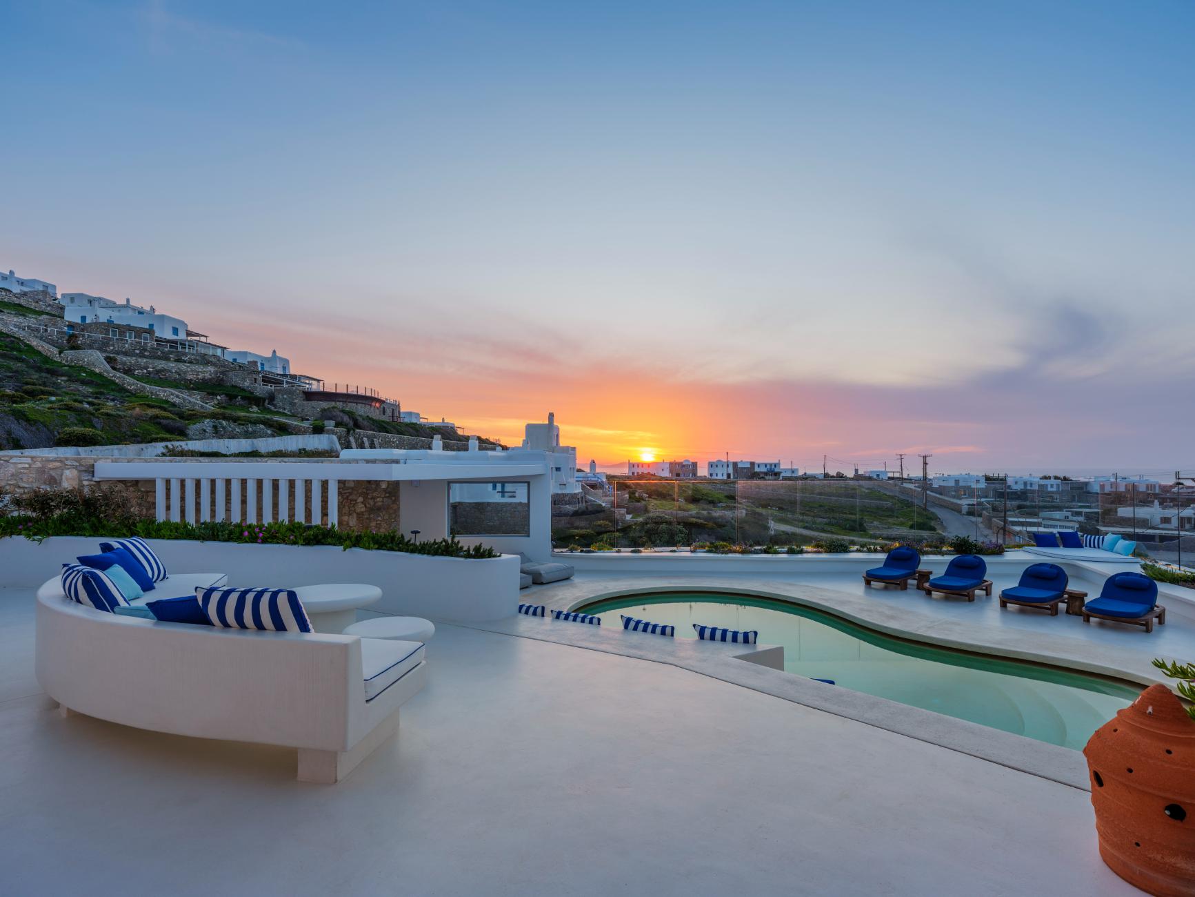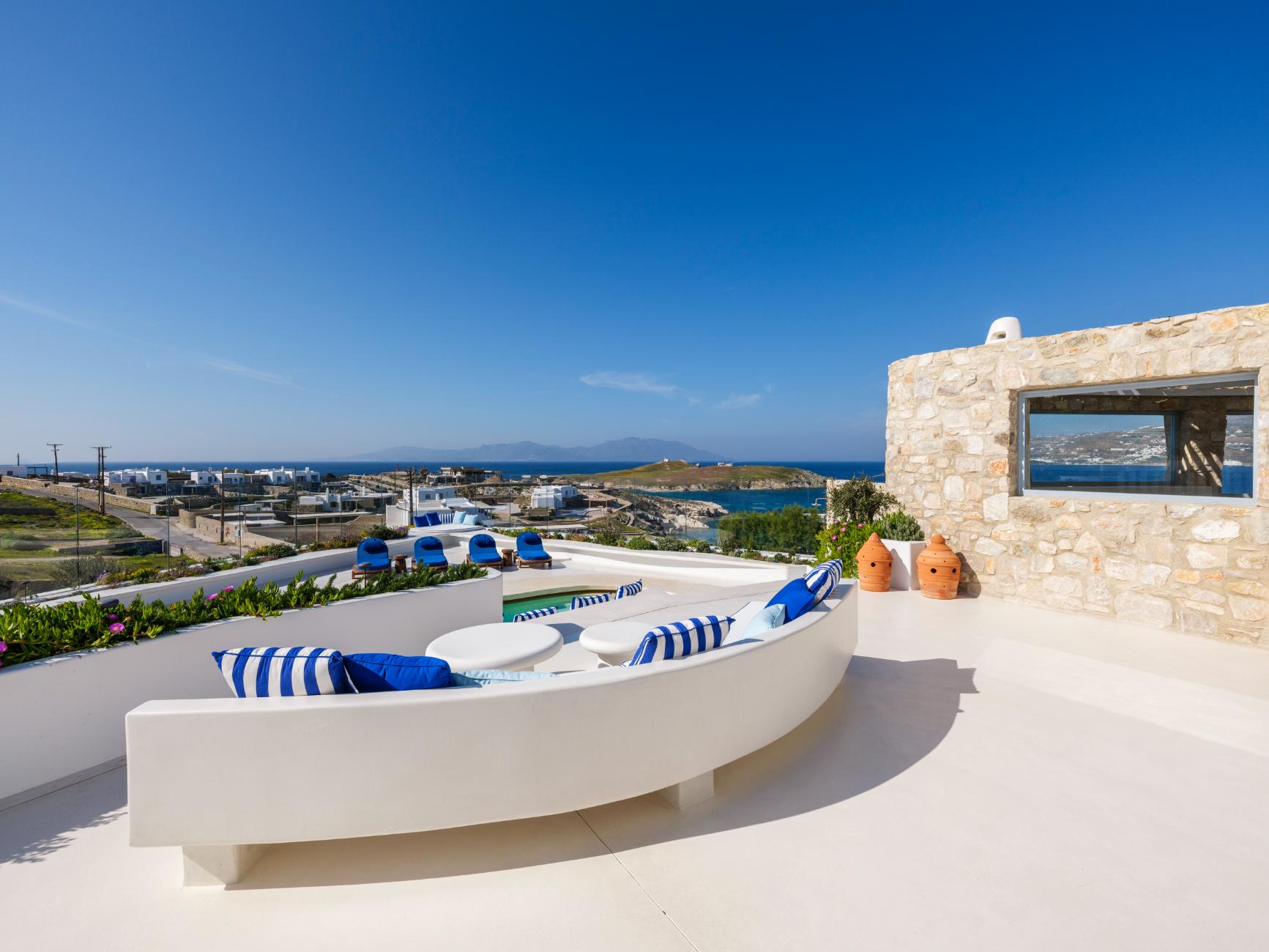 What makes Villa Kiya different is simple: it combines a true entertainer’s outdoor setup for large gatherings with three independent sea-view jacuzzi suites—so you get both a social villa and a “private hotel suite” feeling in one, a standout among Greece Villas on Mykonos.