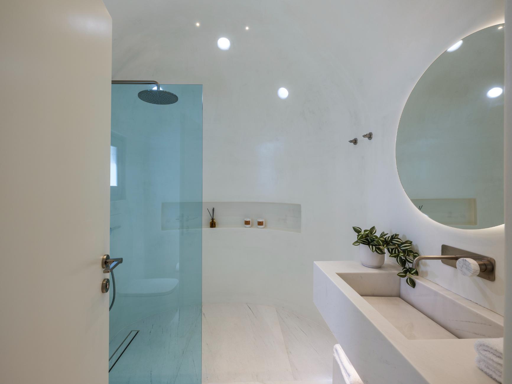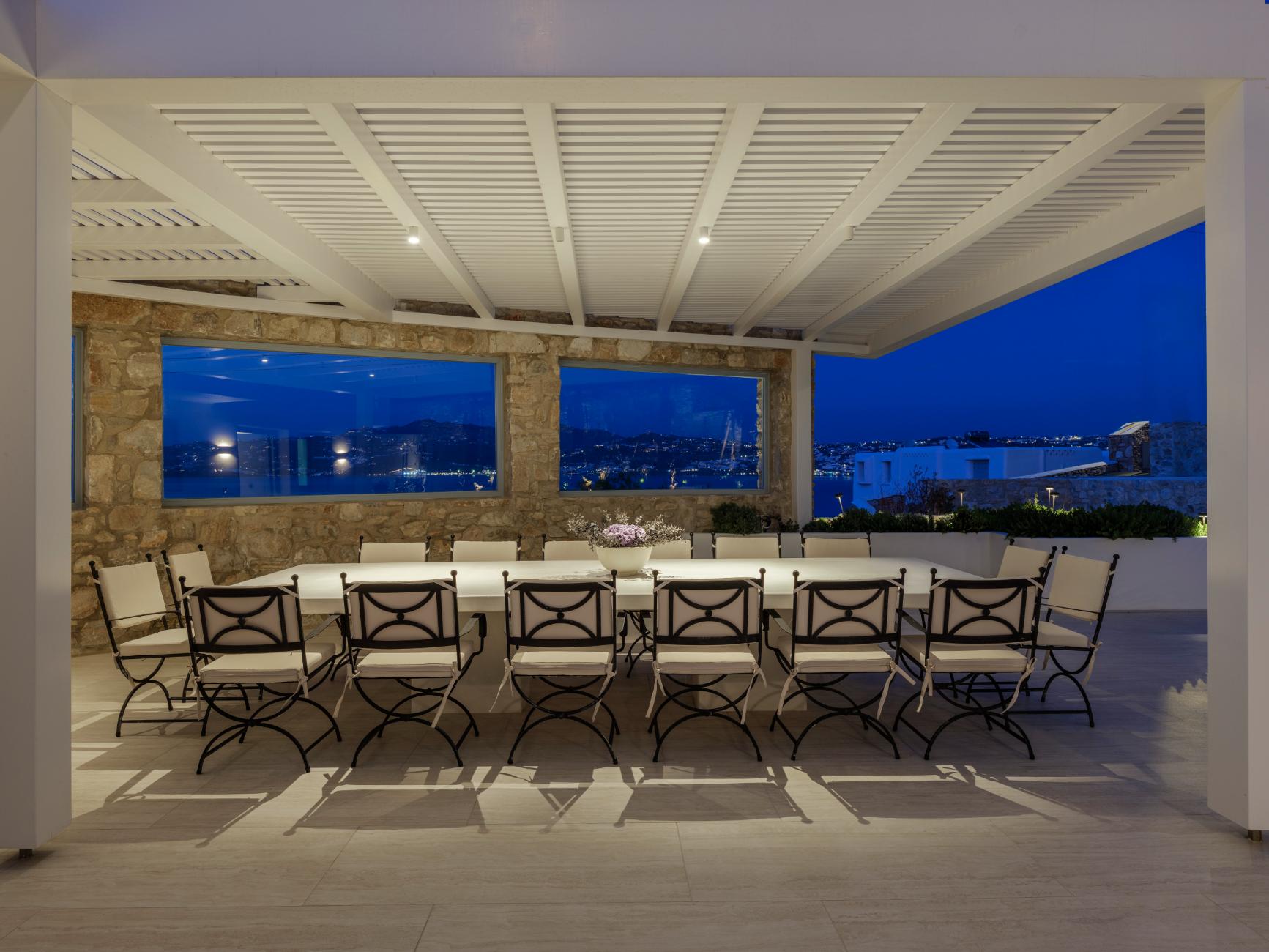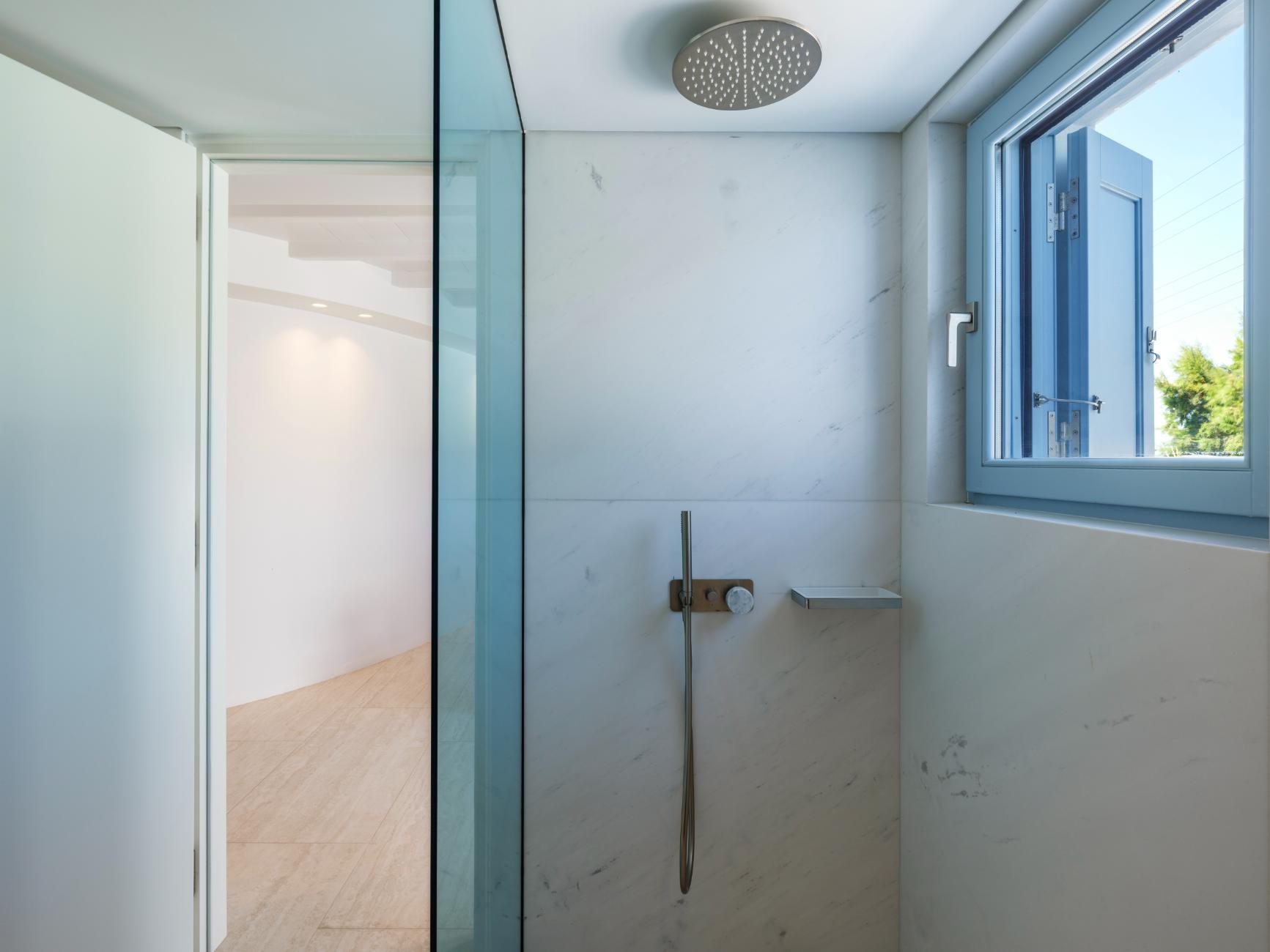 Outside, Villa Kiya is built for long, indulgent days. A private pool anchors the entrance-floor terrace, complemented by a built-in heated jacuzzi for up to five people, loungers positioned for uninterrupted views, and a pergola-shaded lounge that stays comfortable even when the Meltemi picks up. There’s also a wind-protected, built-in dining area for up to 16 under a pergola, supported by an outdoor kitchenette and bar with high chairs, a pizza oven, a built-in BBQ, and multiple lounging corners that let everyone find their own rhythm—sun, shade, conversation, or quiet.