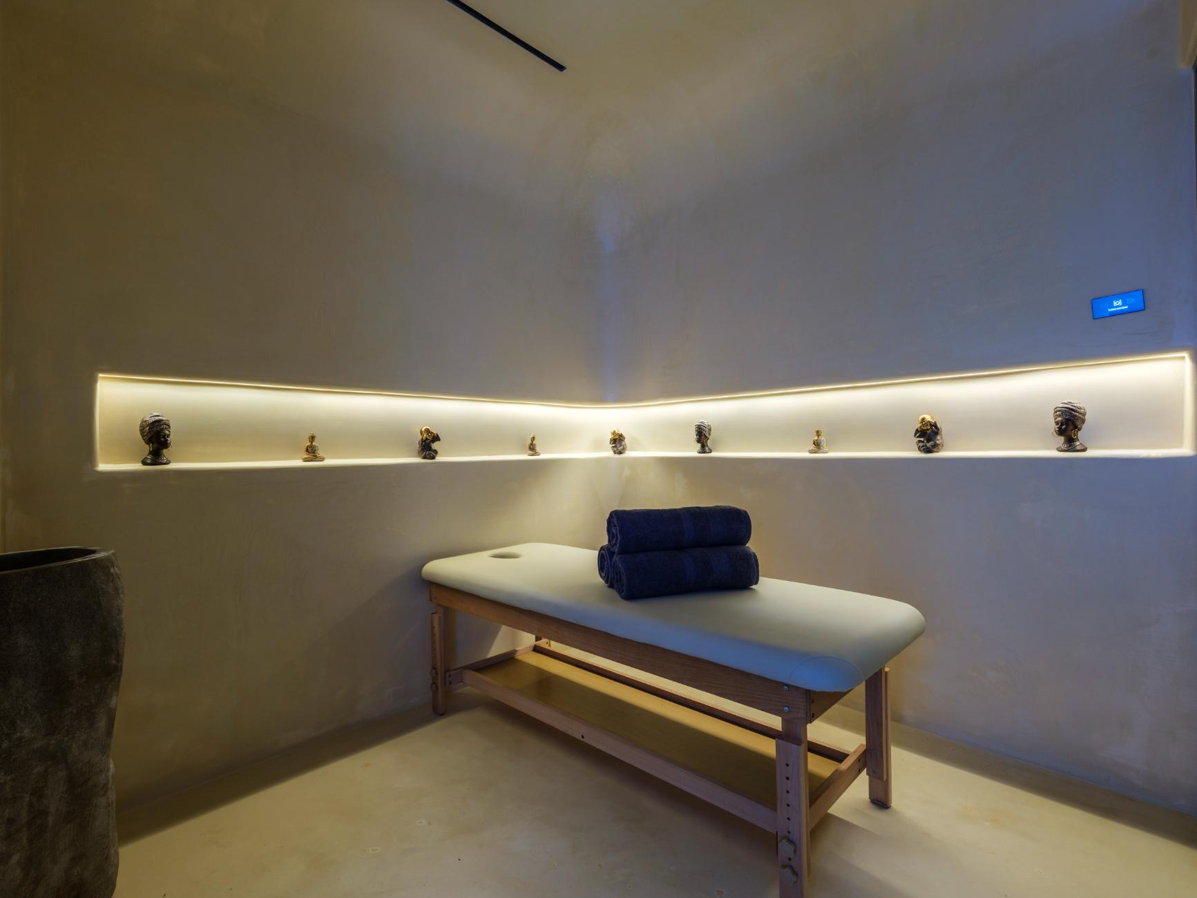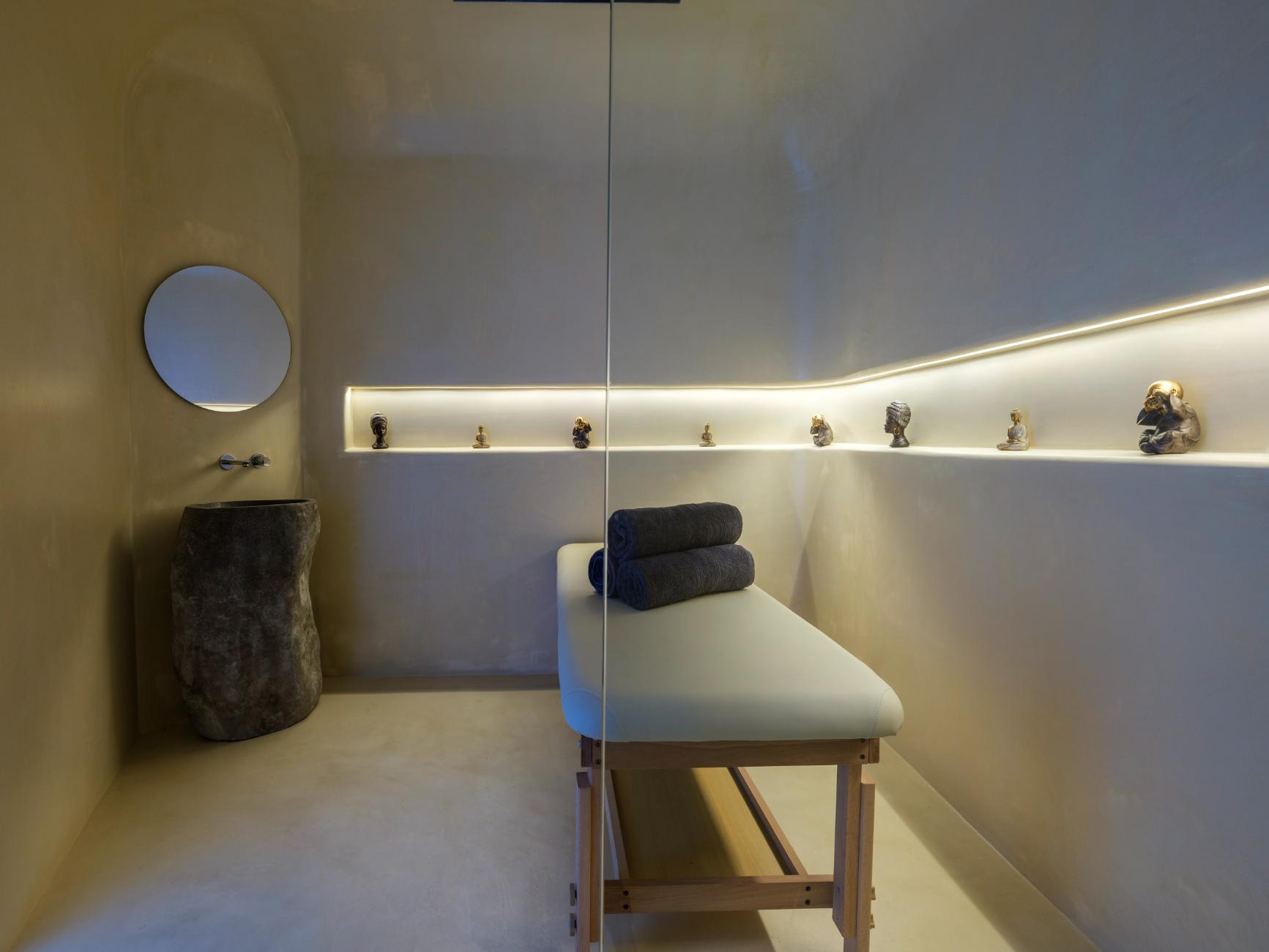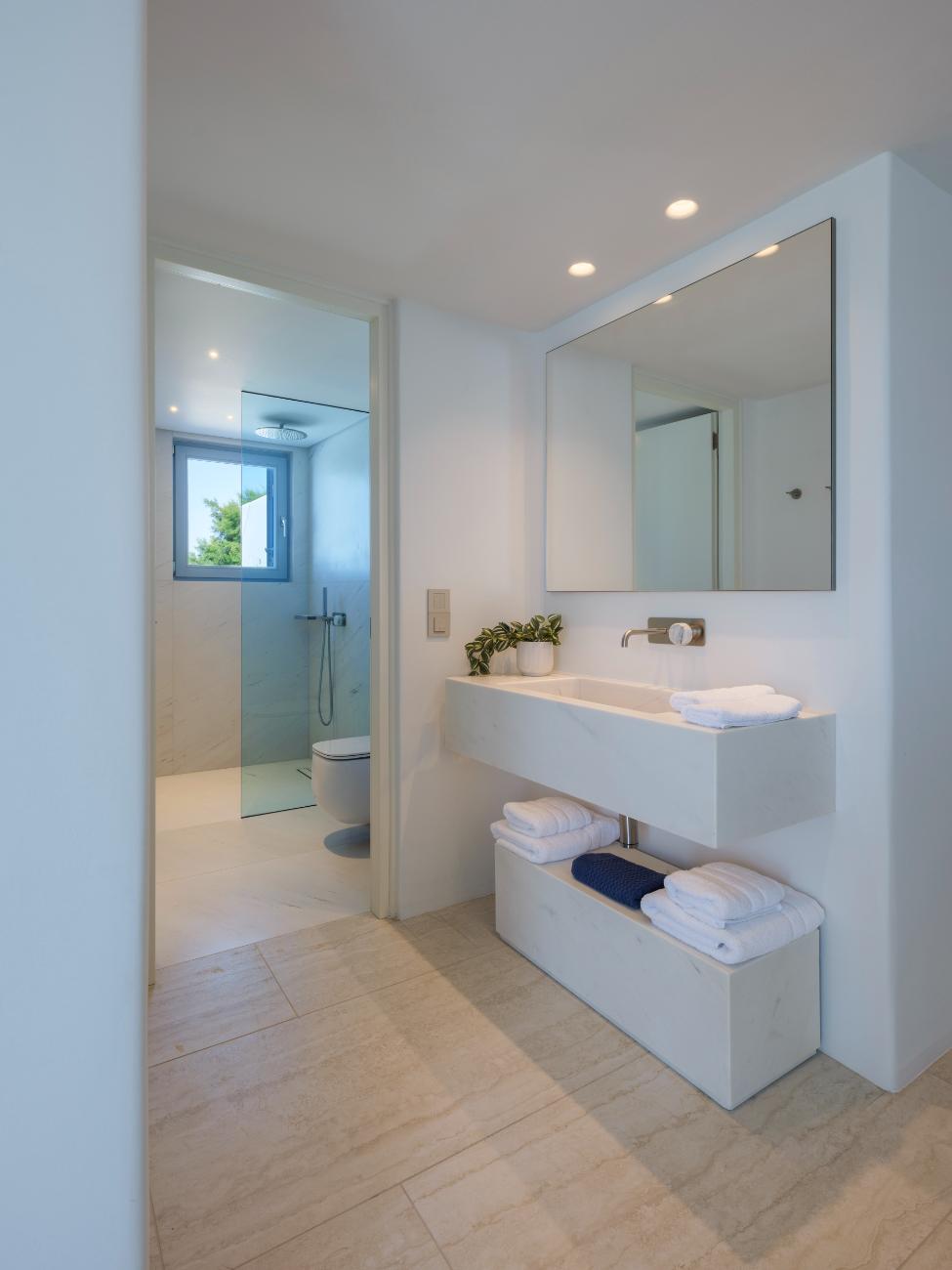 Outside, Villa Kiya is built for long, indulgent days. A private pool anchors the entrance-floor terrace, complemented by a built-in heated jacuzzi for up to five people, loungers positioned for uninterrupted views, and a pergola-shaded lounge that stays comfortable even when the Meltemi picks up. There’s also a wind-protected, built-in dining area for up to 16 under a pergola, supported by an outdoor kitchenette and bar with high chairs, a pizza oven, a built-in BBQ, and multiple lounging corners that let everyone find their own rhythm—sun, shade, conversation, or quiet.