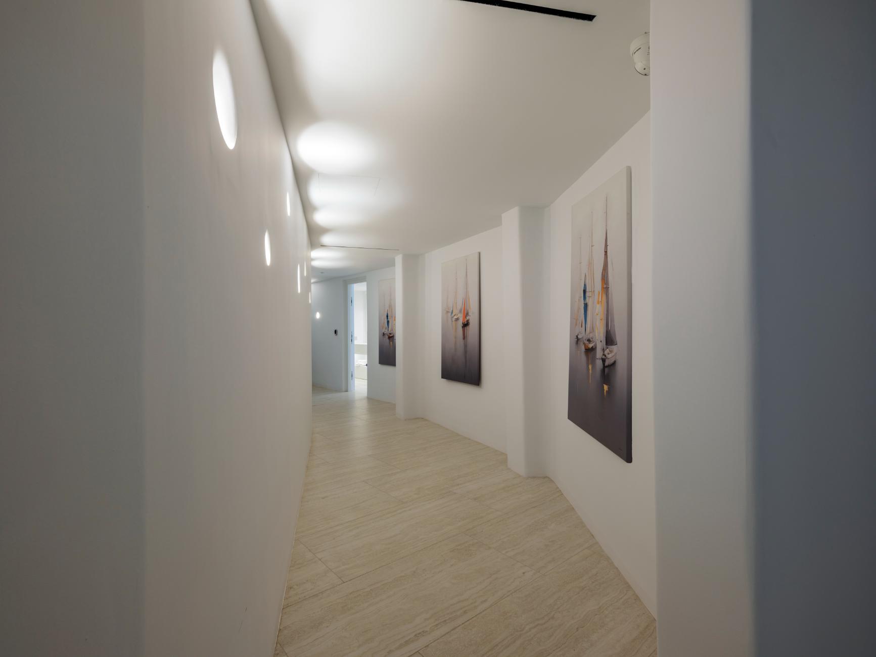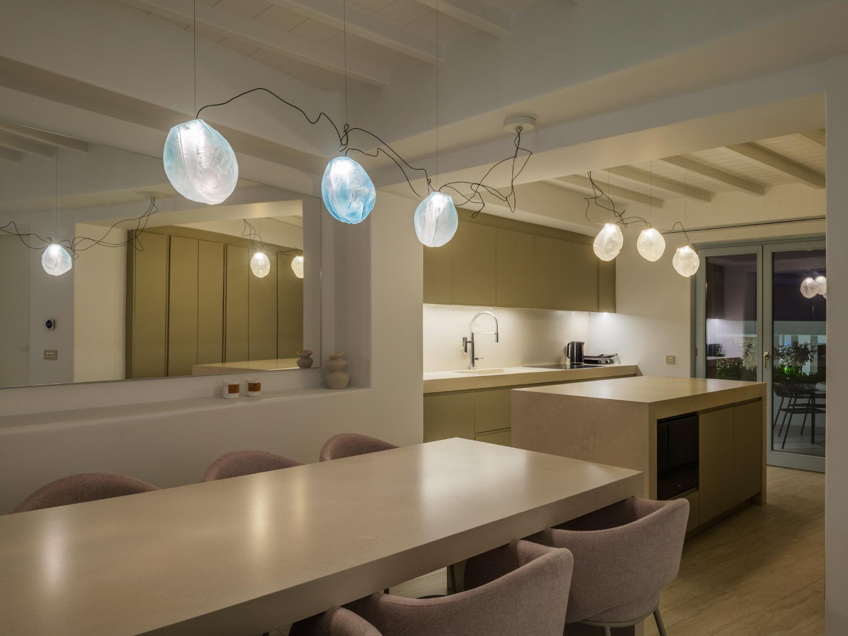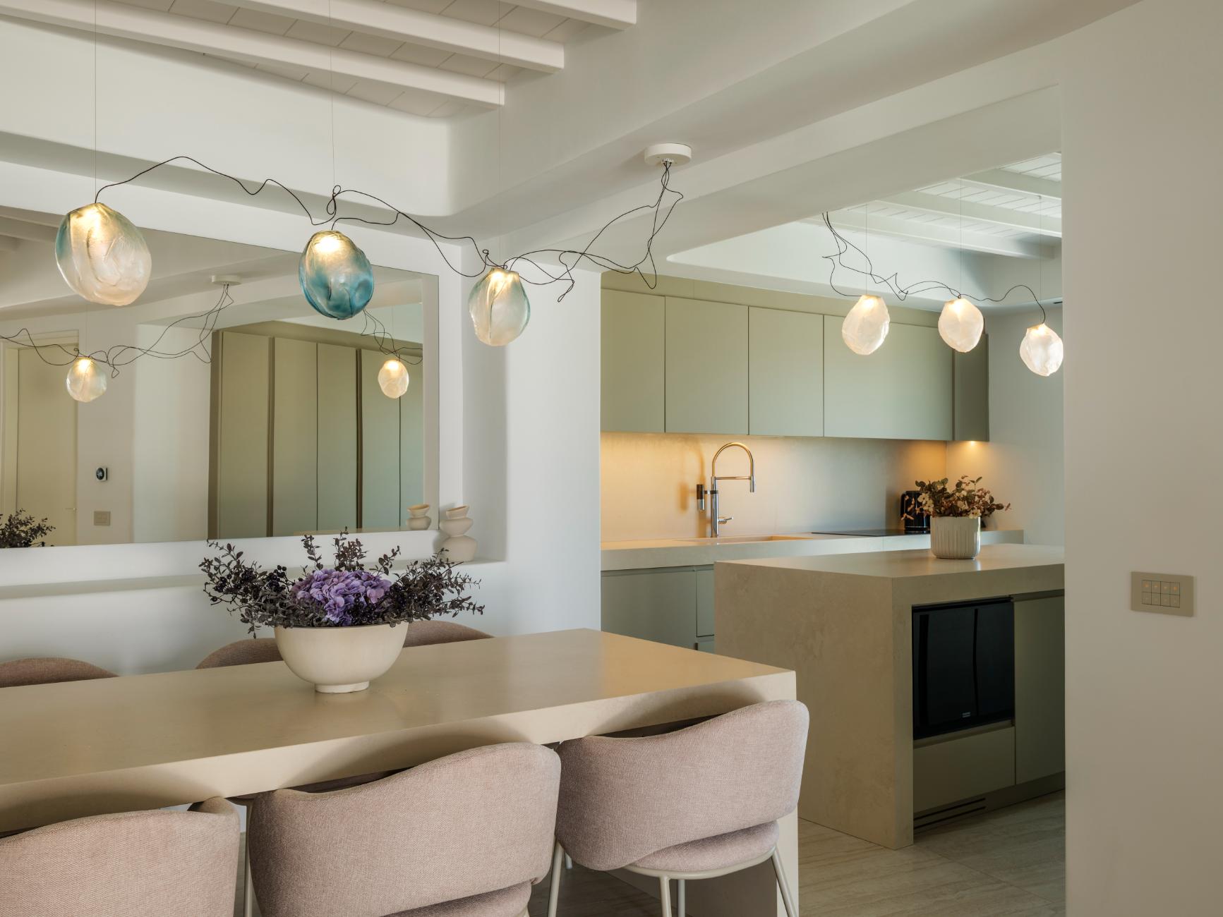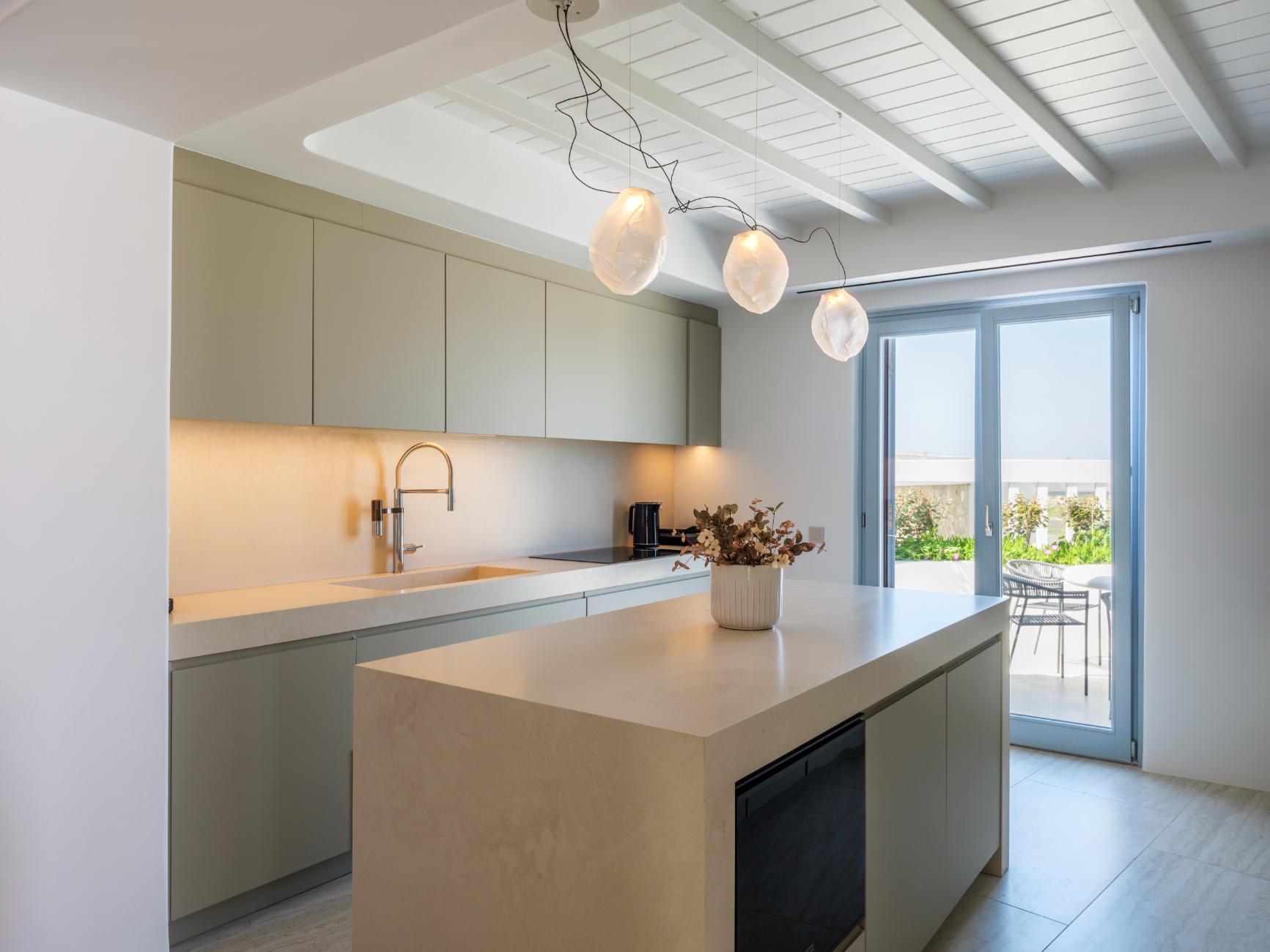 Set above the Aegean with an open sea horizon that turns gold at sunset, this home is designed for effortless days that drift from indoors to the pool in a single barefoot step. The entrance level welcomes you into a fully equipped, open-plan kitchen where a generous island becomes the natural gathering point for morning coffee and late-night mezze.