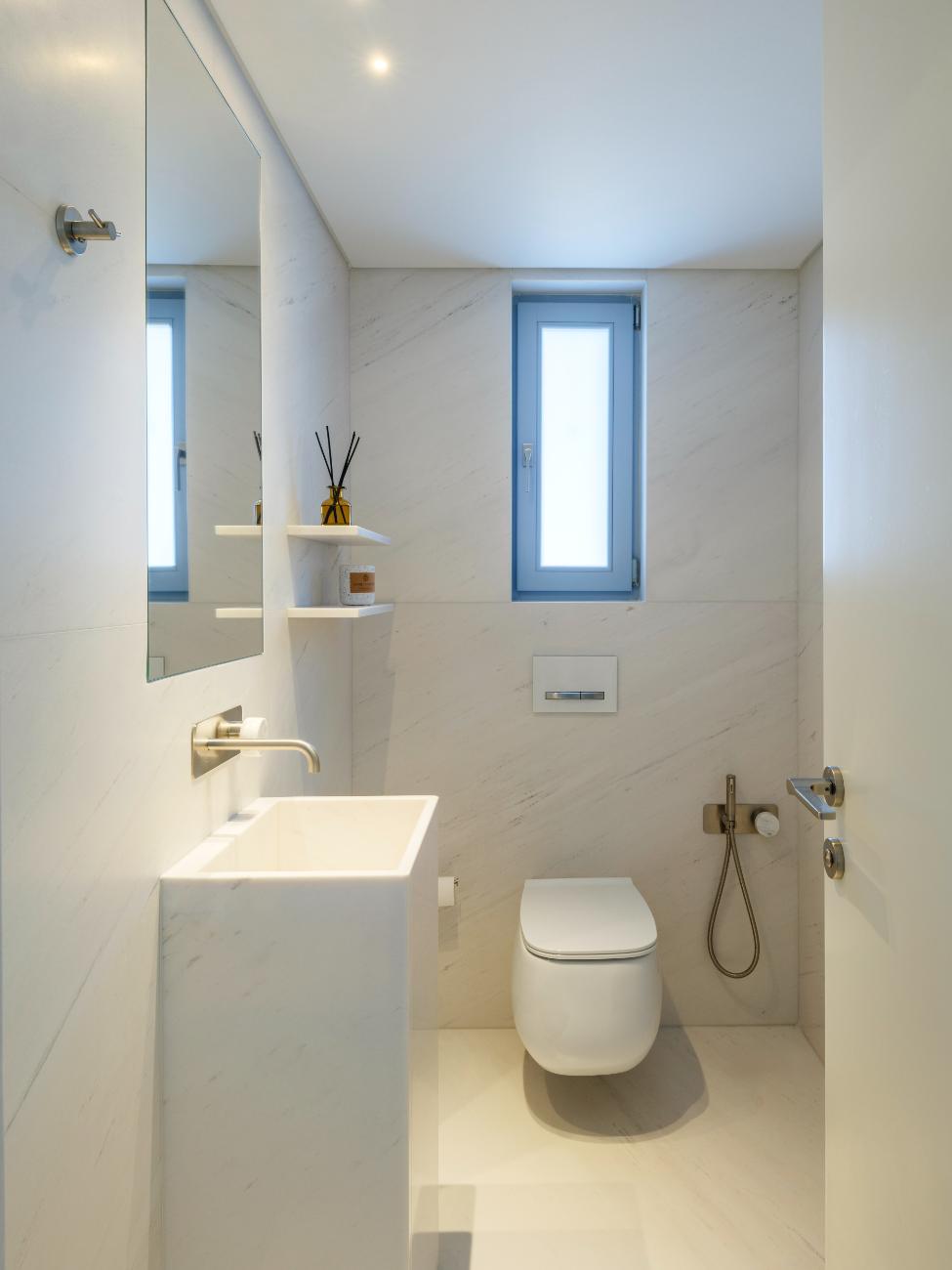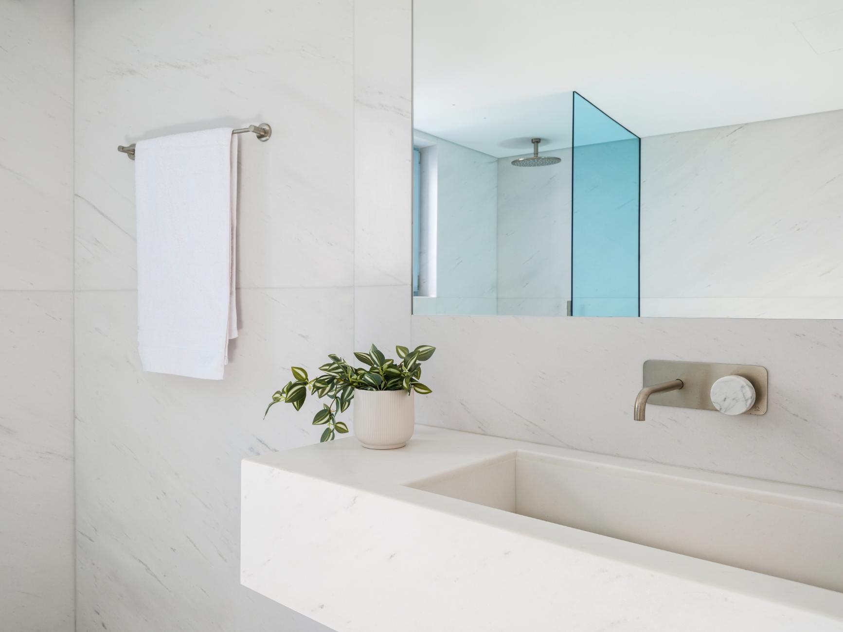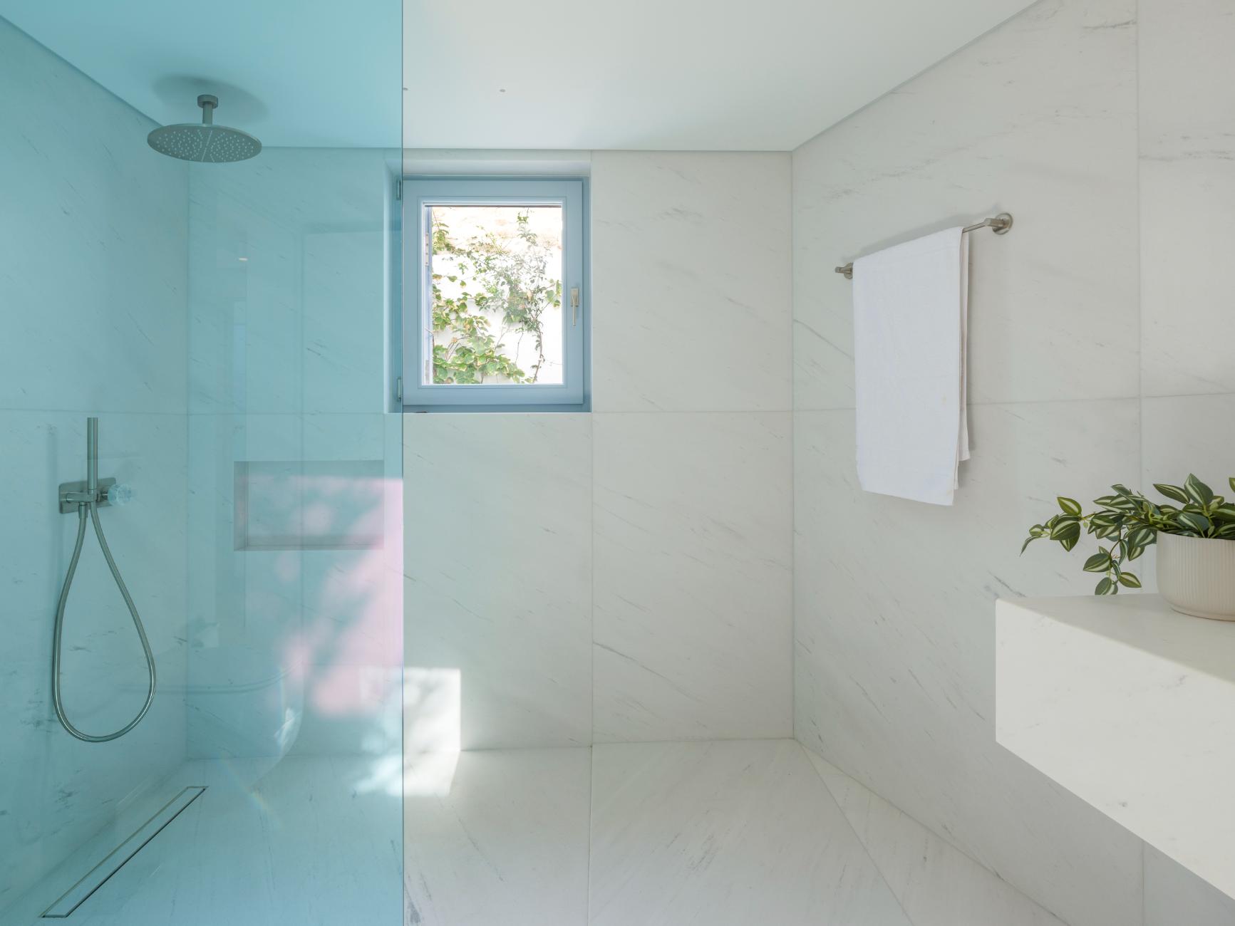 From here, you can see straight through to the outdoor pool area, while the indoor dining space comfortably hosts six for relaxed meals. The living room feels carved into the architecture itself, with built-in sofas, a smart TV and a fireplace for cooler evenings, plus thoughtful touches like large mirrors and a convenient guest WC that make hosting easy and comfortable.