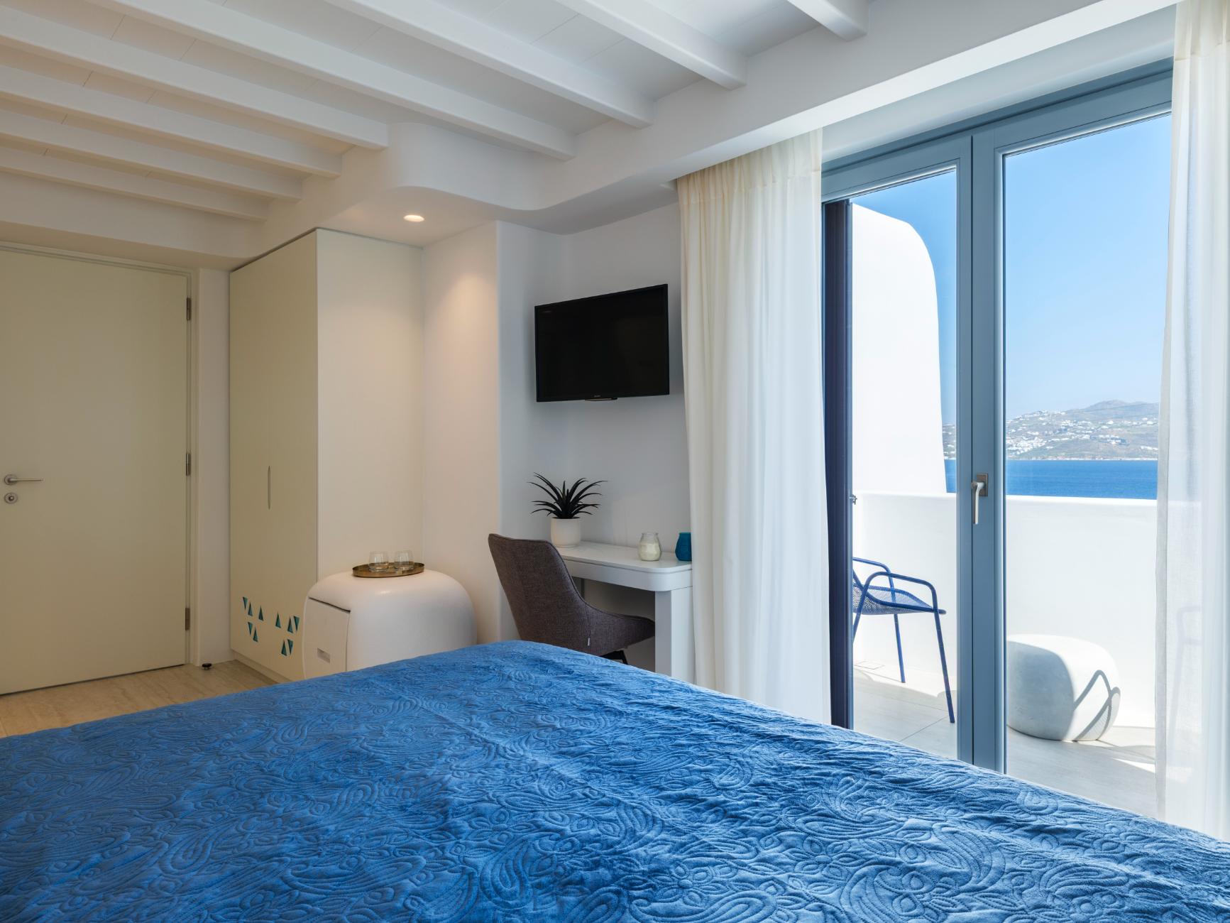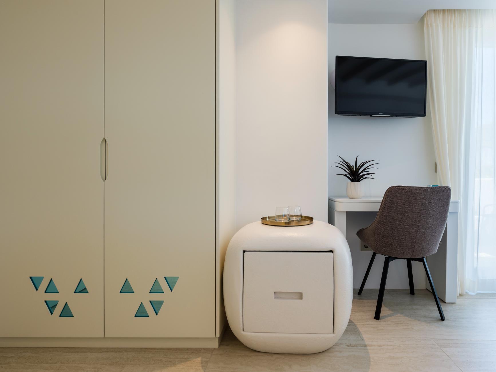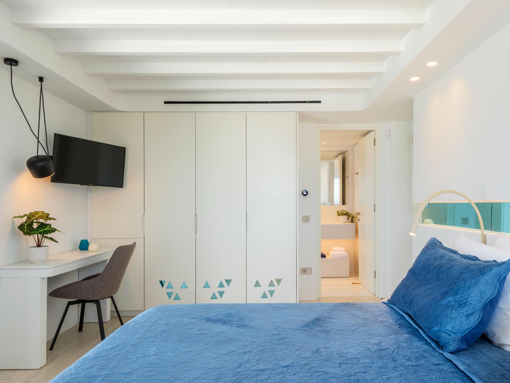 On the same level, the first bedroom is a spacious 22 sqm retreat with a built-in double bed, TV, safe box and closet, paired with an en-suite bathroom featuring a rainfall shower. Balcony doors open directly to the outside, so the day can begin with sea air and end with a quiet nightcap under the stars. Upstairs, two more 22–24 sqm bedrooms continue the same calm, elevated style, each with a built-in queen bed, TV, safe box, closet and a practical desk, plus a mini fridge for chilled water and sunset spritzes. Both rooms enjoy balcony access and wide sea-and-sunset views that feel like a private show.