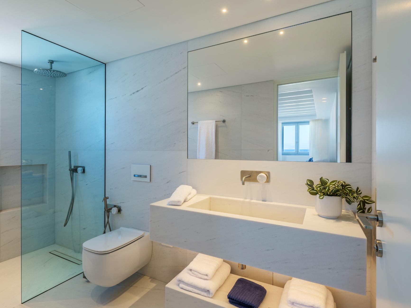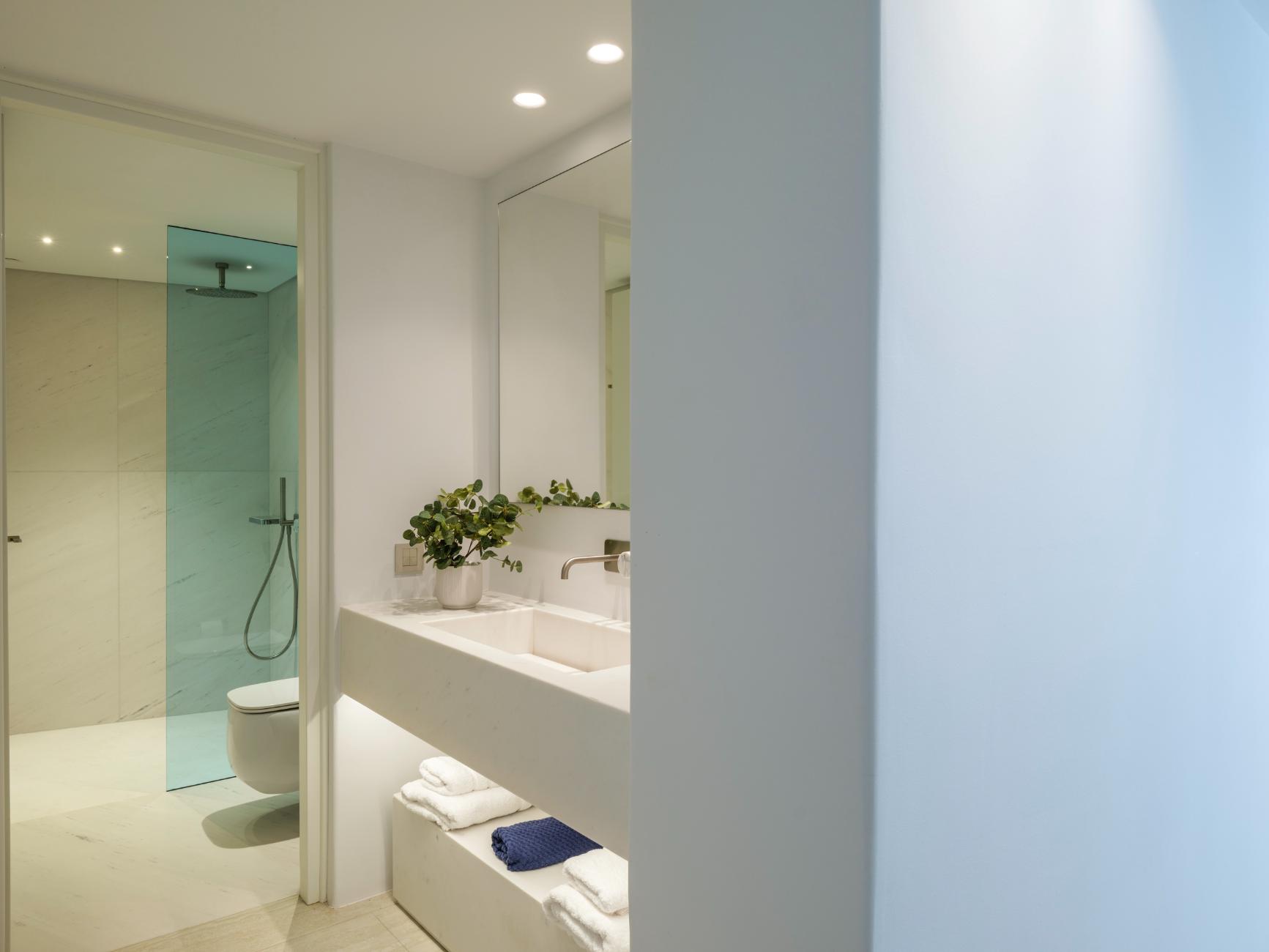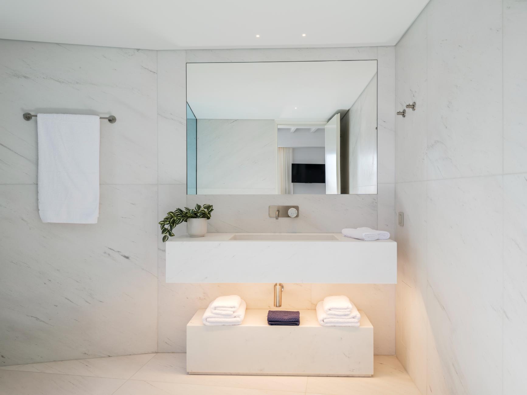 On the same level, the first bedroom is a spacious 22 sqm retreat with a built-in double bed, TV, safe box and closet, paired with an en-suite bathroom featuring a rainfall shower. Balcony doors open directly to the outside, so the day can begin with sea air and end with a quiet nightcap under the stars. Upstairs, two more 22–24 sqm bedrooms continue the same calm, elevated style, each with a built-in queen bed, TV, safe box, closet and a practical desk, plus a mini fridge for chilled water and sunset spritzes. Both rooms enjoy balcony access and wide sea-and-sunset views that feel like a private show.