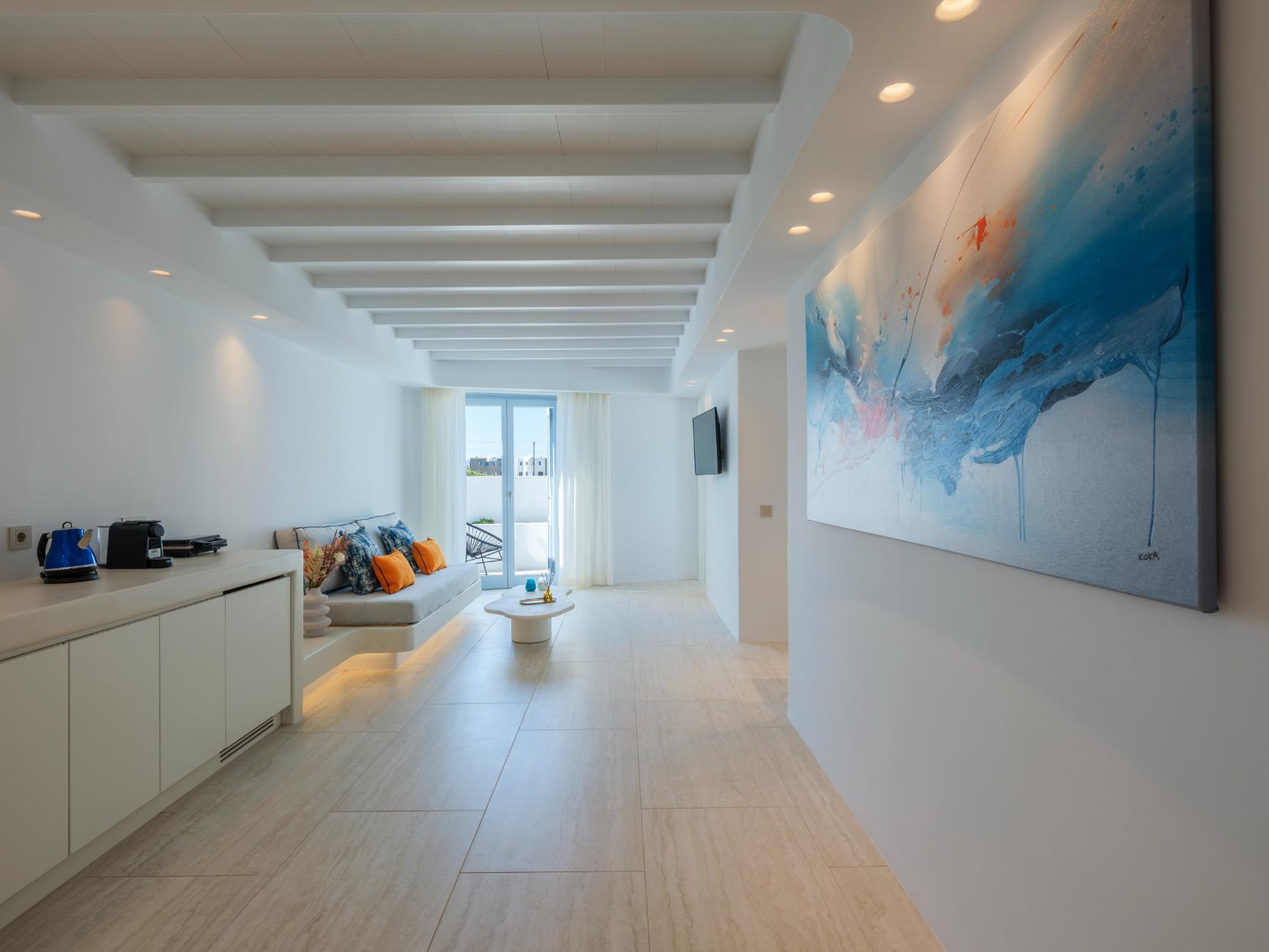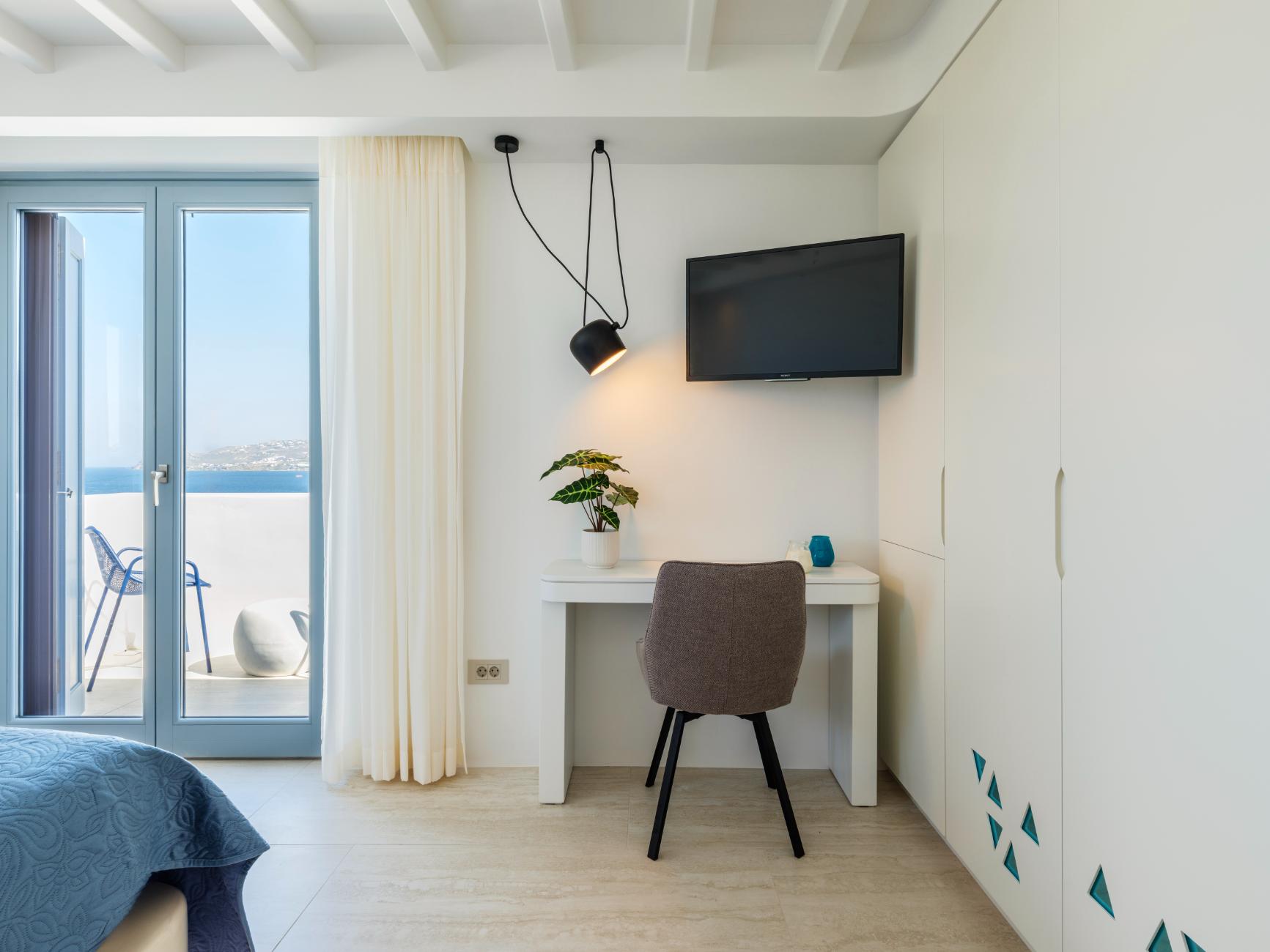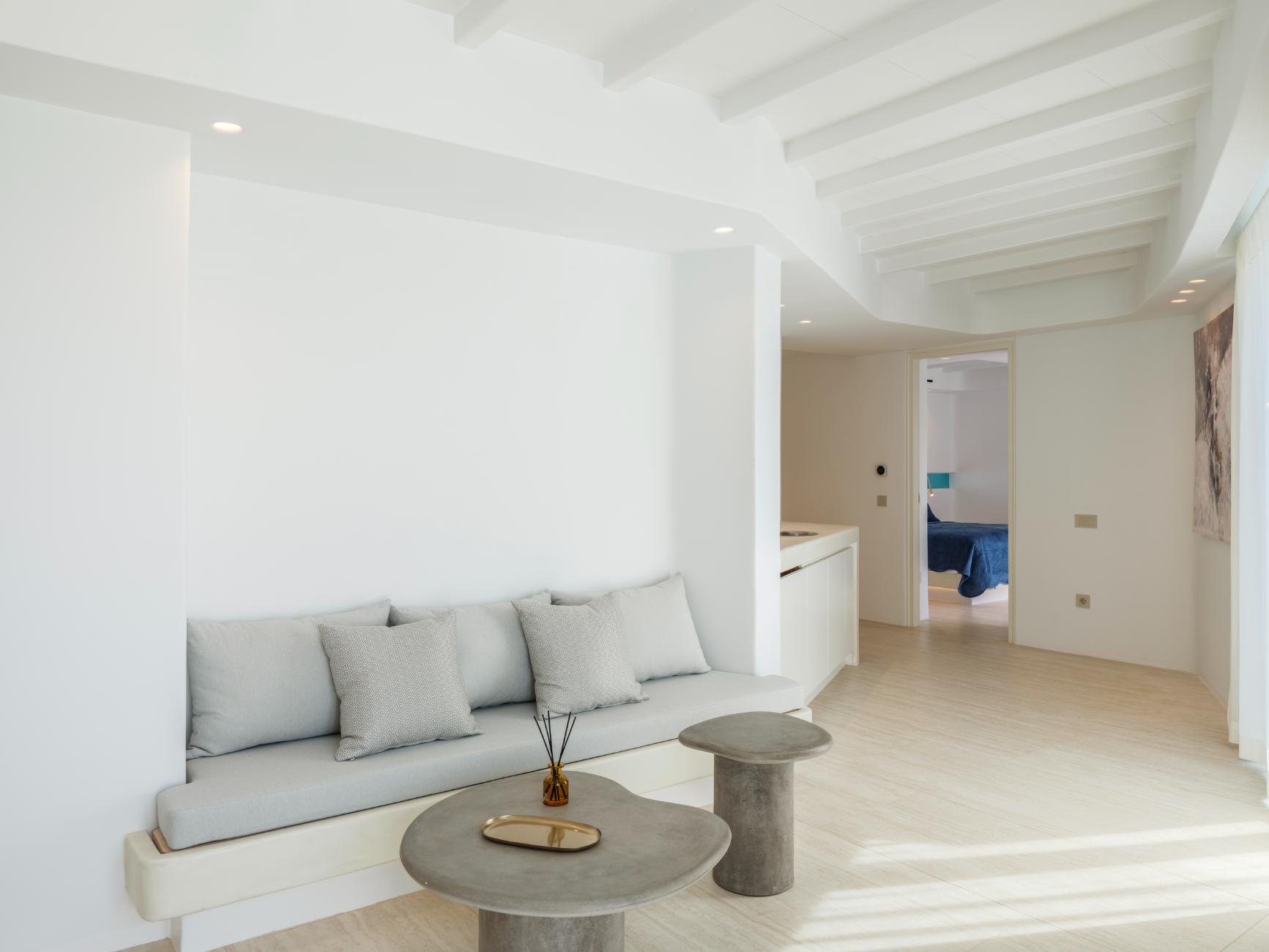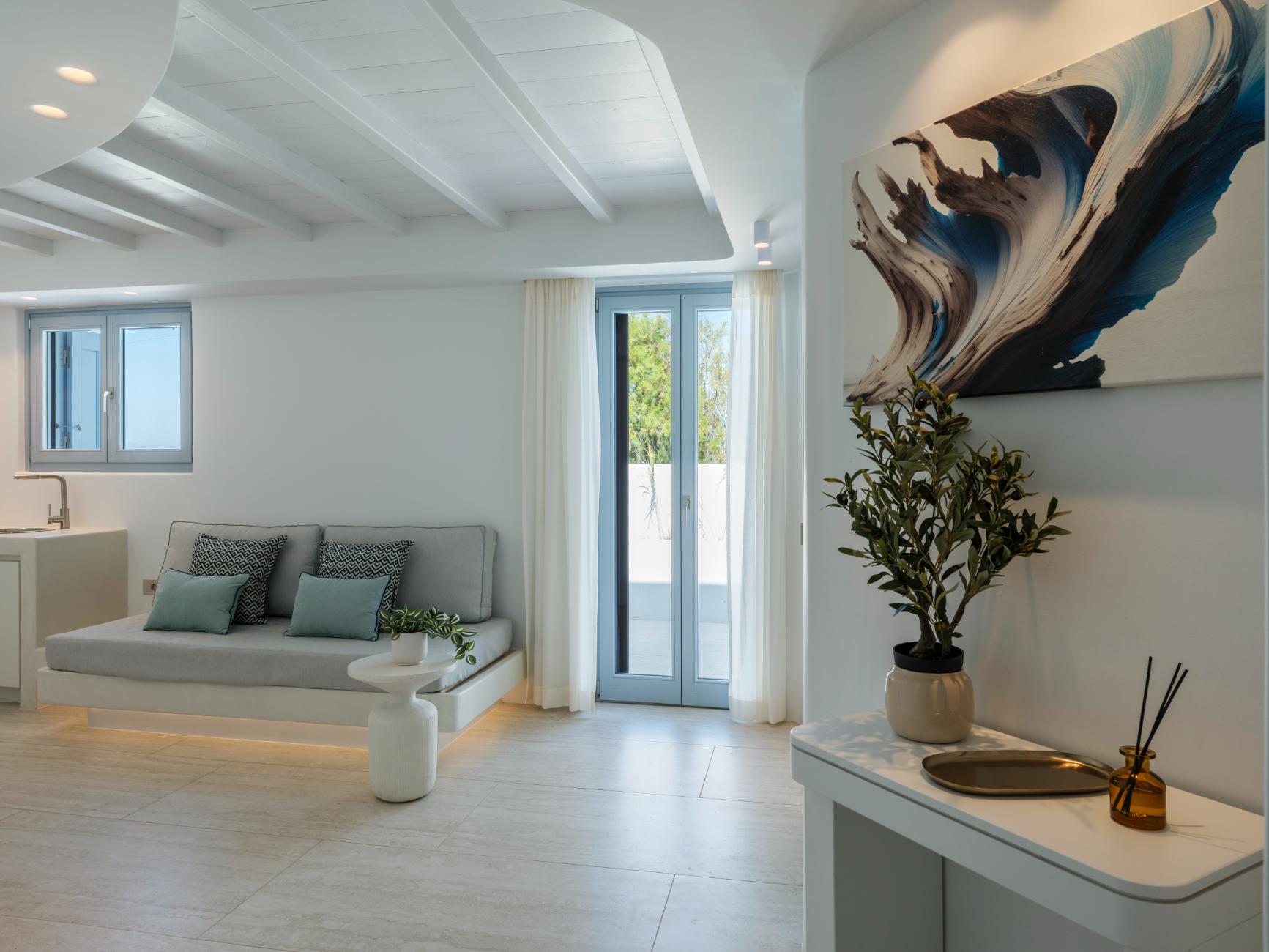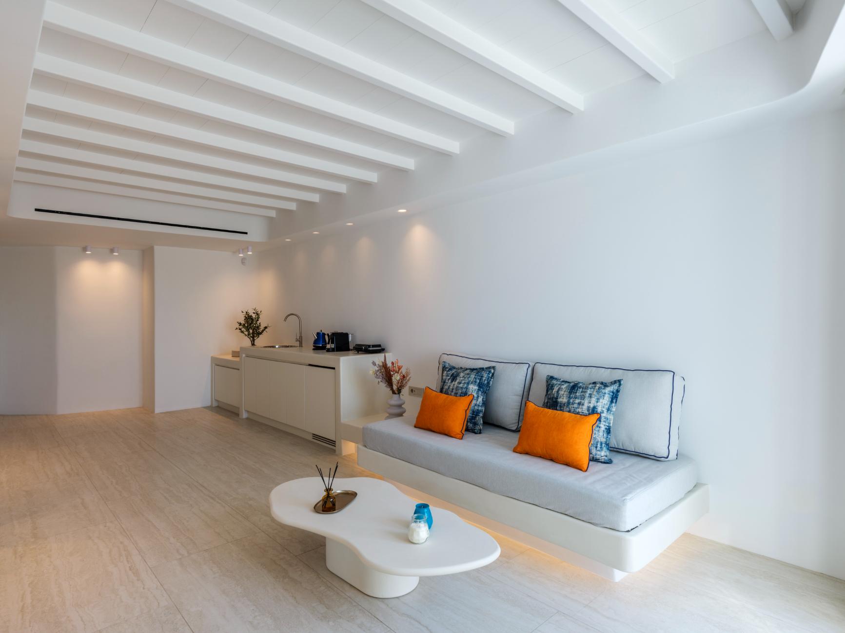 A separate, independent lower level leads to three large suites, ideal for families traveling together or groups who want privacy without losing togetherness. Each suite includes a living area with a single sofa bed (90 x 200), a kitchenette, a separate bedroom with a built-in bed, a safe box and ample storage, plus a spacious en-suite bathroom with a rainfall shower. The standout is what happens beyond the balcony doors: every suite opens to its own private terrace with a heated jacuzzi, creating a true “suite experience” that’s rare even among top-tier Mykonos Villas. Suite terraces range from approximately 21 sqm to expansive 38–43 sqm, all facing the sea.