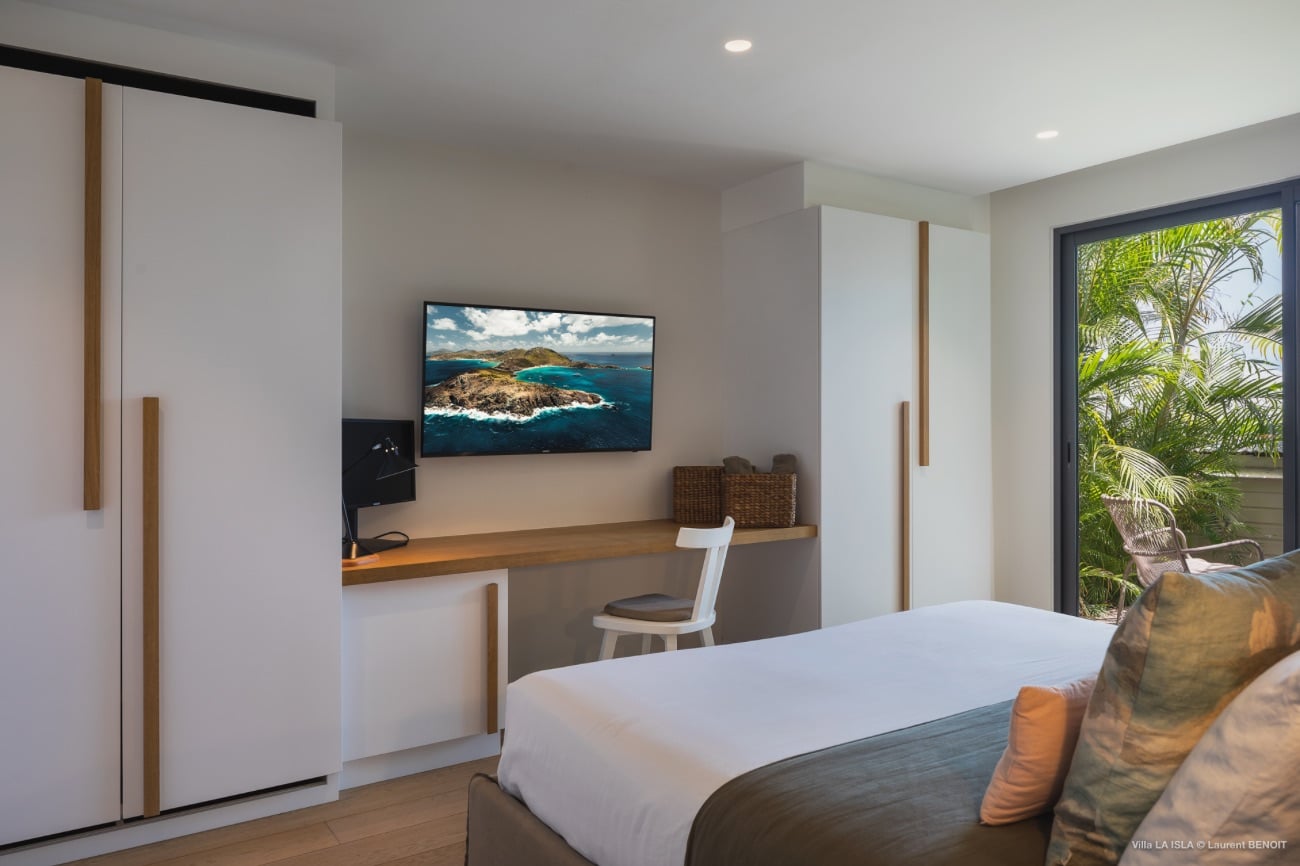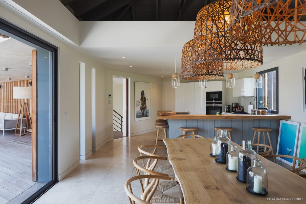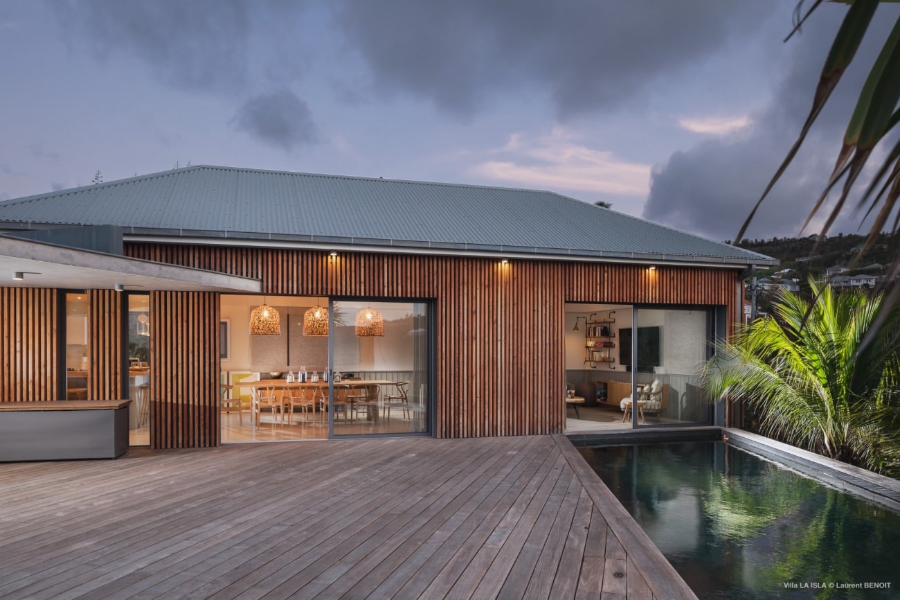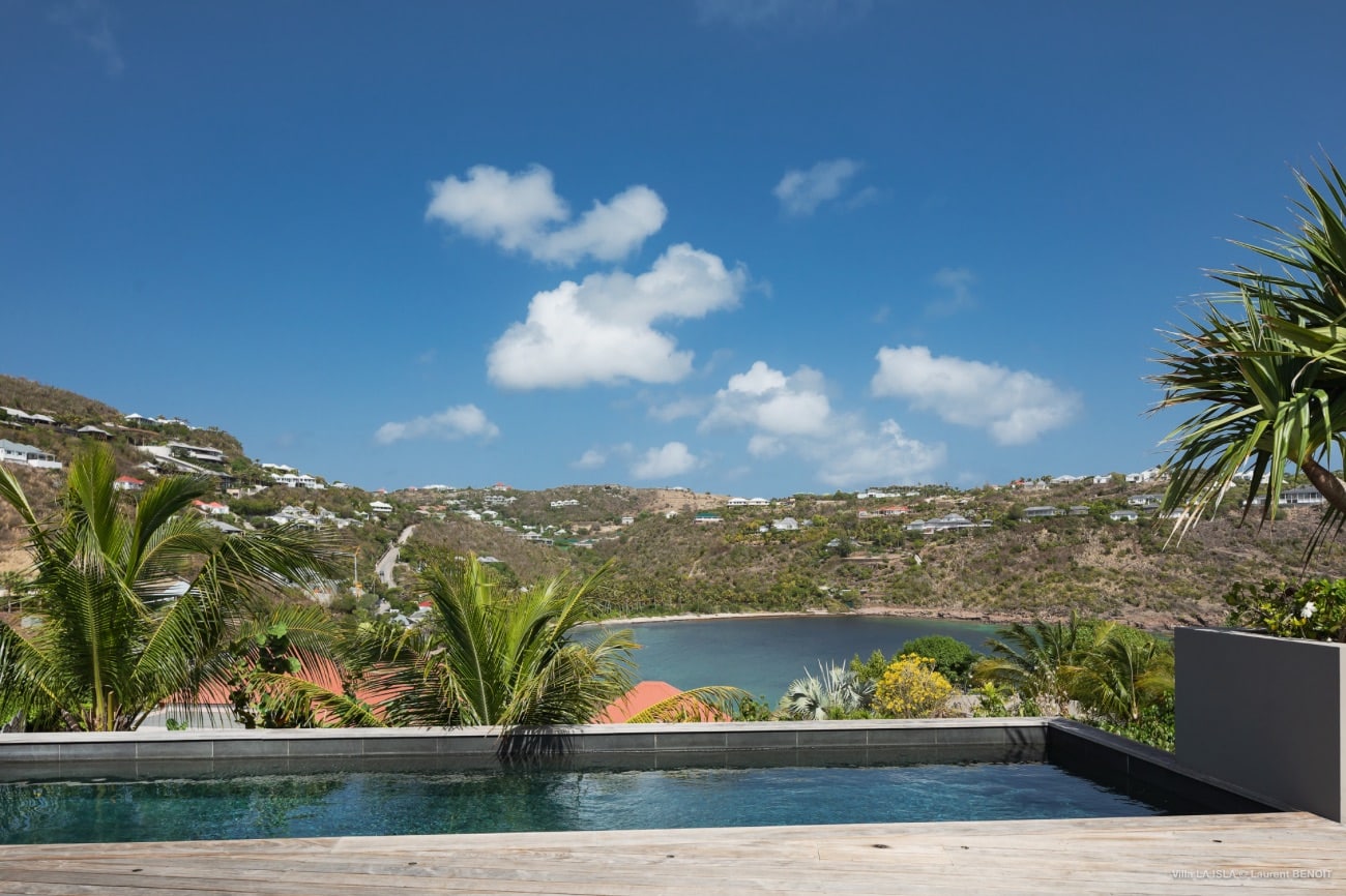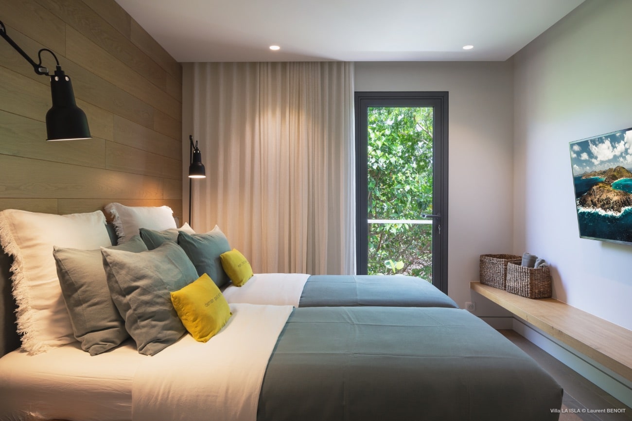 Villa La Isla stands out for its unique combination of modern architecture and warm wood details with genuine bay-view tranquility in Marigot. Its four equal king-bed suites open to a private outdoor area, providing hotel-level privacy in a single, tastefully designed residence.