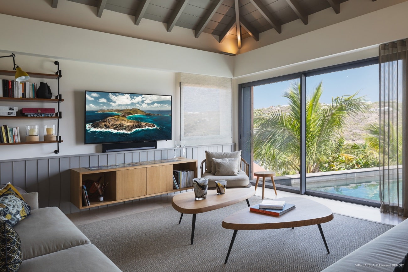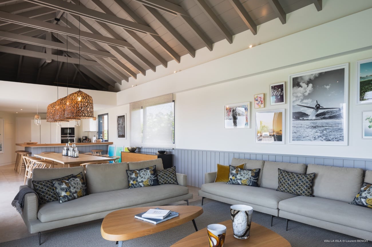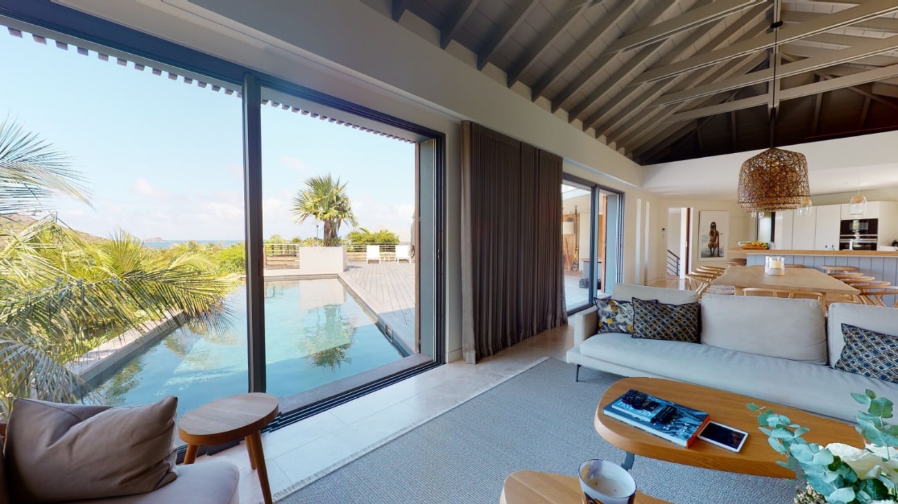 The ocean breeze enters the house through the floor-to-ceiling doors, stirring the soft linen and bringing with it the aroma of palm and salt. The contemporary lines of this four-bedroom retreat, which is spread across two floors in a quiet area of Marigot, are warmed by wood cladding and vaulted ceilings, giving the interiors a sculptural and incredibly calming feel. The covered lounge along the façade becomes the natural gathering spot in the afternoon, shaded and airy, with cushions that seem to hold the day’s cool even as the sun slips toward the headland. The main living pavilion opens completely to the terrace and pool, framing the quiet blue of the bay and hills folded in green.