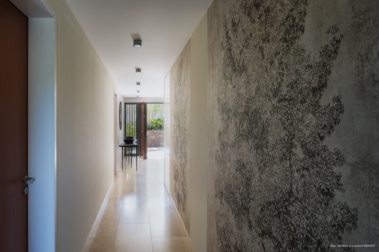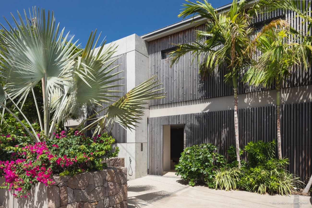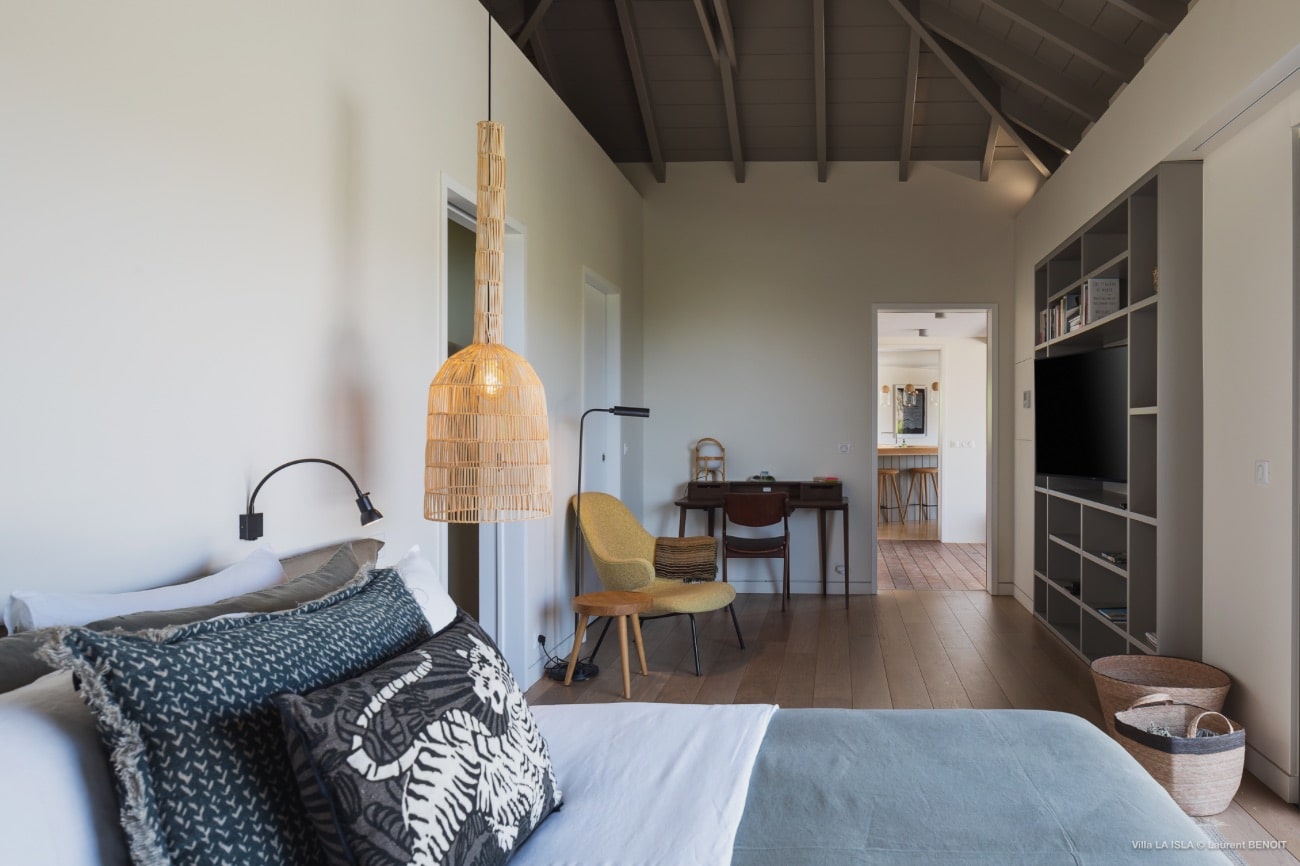 The ocean breeze enters the house through the floor-to-ceiling doors, stirring the soft linen and bringing with it the aroma of palm and salt. The contemporary lines of this four-bedroom retreat, which is spread across two floors in a quiet area of Marigot, are warmed by wood cladding and vaulted ceilings, giving the interiors a sculptural and incredibly calming feel. The covered lounge along the façade becomes the natural gathering spot in the afternoon, shaded and airy, with cushions that seem to hold the day’s cool even as the sun slips toward the headland. The main living pavilion opens completely to the terrace and pool, framing the quiet blue of the bay and hills folded in green.
