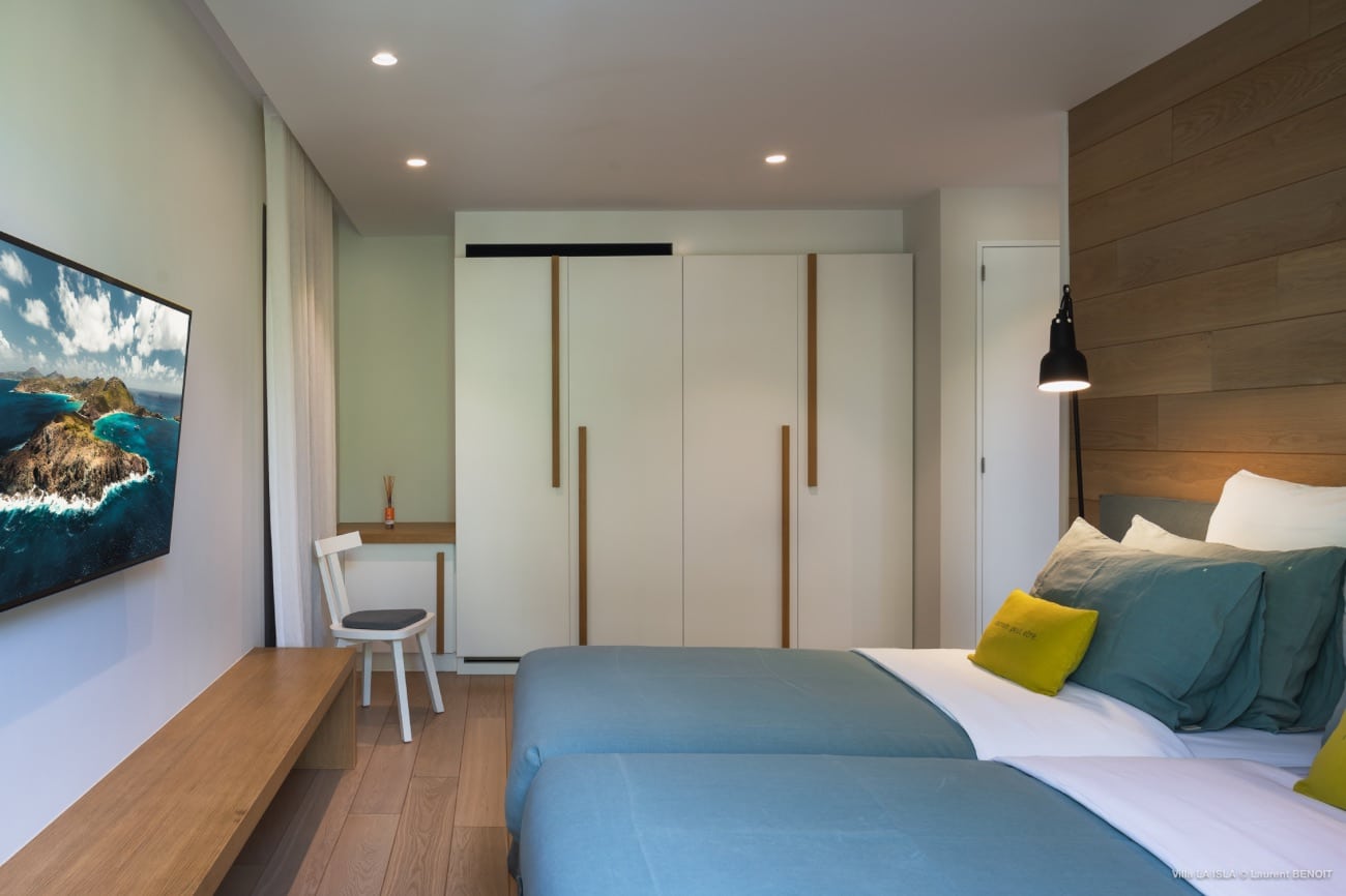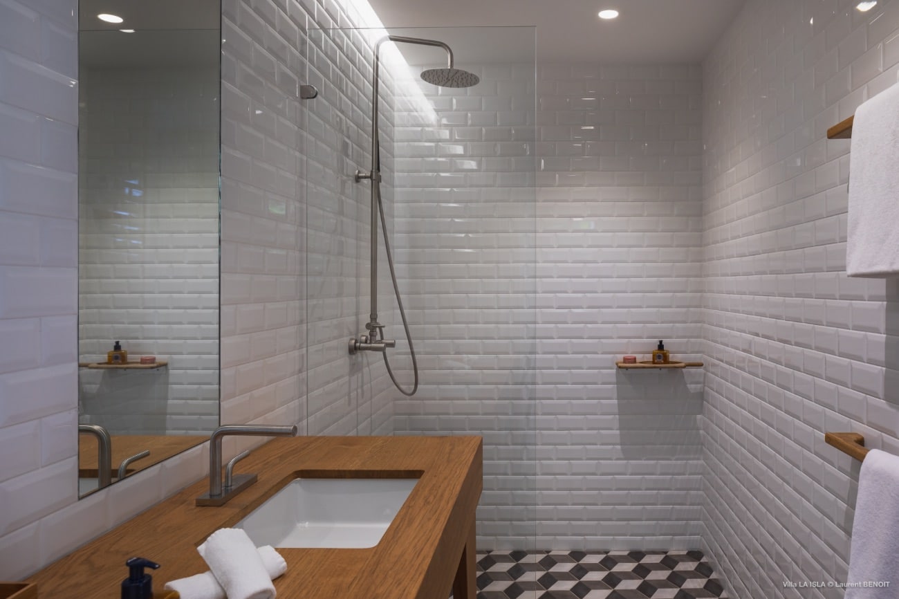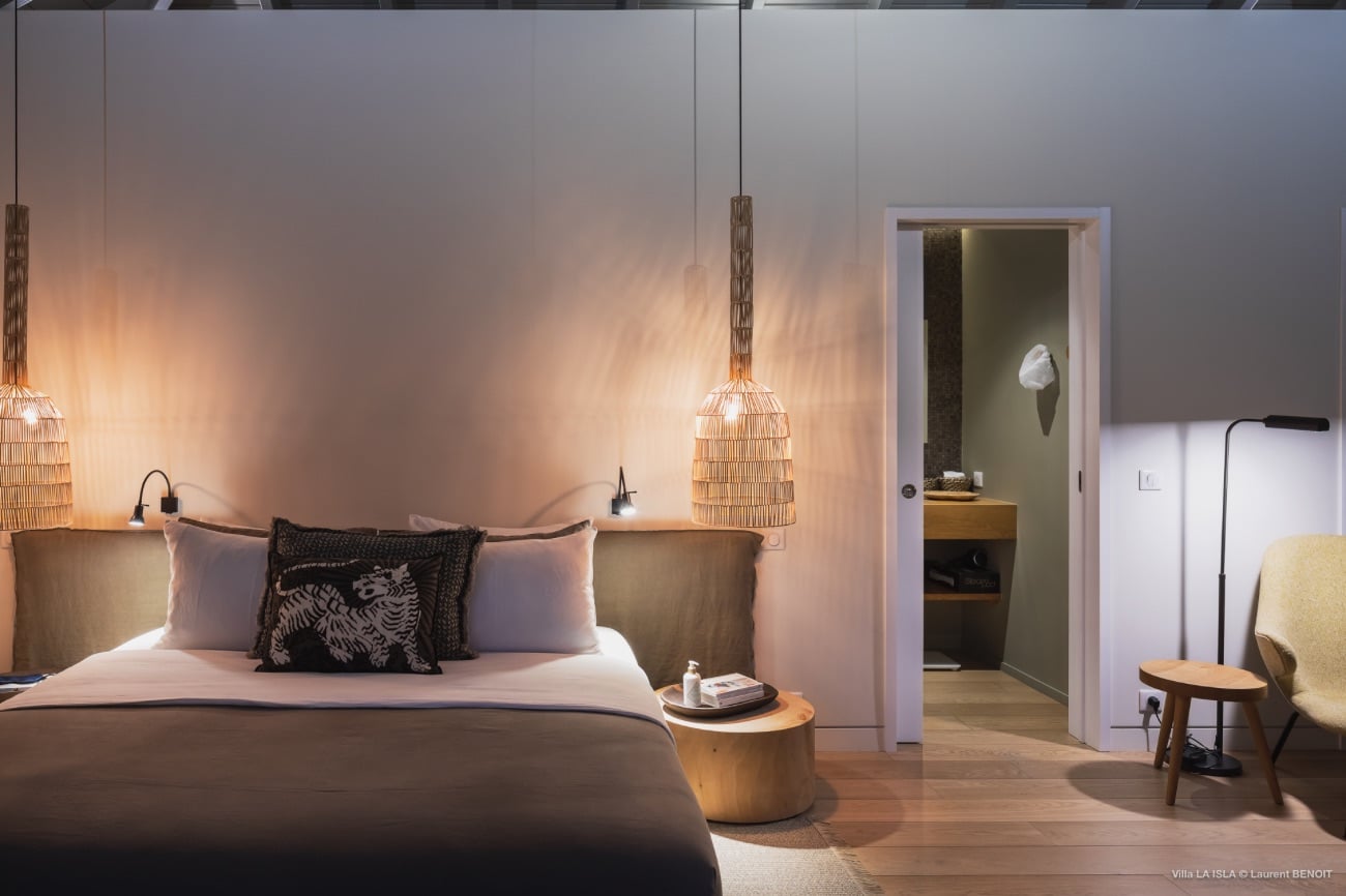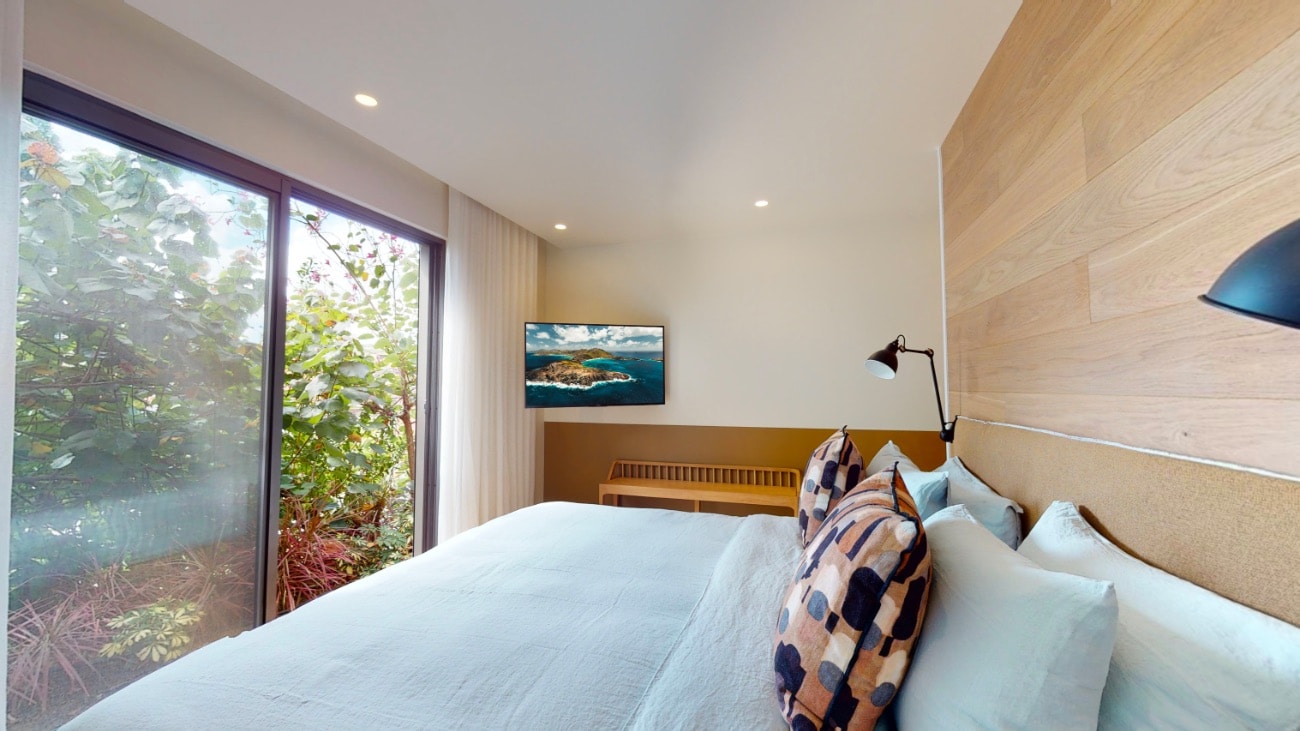Black-out treatments make sleep as opulent as the scenery, and office nooks allow you to take a quick break for a few emails before continuing with your day. A few steps away, the outdoor lounge captures the trade winds and the last of the light, making it a great spot to pour a ti’ punch and watch the sky change. The pool itself is situated on a wide deck with loungers and umbrellas, and its water is the color of the bay on a bright morning.