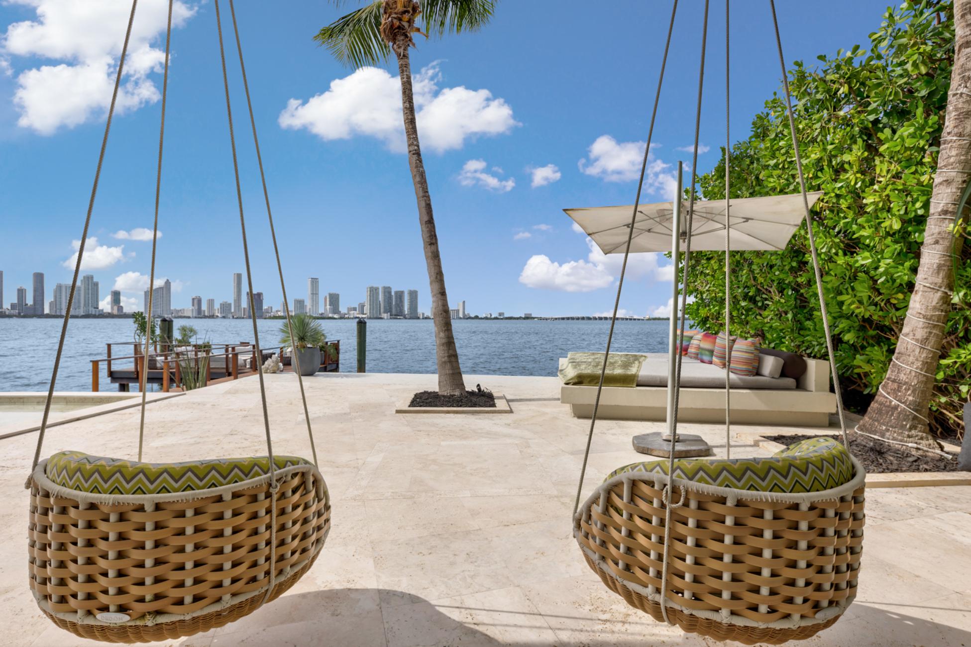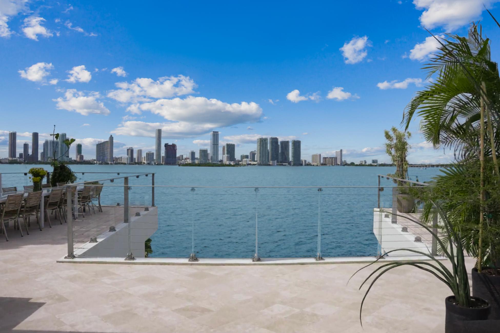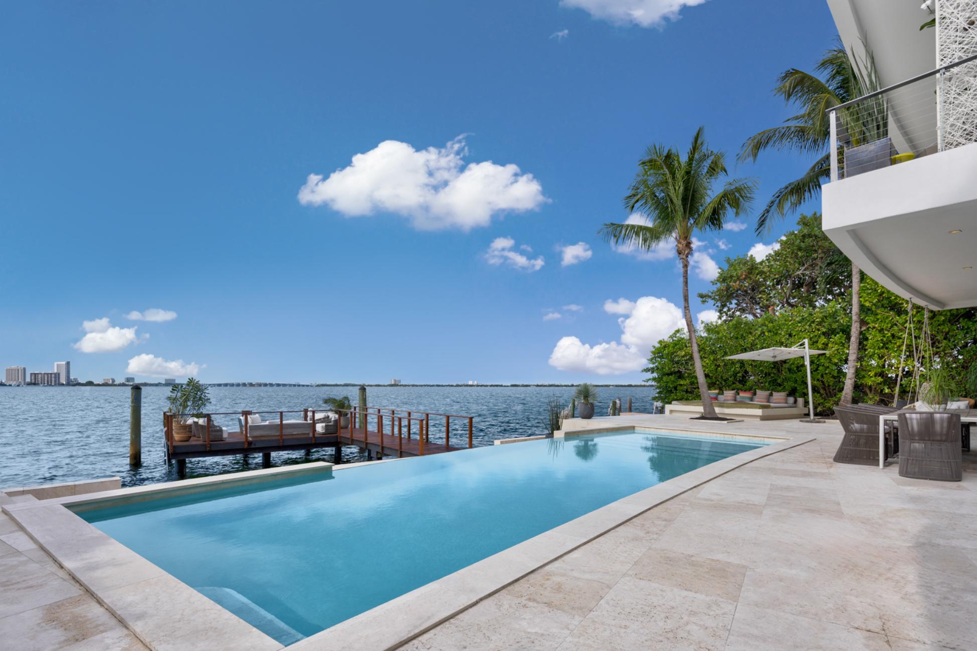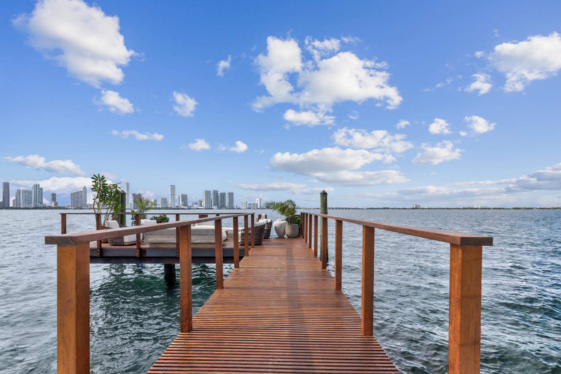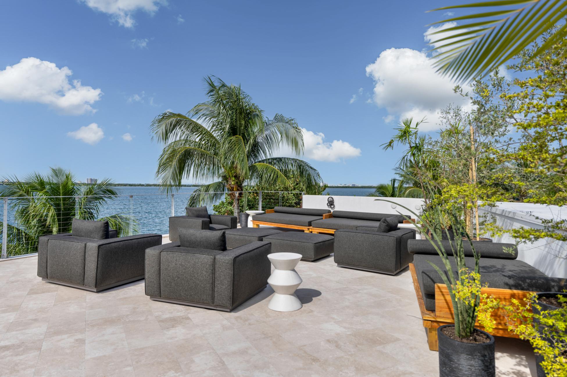 Outside, Villa Libelle truly comes alive. One hundred feet of prime waterfront frame an expansive Ipe wood dock ideal for yachting arrivals or sunset reflections. A heated pool mirrors the sky, while the Boffi outdoor kitchen sets the stage for leisurely lunches that stretch into starlit dinners. Above it all, the rooftop terrace offers a rare 360-degree panorama spanning downtown Miami, Miami Beach, and open water, a vantage point few Miami Villas can claim.