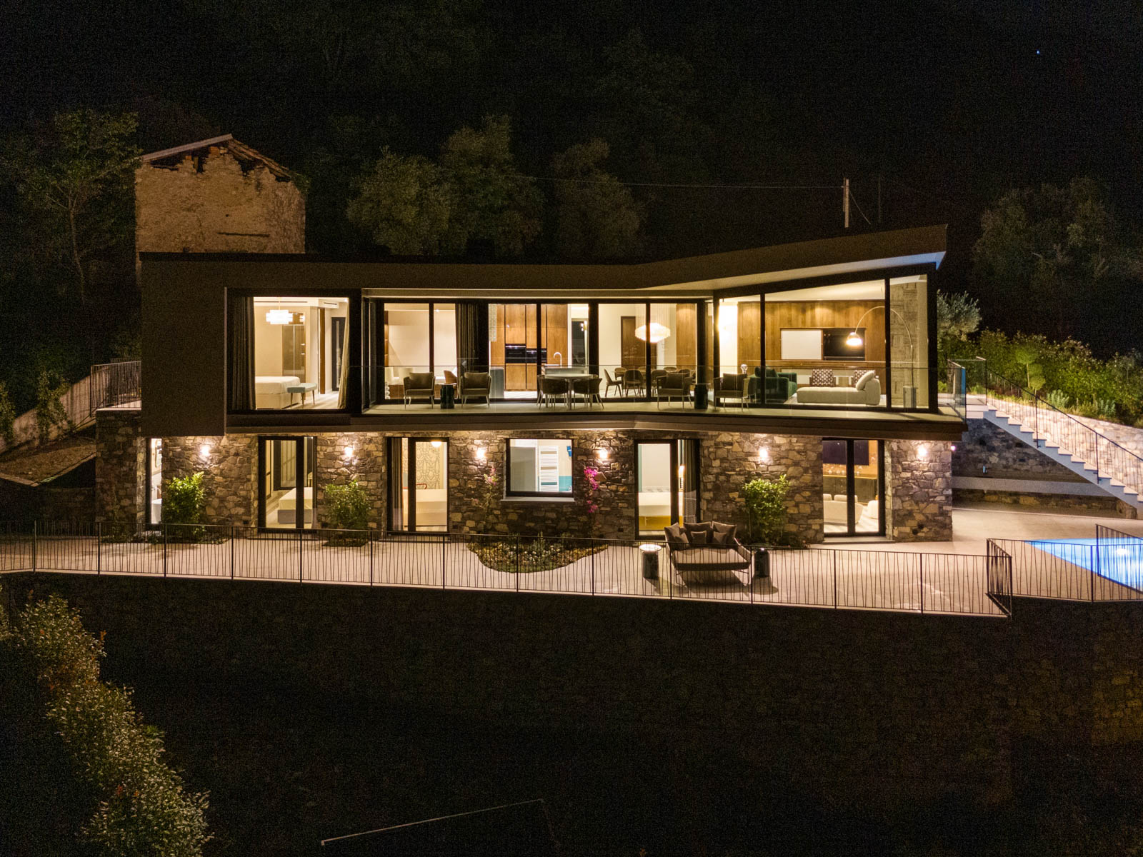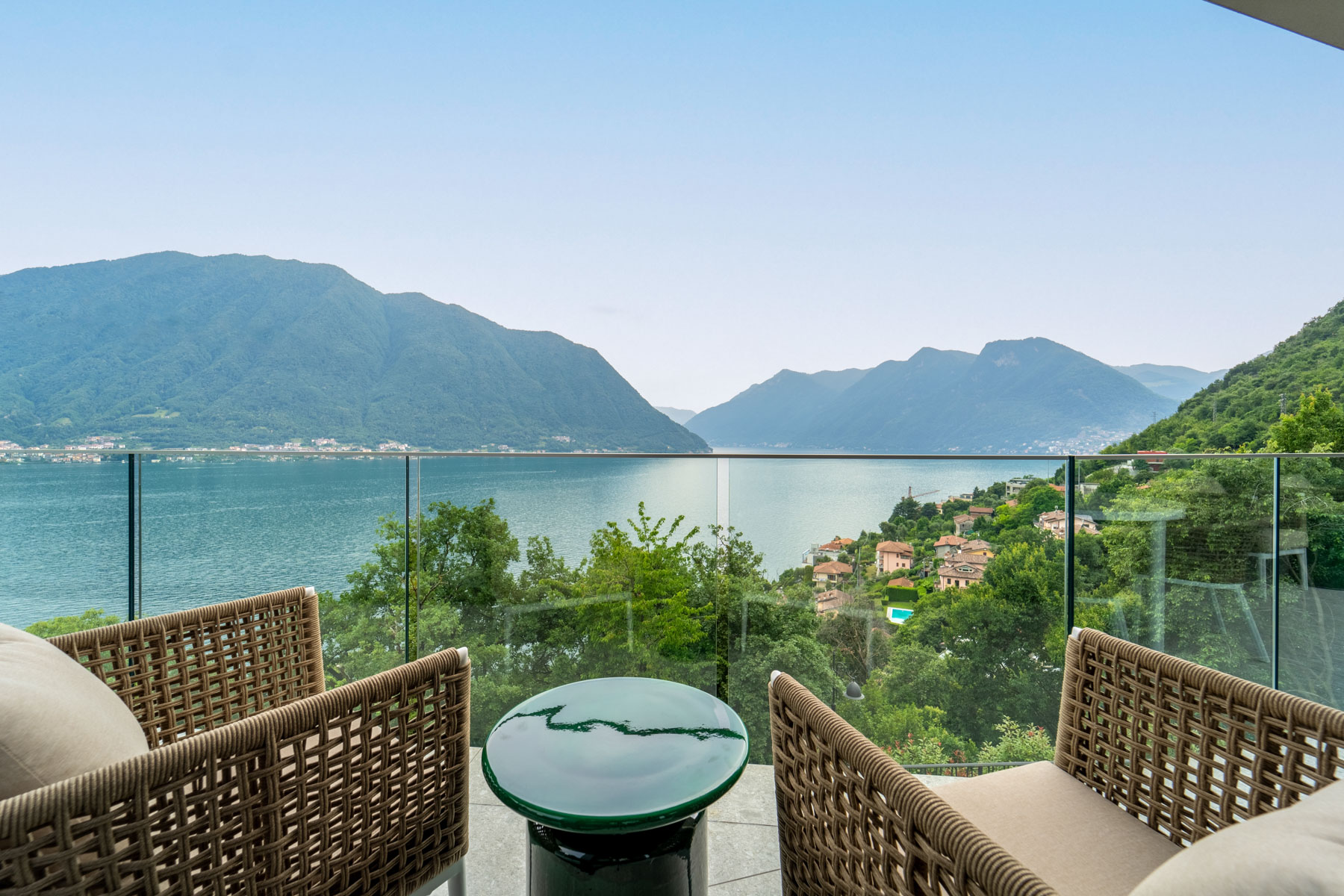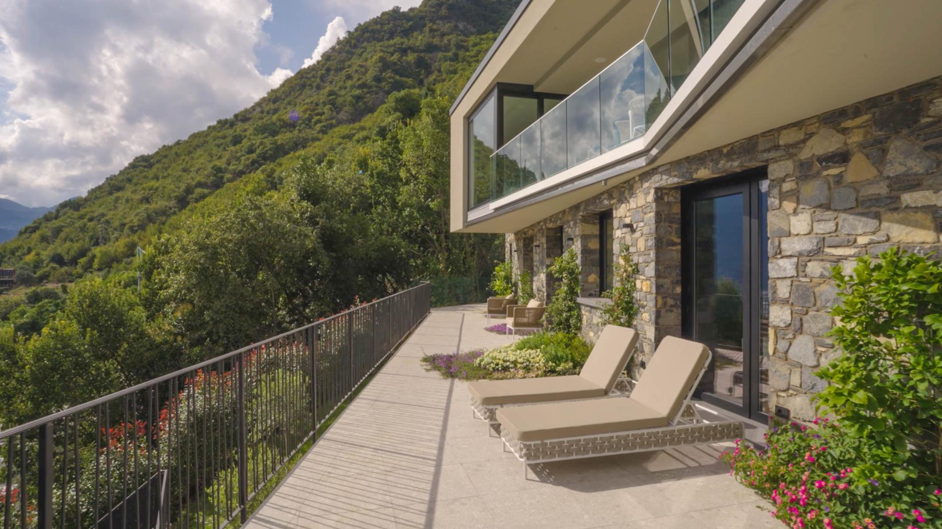 Outdoor life is the heart of Luminora. A wrap-around balcony on the main floor leads to an expansive lower terrace with multiple lounge areas, an alfresco dining setup, and the villa’s private heated pool. From every corner, you’ll enjoy sweeping views of one of the world’s most iconic lakes.