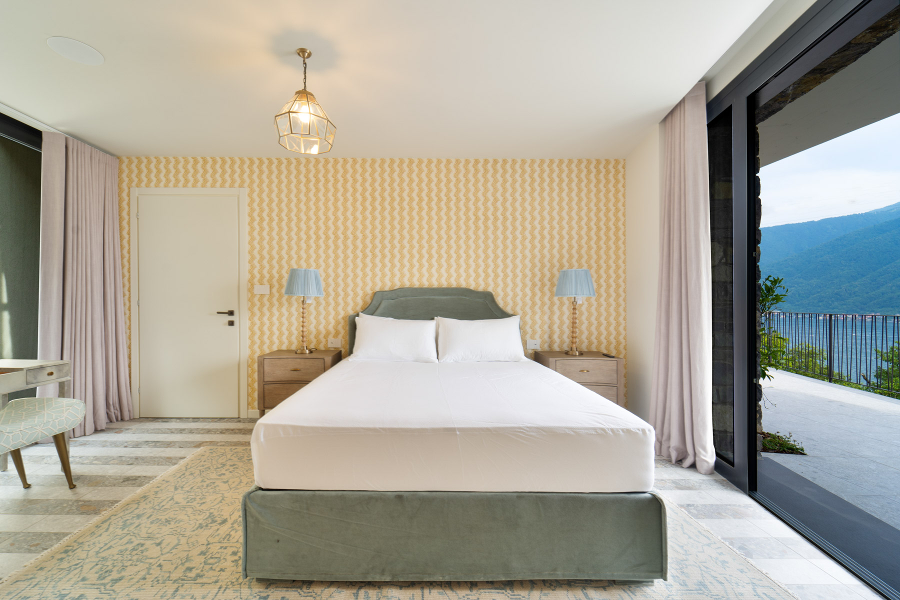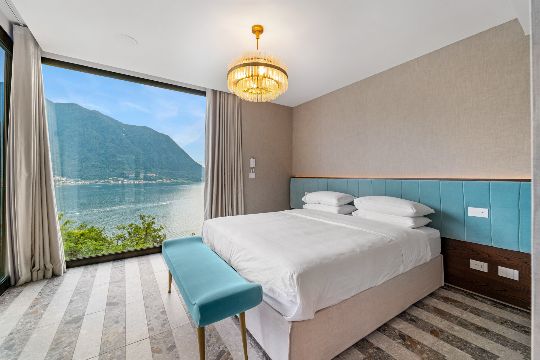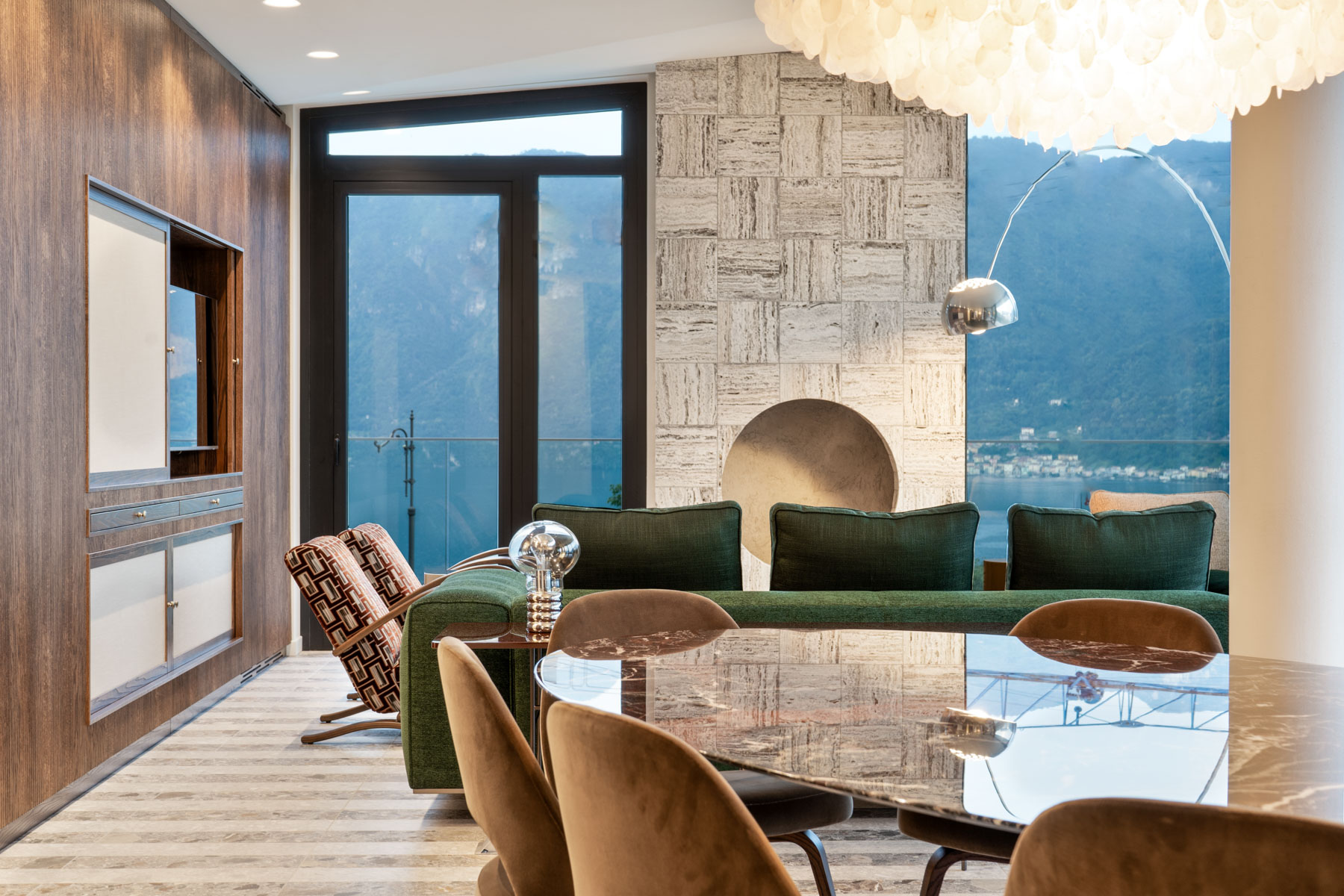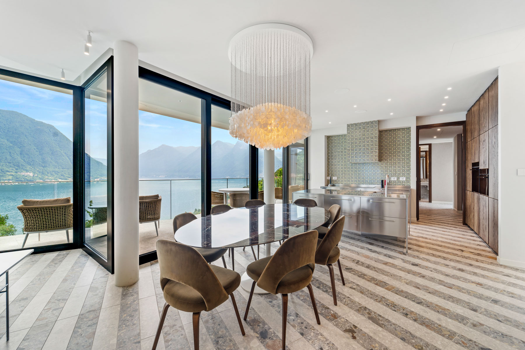 The main level is bright and open, with an elegant, contemporary flow designed to showcase the lake. A sleek kitchen with stainless-steel island and striped stone flooring anchors the space, while floor-to-ceiling glass doors frame Lake Como like a living artwork. Warm wood accents and a statement chandelier above the oval dining table create a sophisticated, welcoming mood—ideal for lingering meals and effortless entertaining.