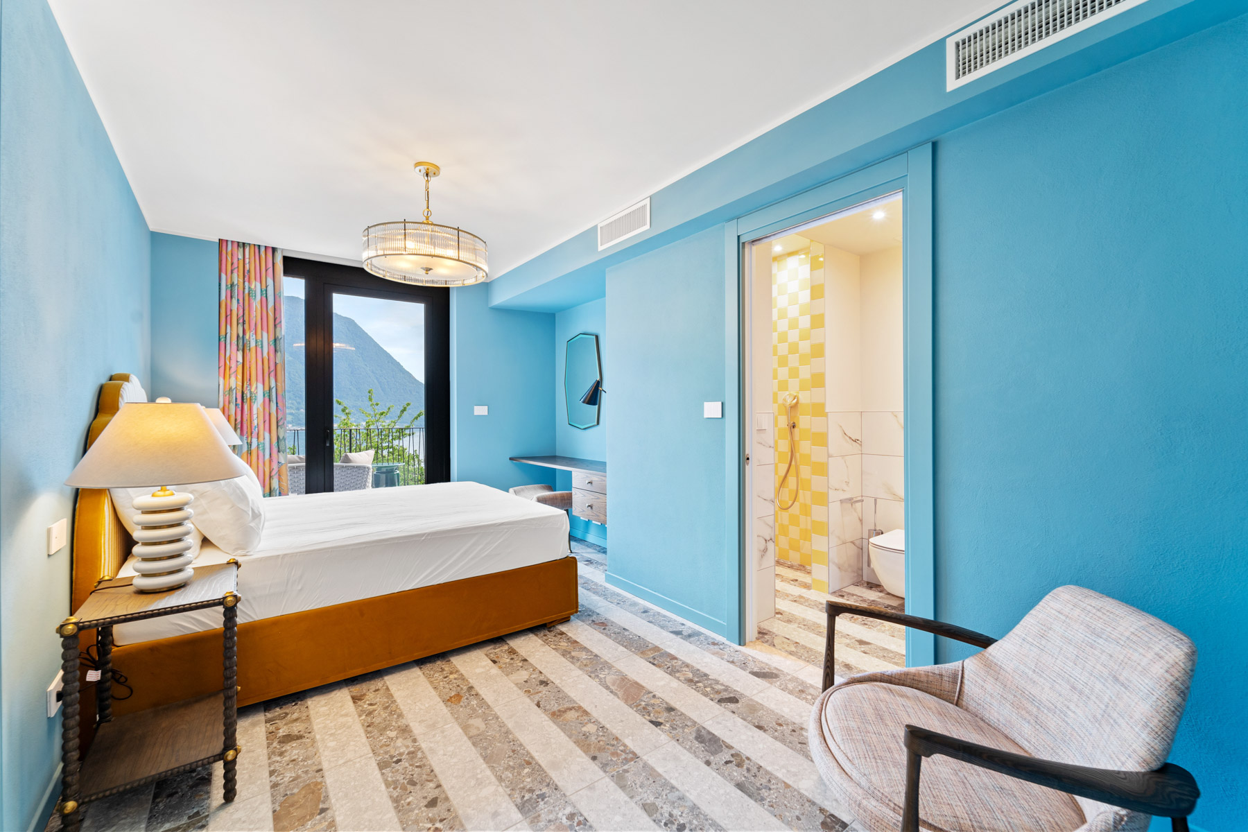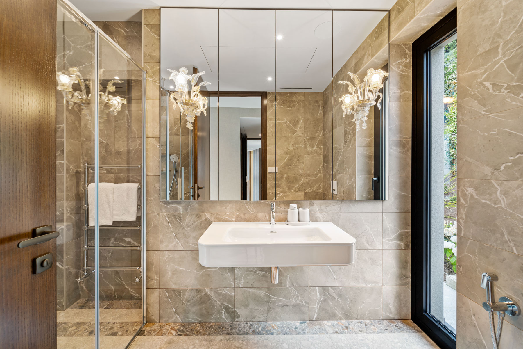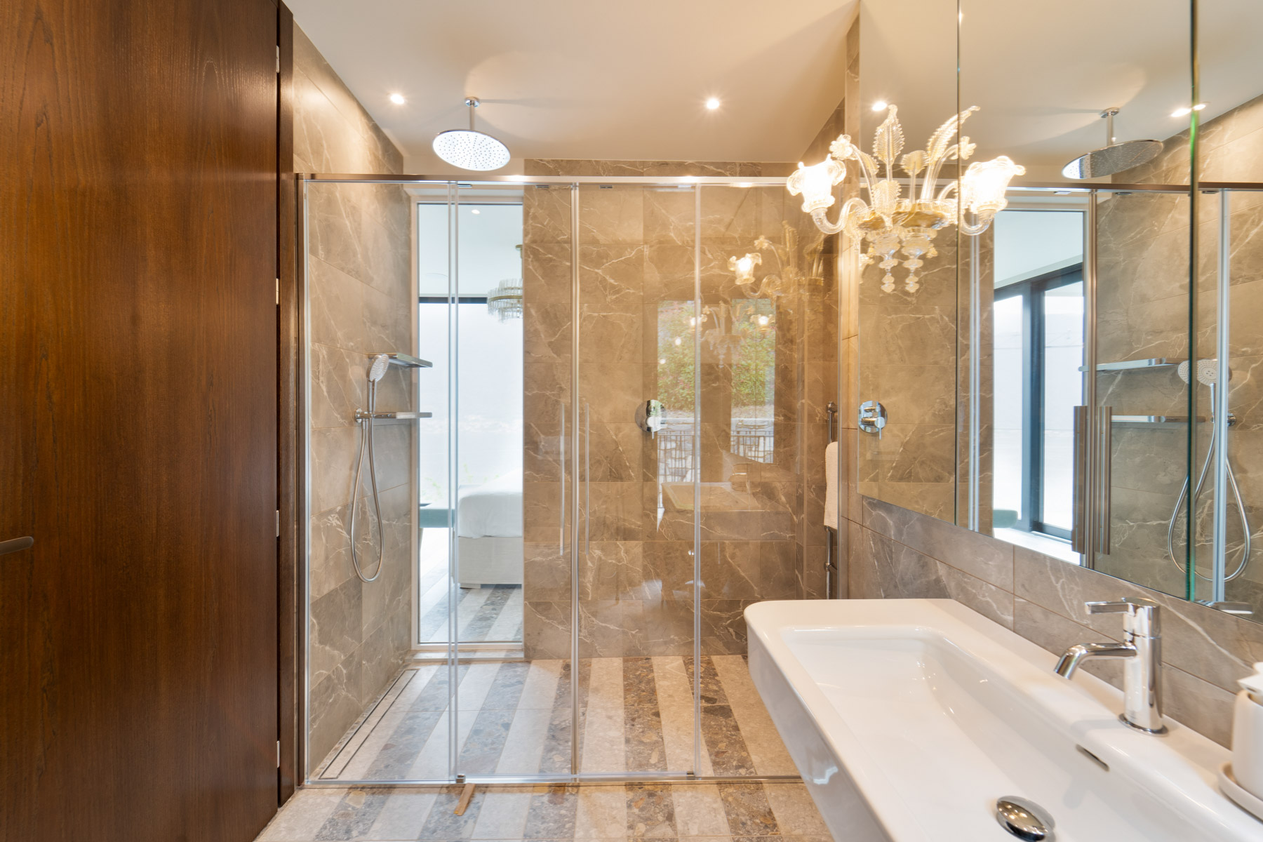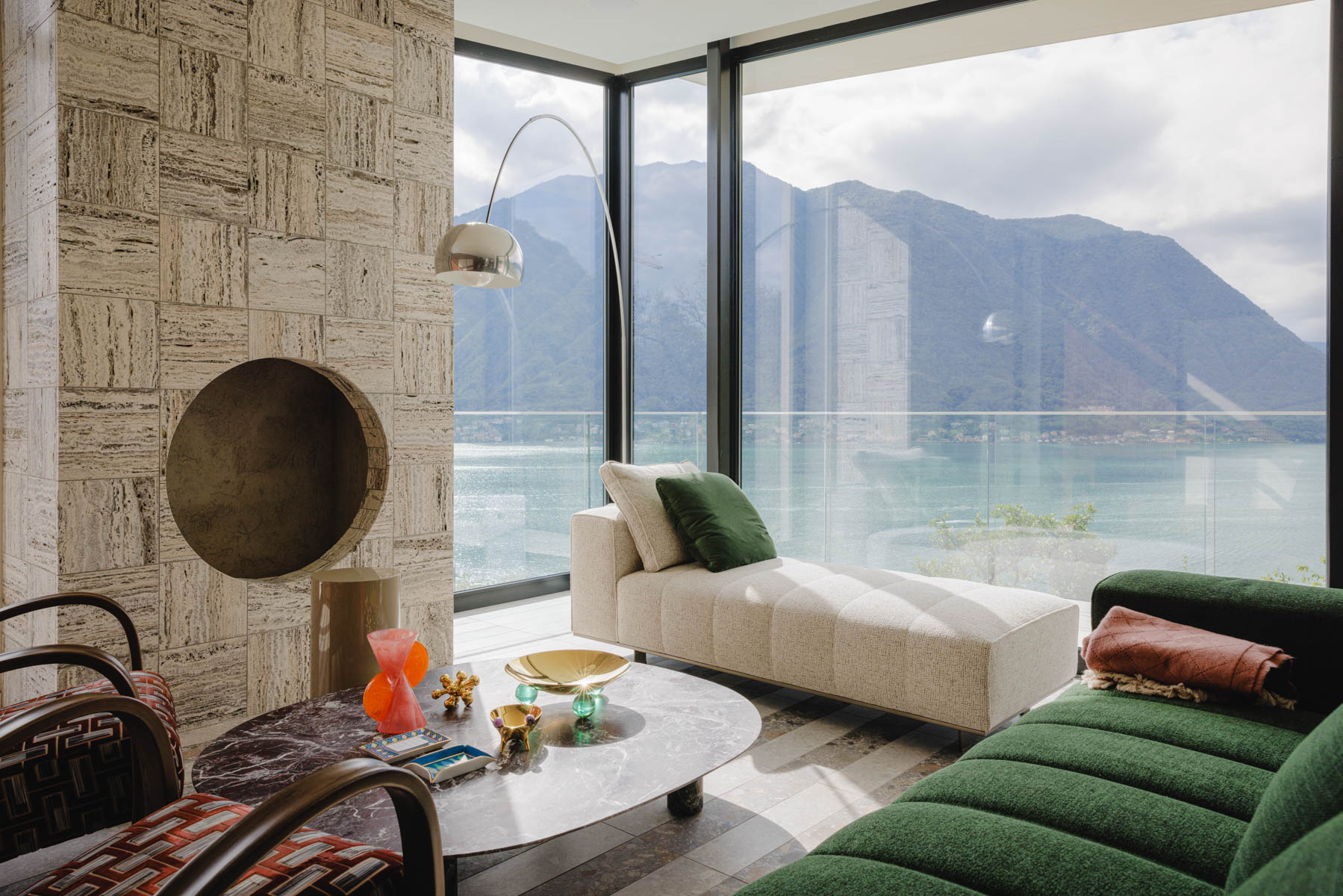 The main level is bright and open, with an elegant, contemporary flow designed to showcase the lake. A sleek kitchen with stainless-steel island and striped stone flooring anchors the space, while floor-to-ceiling glass doors frame Lake Como like a living artwork. Warm wood accents and a statement chandelier above the oval dining table create a sophisticated, welcoming mood—ideal for lingering meals and effortless entertaining.