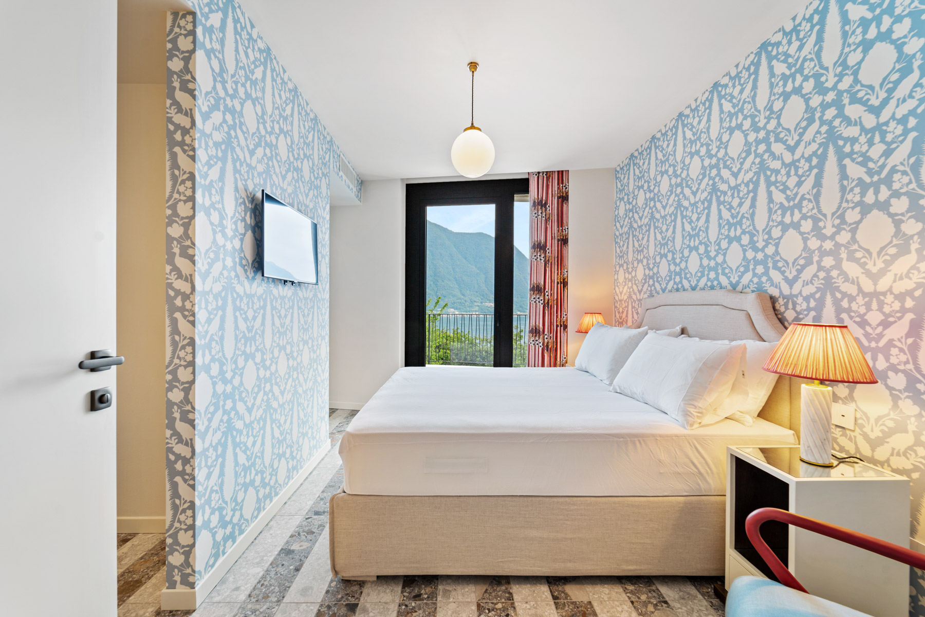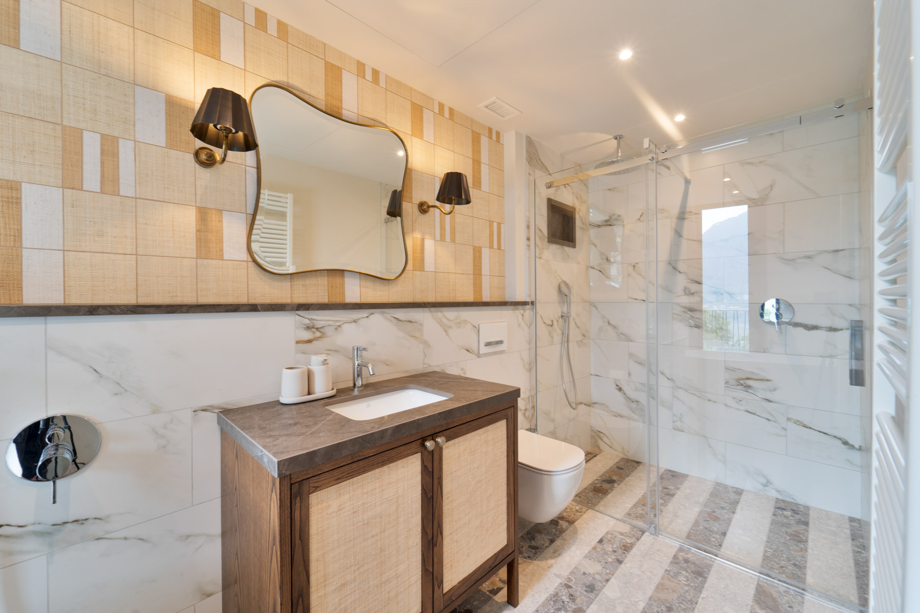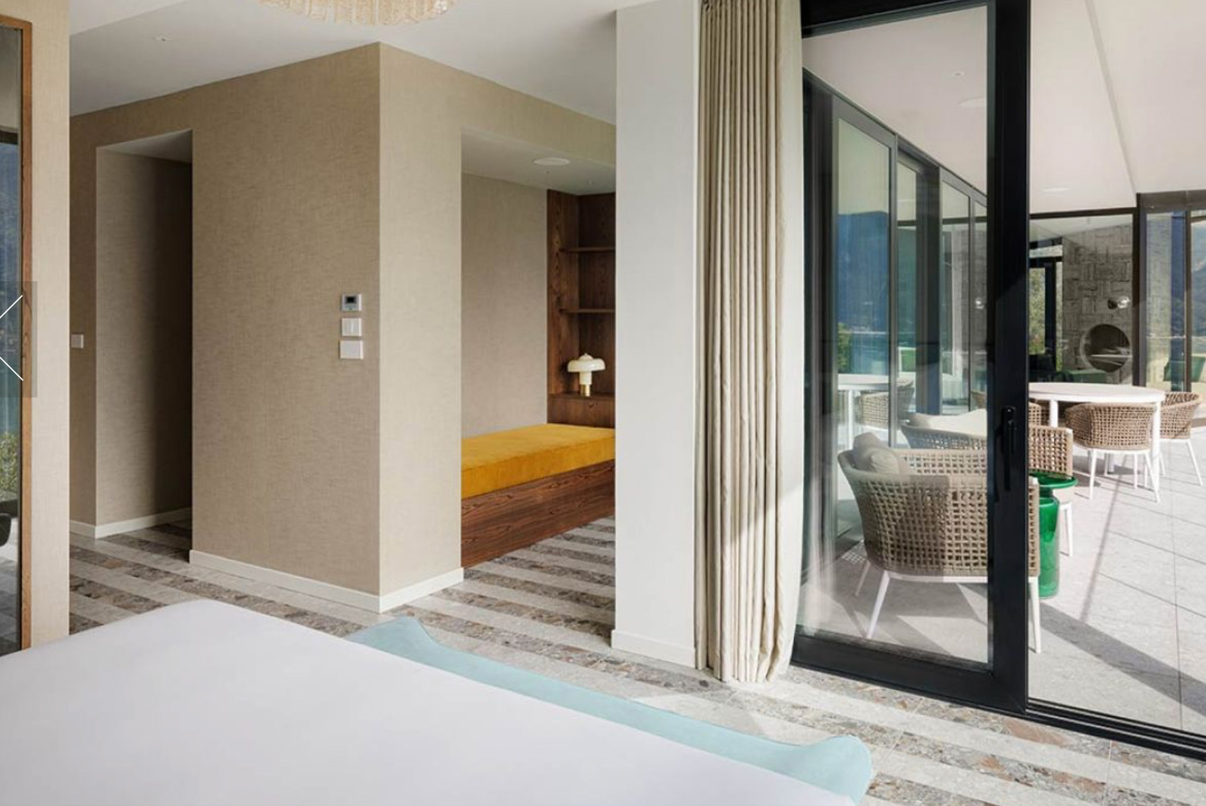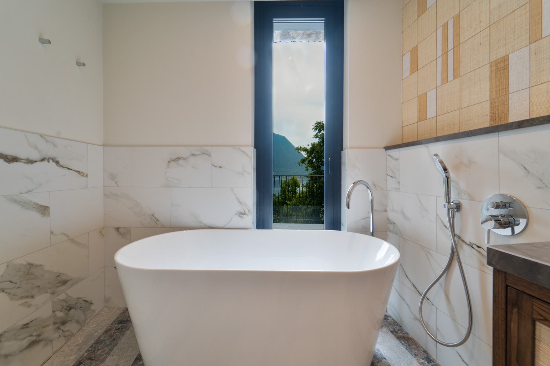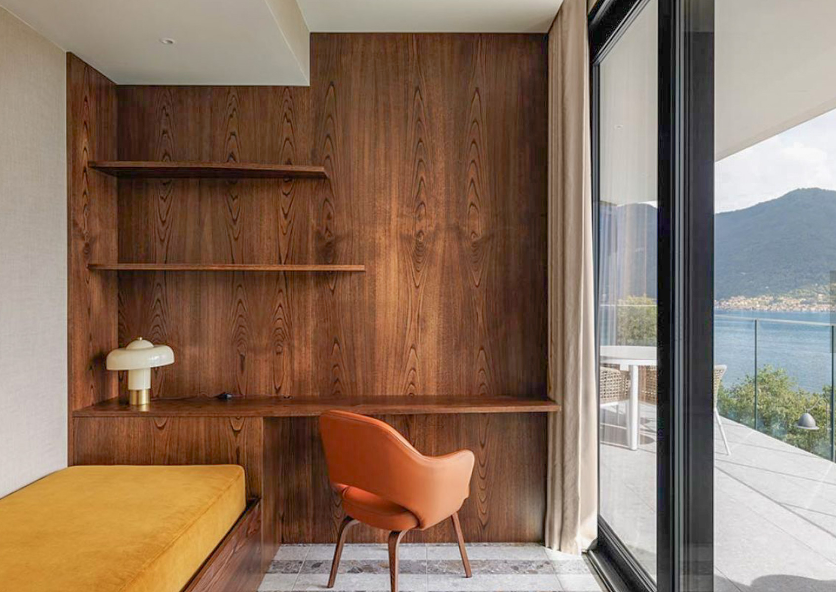 The main level is bright and open, with an elegant, contemporary flow designed to showcase the lake. A sleek kitchen with stainless-steel island and striped stone flooring anchors the space, while floor-to-ceiling glass doors frame Lake Como like a living artwork. Warm wood accents and a statement chandelier above the oval dining table create a sophisticated, welcoming mood—ideal for lingering meals and effortless entertaining.