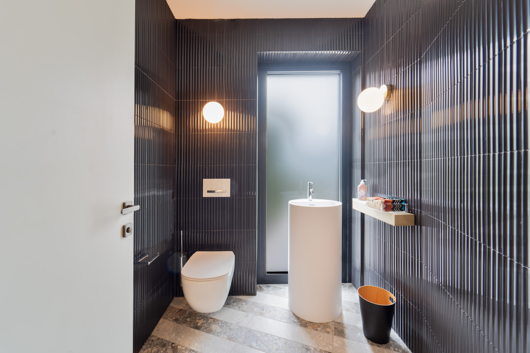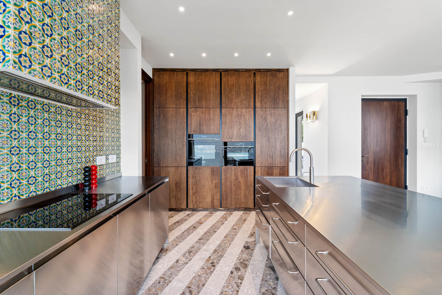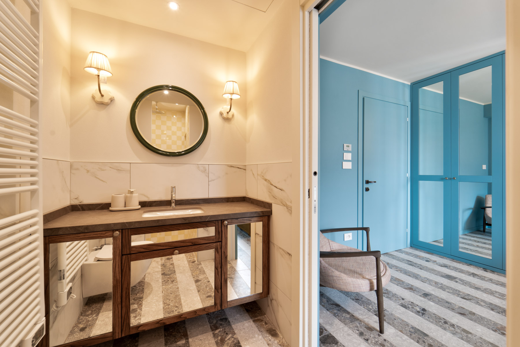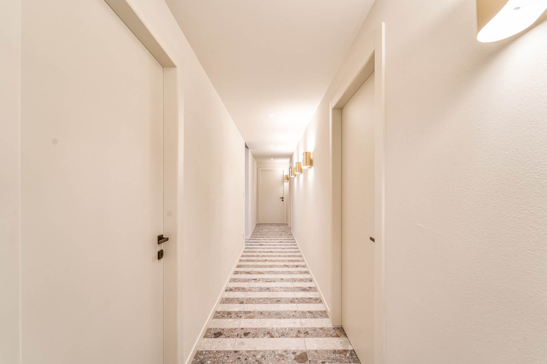 The main level is bright and open, with an elegant, contemporary flow designed to showcase the lake. A sleek kitchen with stainless-steel island and striped stone flooring anchors the space, while floor-to-ceiling glass doors frame Lake Como like a living artwork. Warm wood accents and a statement chandelier above the oval dining table create a sophisticated, welcoming mood—ideal for lingering meals and effortless entertaining.