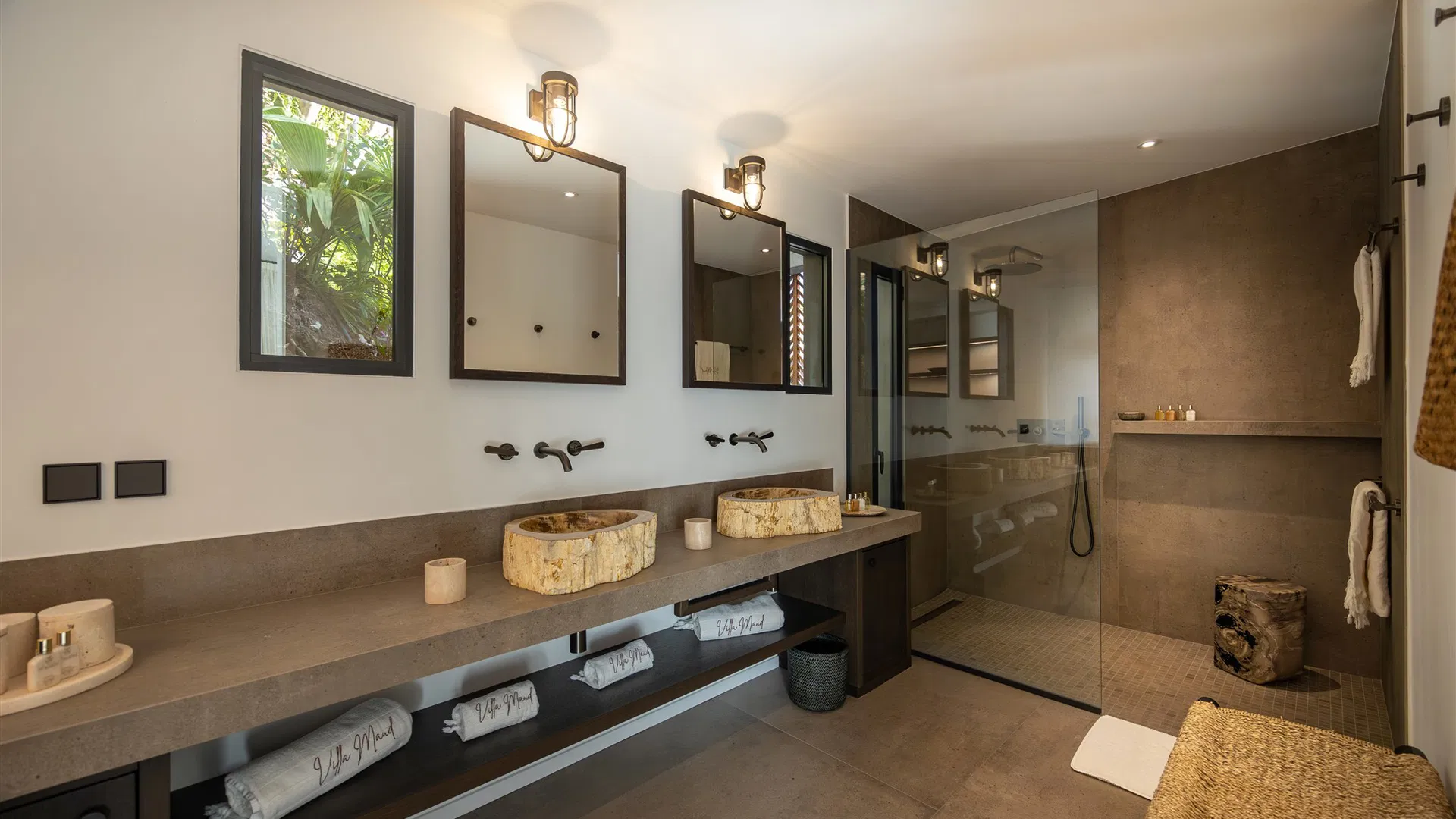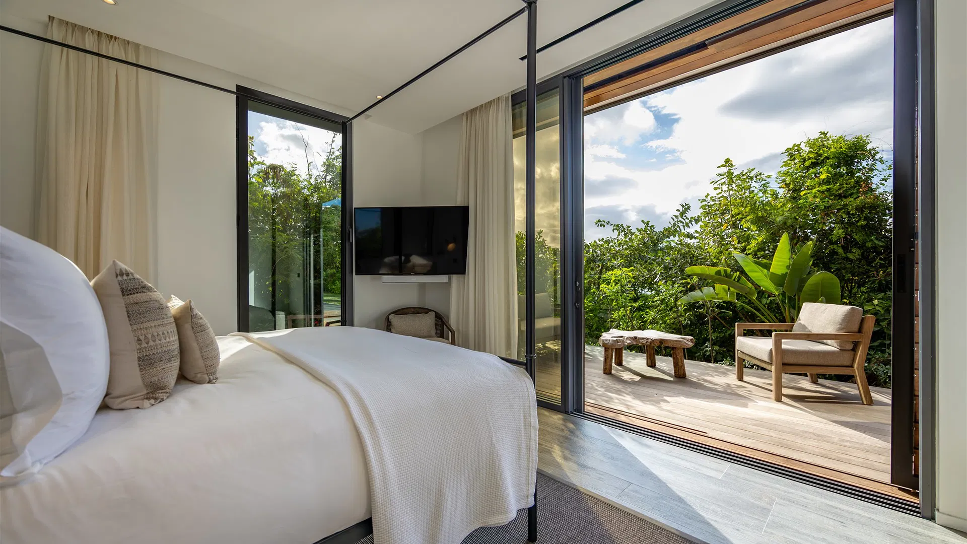 The villa’s five bedrooms, spread across two floors and connected by a cozy internal staircase, provide ample space for each visitor to relax. A primary suite on the main floor with a king-size bed boasts a private terrace and the same expansive view as the living areas. It also has a seating area for leisurely mornings and a smart HD screen for peaceful evenings. Four more suites downstairs have separate terraces that are surrounded by greenery, giving them a sense of privacy.