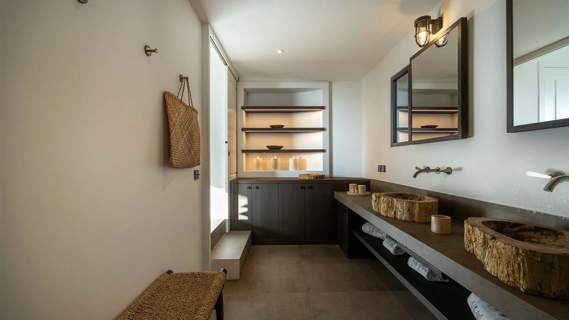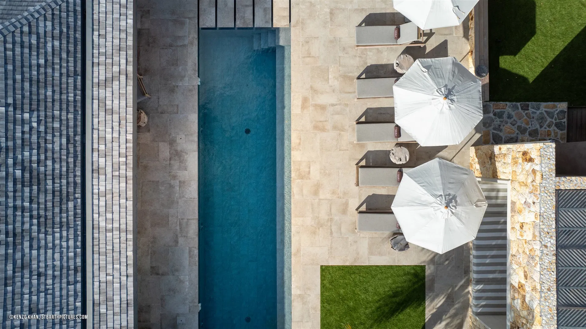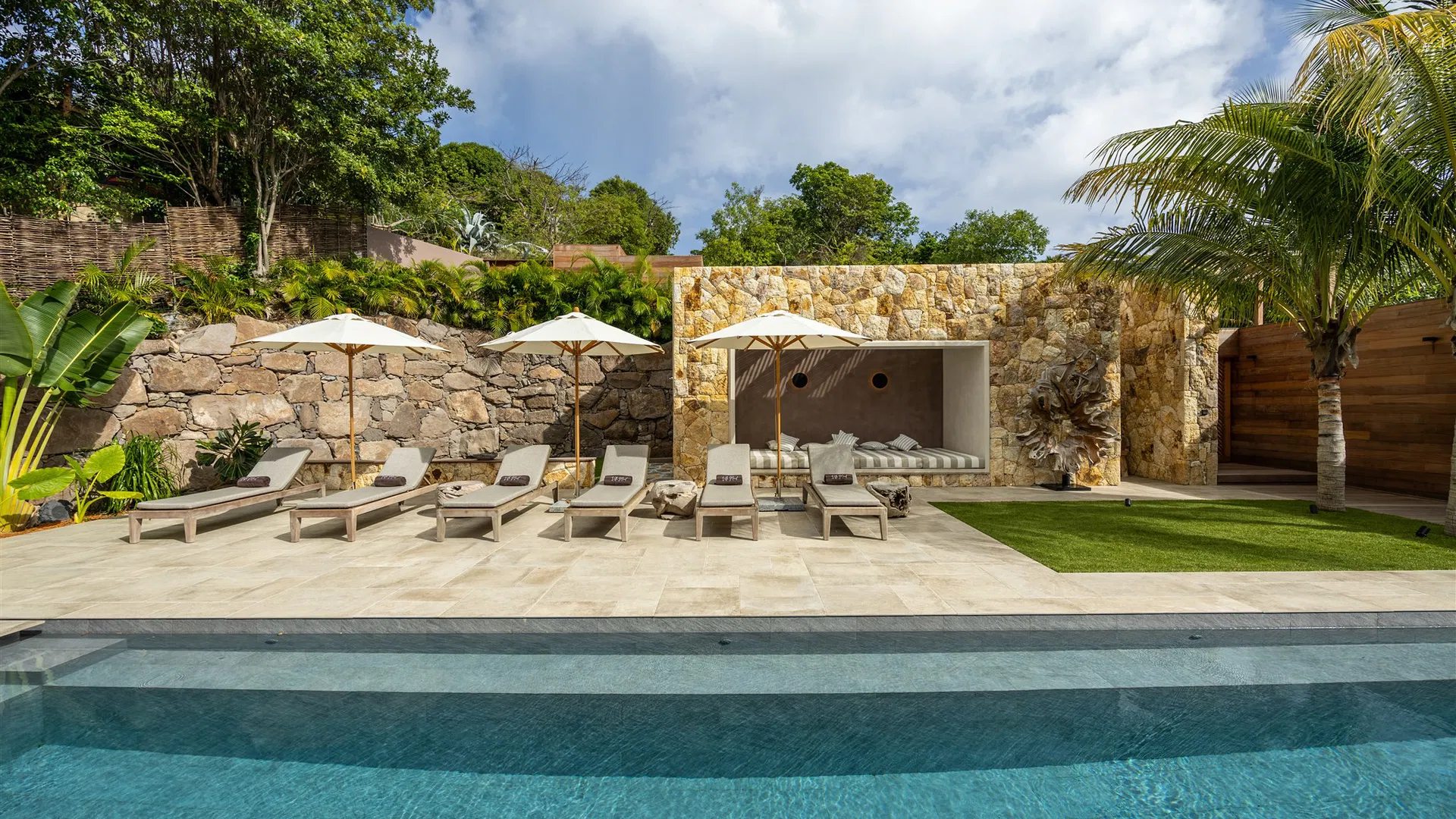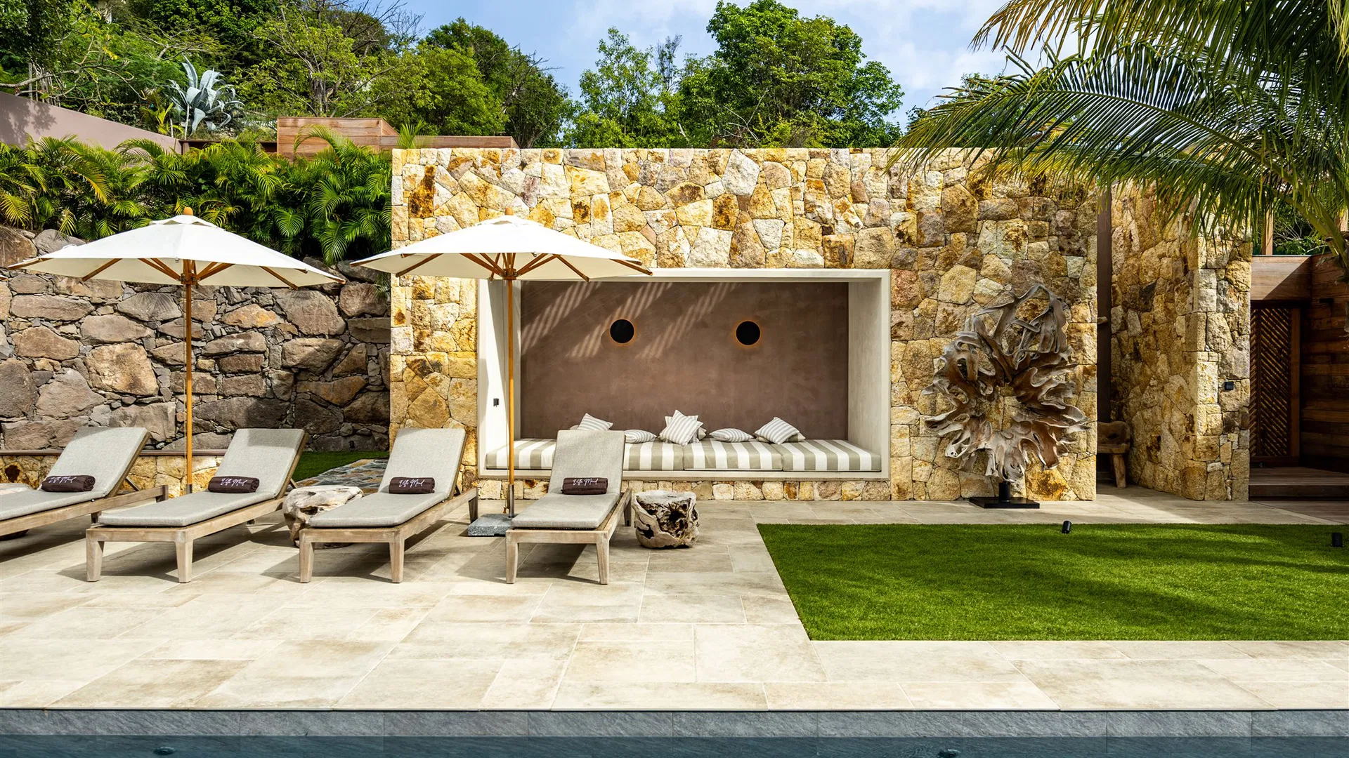 Villa Maud is displayed on the terrace outside. Your gaze is drawn to the bay by the heated pool that runs along the edge in an endless line. There is always a spot in the sun and a spot in the shade thanks to the thoughtful placement of sun loungers and umbrellas. A romantic alcove with padded benches is nestled behind a blond-stone wall, providing a peaceful spot for morning coffee or a private discussion as dusk falls. Casual grilled lunches feel as effortless as the island itself thanks to a well-kept patch of lawn that frames the built-in barbecue and softens the timber deck.