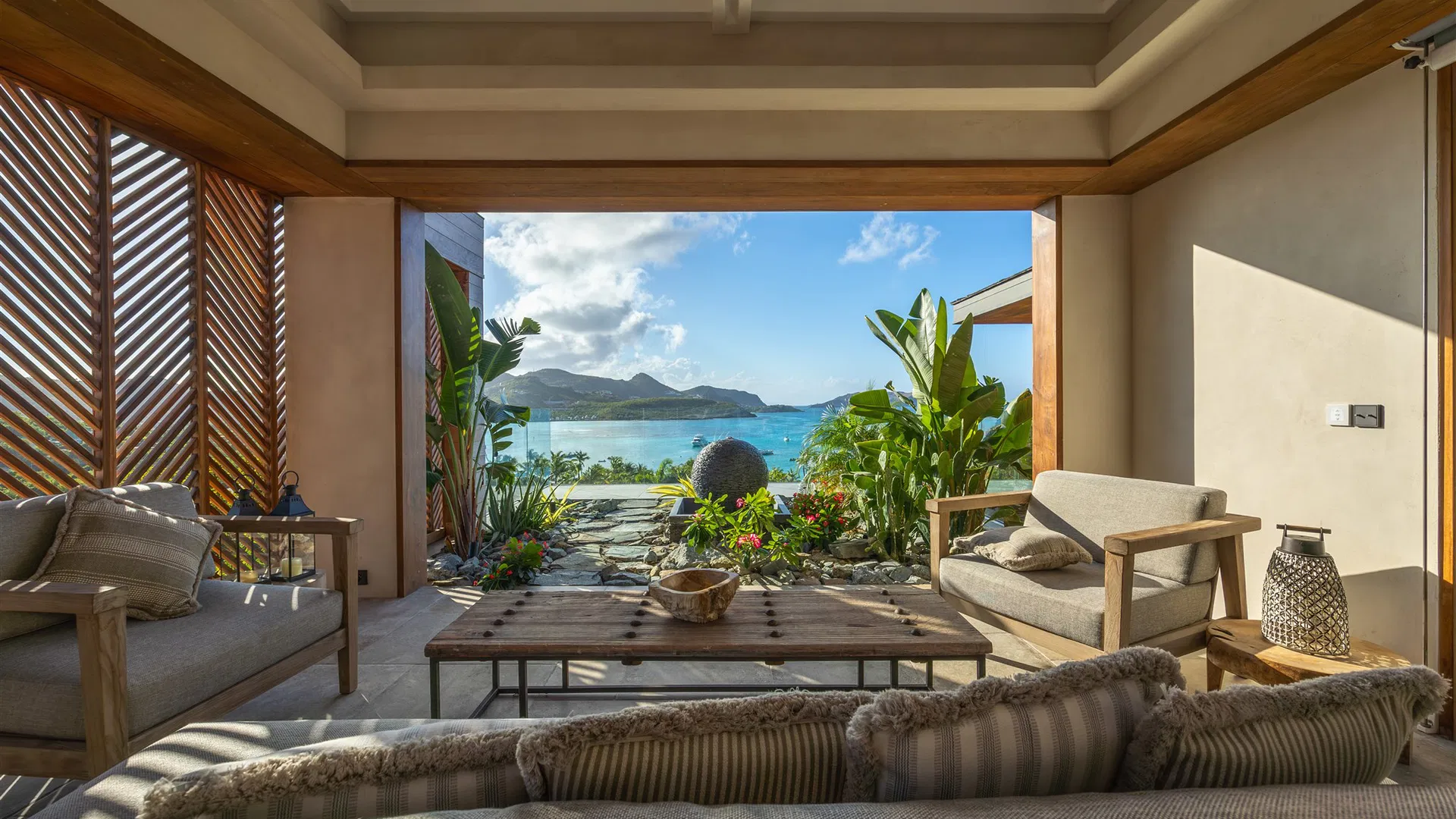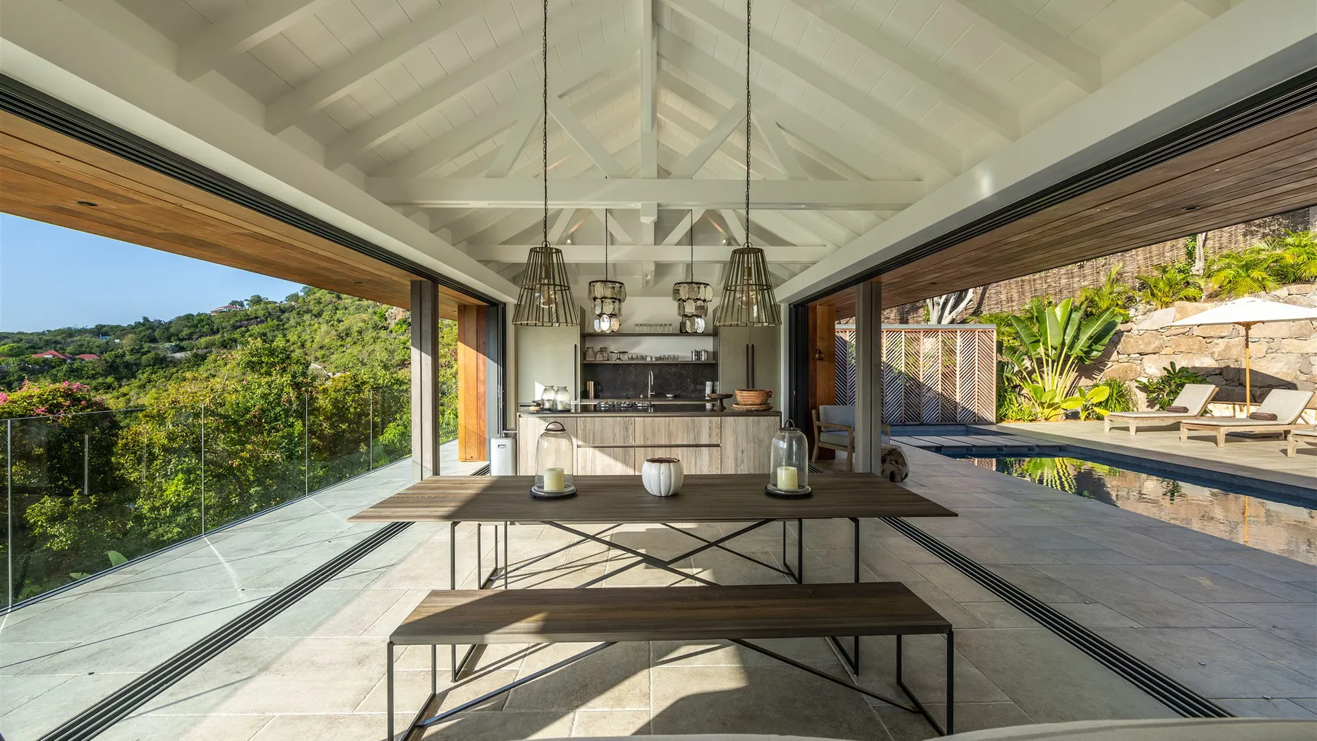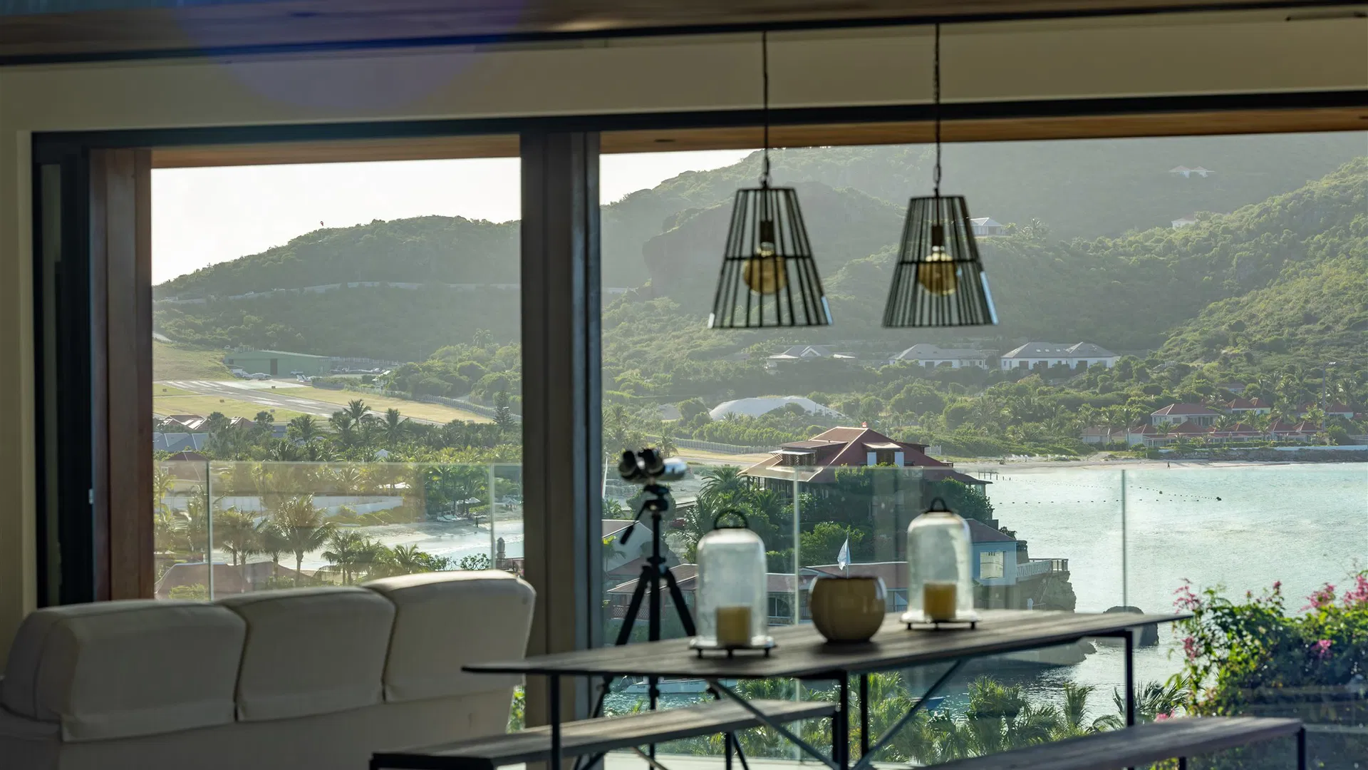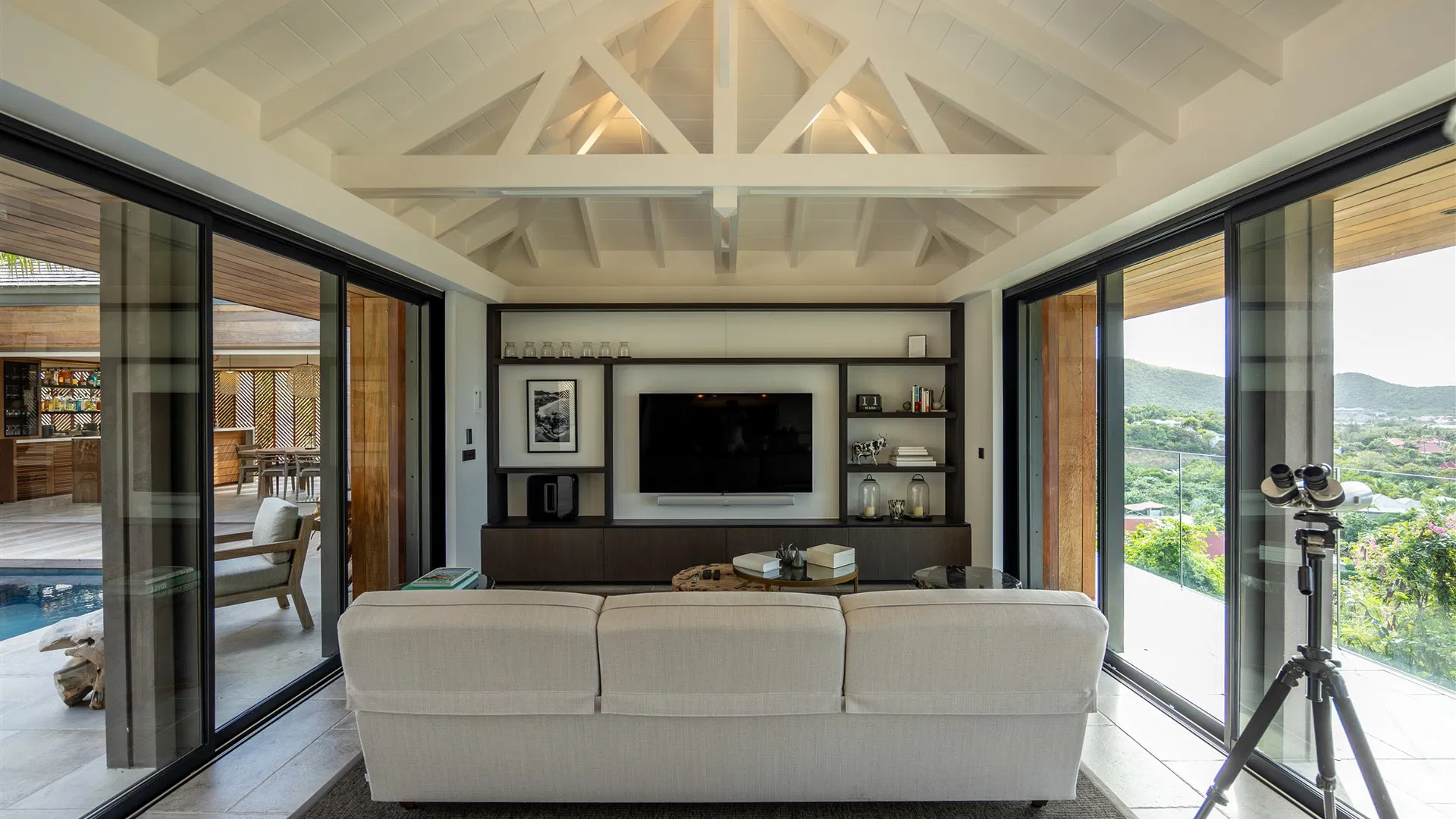 As the light changes from morning silver to sunset gold, the iconic Eden Rock, which is directly across the water, is visible from its hillside vantage point. The house itself is designed to make every hour revolve around that view, and the setting is classic St-Barths—close enough to be on St-Jean’s sandy crescent in minutes, yet high enough to feel private and quiet. The first thing you notice when you walk in is the spacious great room that opens up to the terrace.