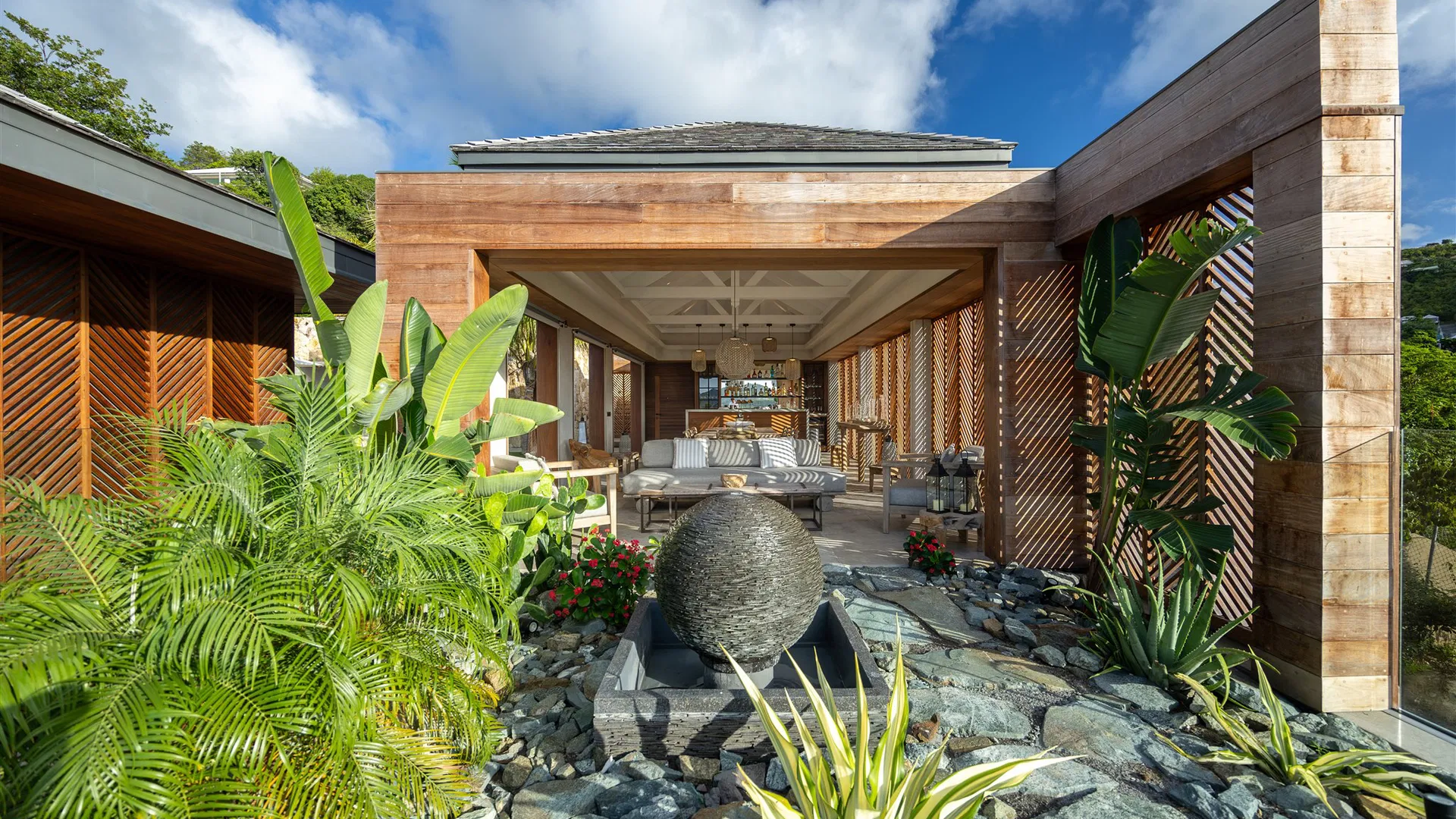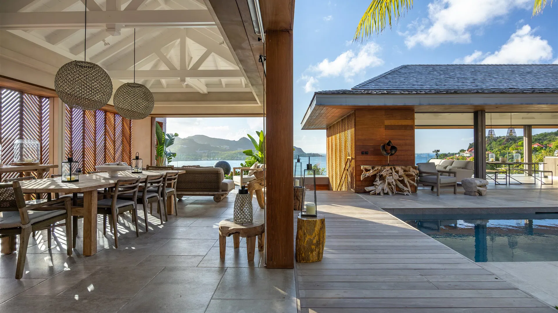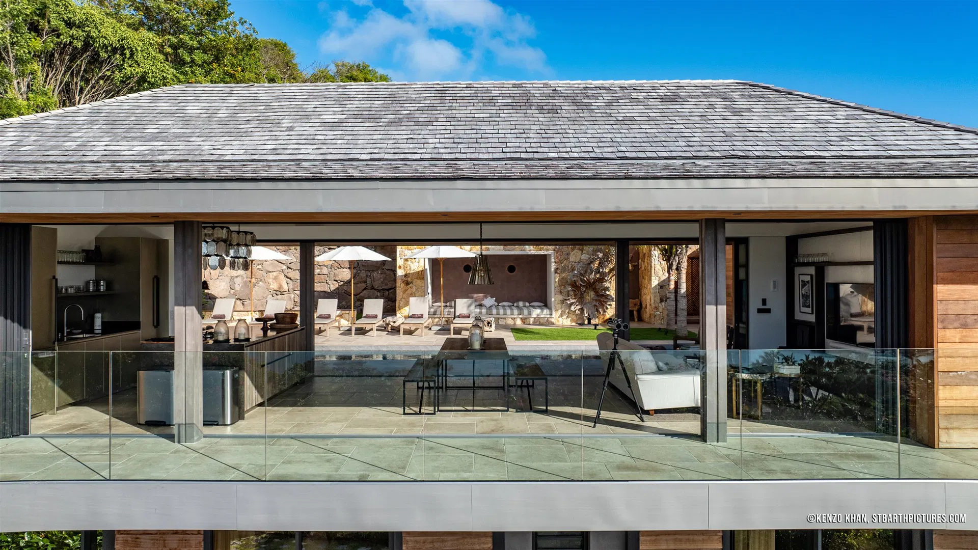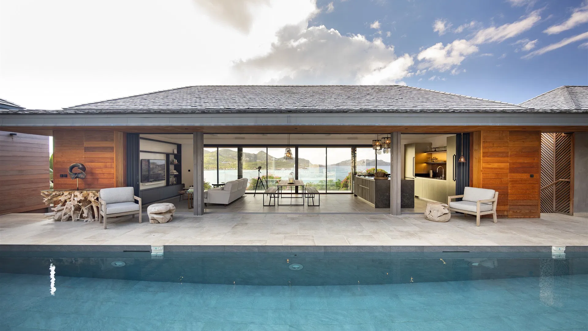 As the light changes from morning silver to sunset gold, the iconic Eden Rock, which is directly across the water, is visible from its hillside vantage point. The house itself is designed to make every hour revolve around that view, and the setting is classic St-Barths—close enough to be on St-Jean’s sandy crescent in minutes, yet high enough to feel private and quiet. The first thing you notice when you walk in is the spacious great room that opens up to the terrace.
