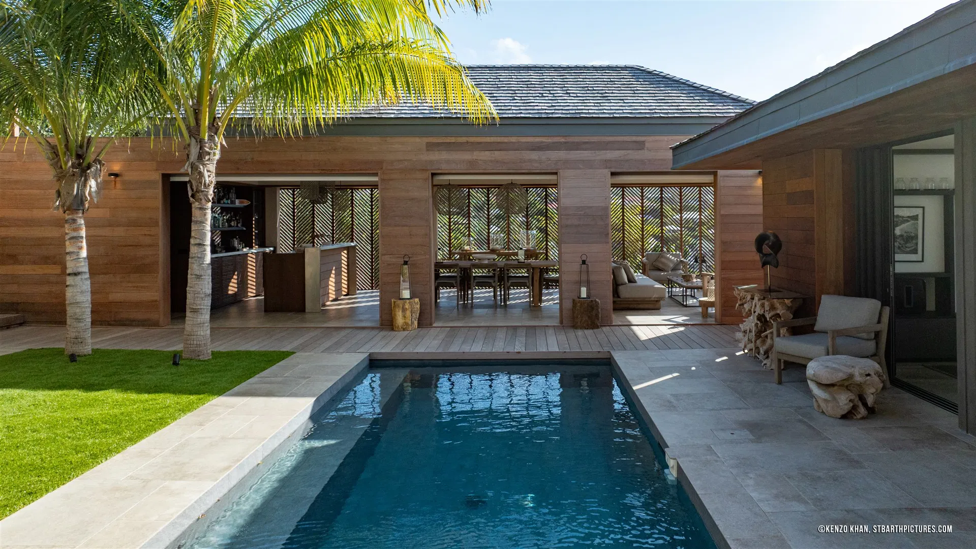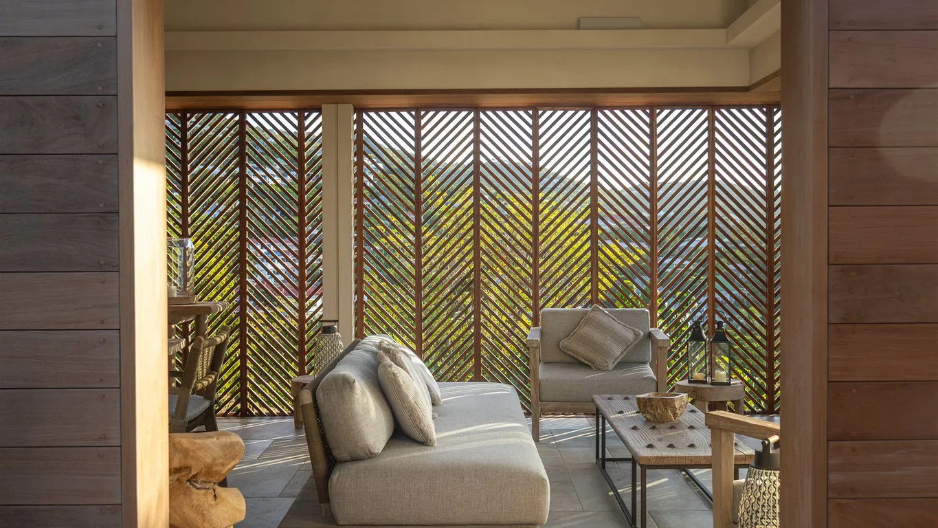 The mood changes in the most charming way when you turn perpendicular to the main pavilion. With deep couches and a sleek bar, a second lounge extends along the bay. The carved wood on the side wall of this lounge filters the island light into soft, patterned beams. With doors open to the breeze and the sound of palm fronds rustling above the pool, it serves as a haven for reading and catching up during the day and as a natural gathering place for nightcaps after dinner. With both lounges sliding open to the terrace, you can swim, lounge, chat, and repeat throughout the day without ever losing sight of the water.