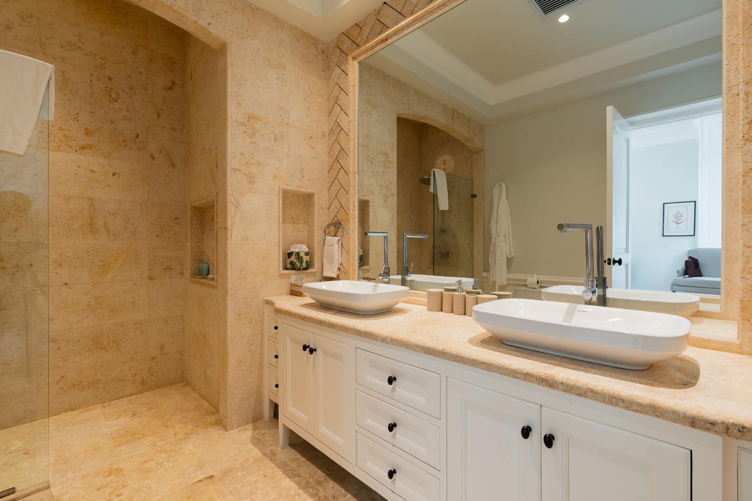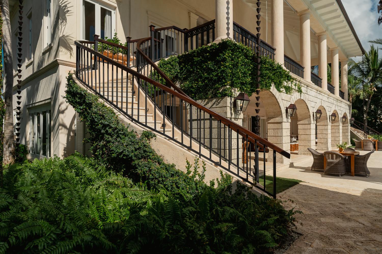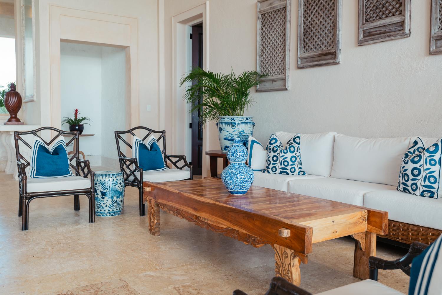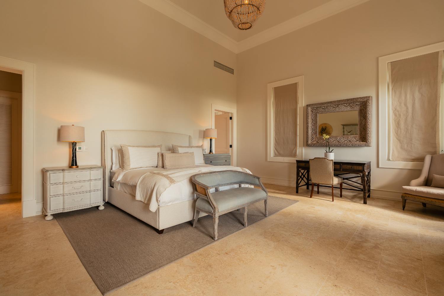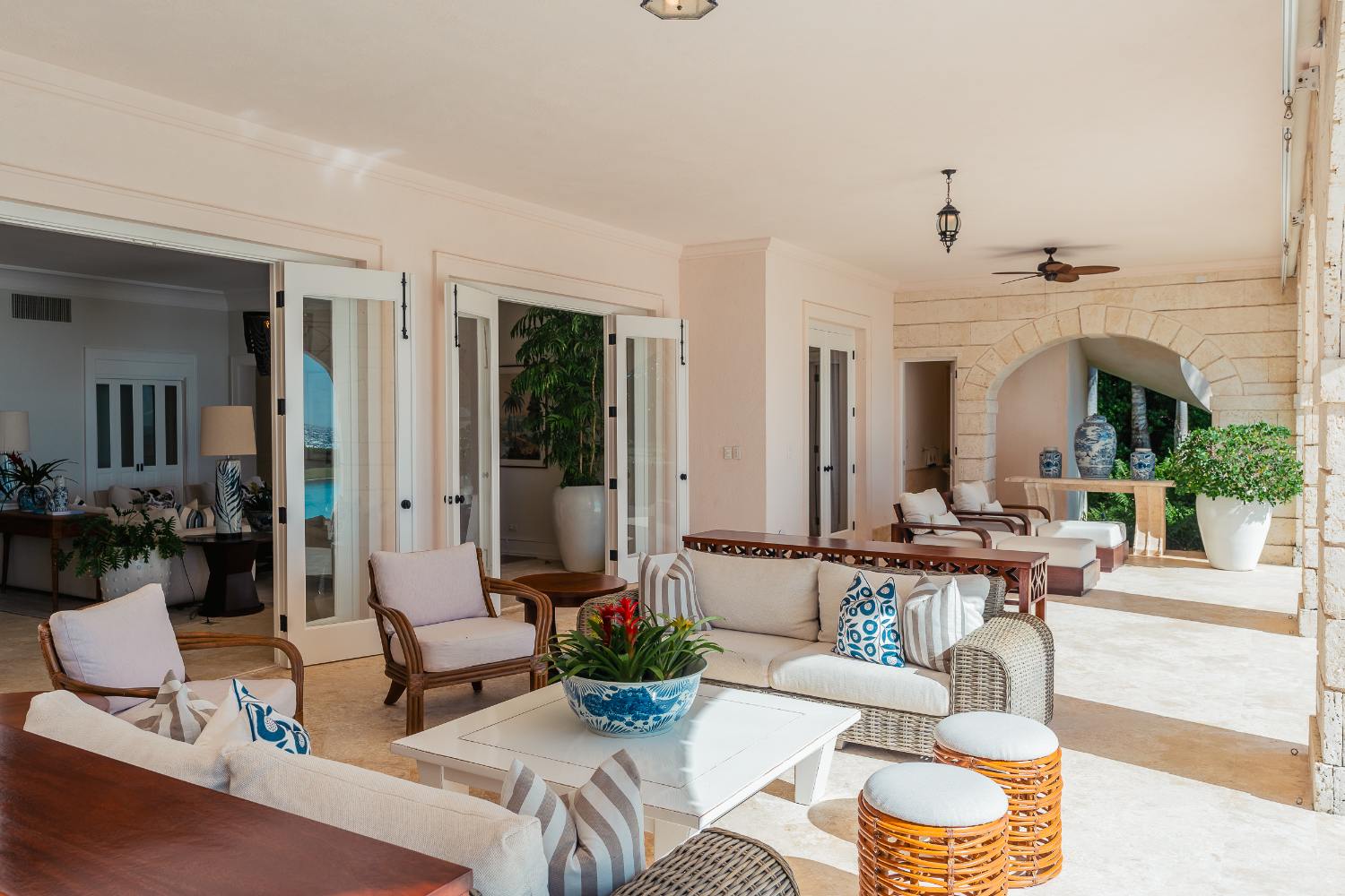 Seven beautifully furnished bedrooms resemble private suites. The main oceanfront suite has a large bathroom and dressing area that allow you to unwind into the evening, and it opens to a private terrace for first-light color and last-light tranquility. With spa-bright en suite bathrooms, ample wardrobes, quiet climate control, and cool linens against sun-warmed skin, companion suites—some featuring lounge areas and terrace or garden access—are designed for genuine relaxation. Couples withdraw to their areas of light and breeze, families spread out without interfering with each other’s rhythms, and everyone re-connects where the pool meets the sea.