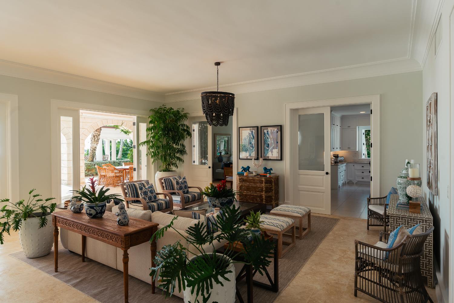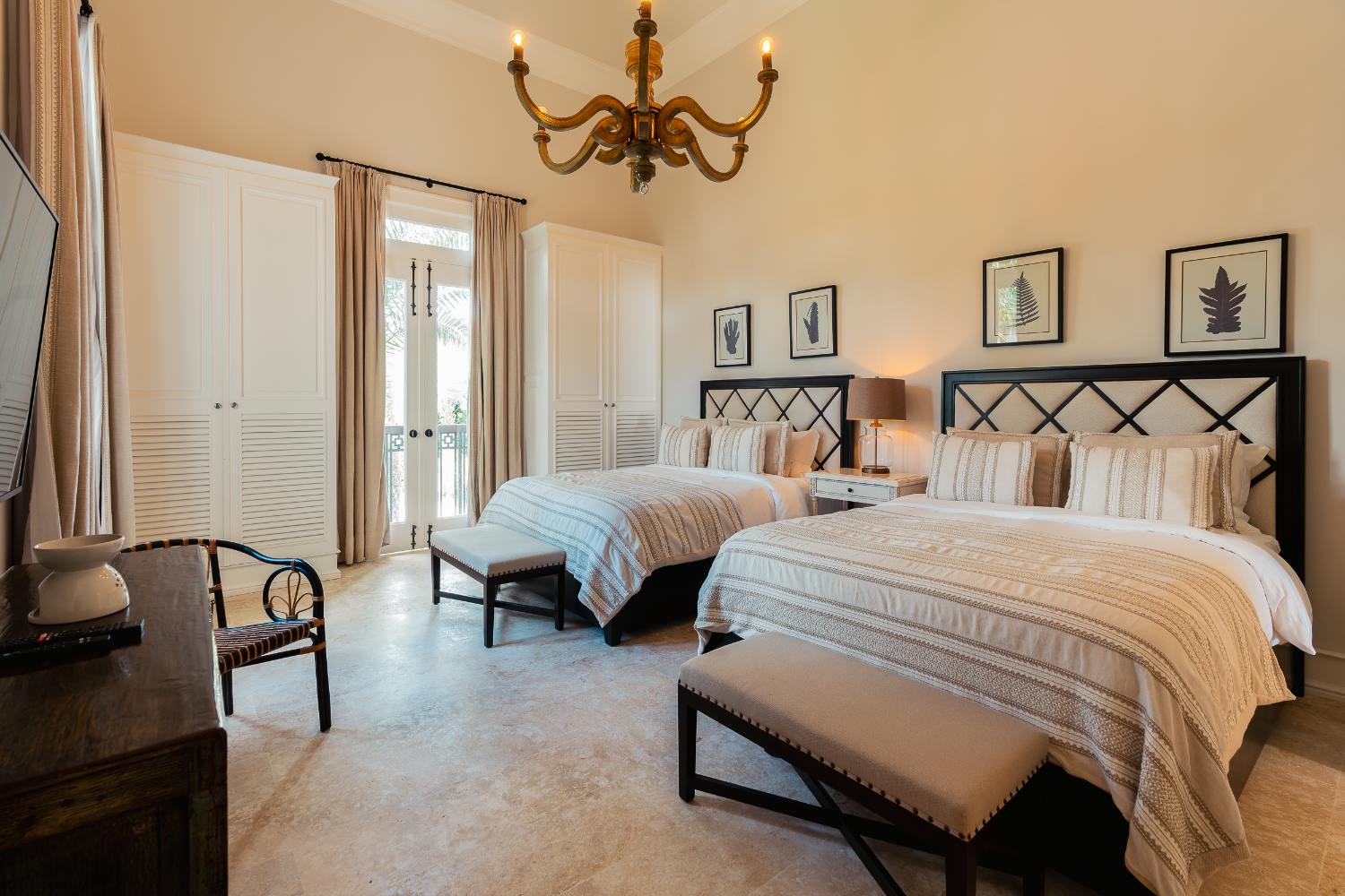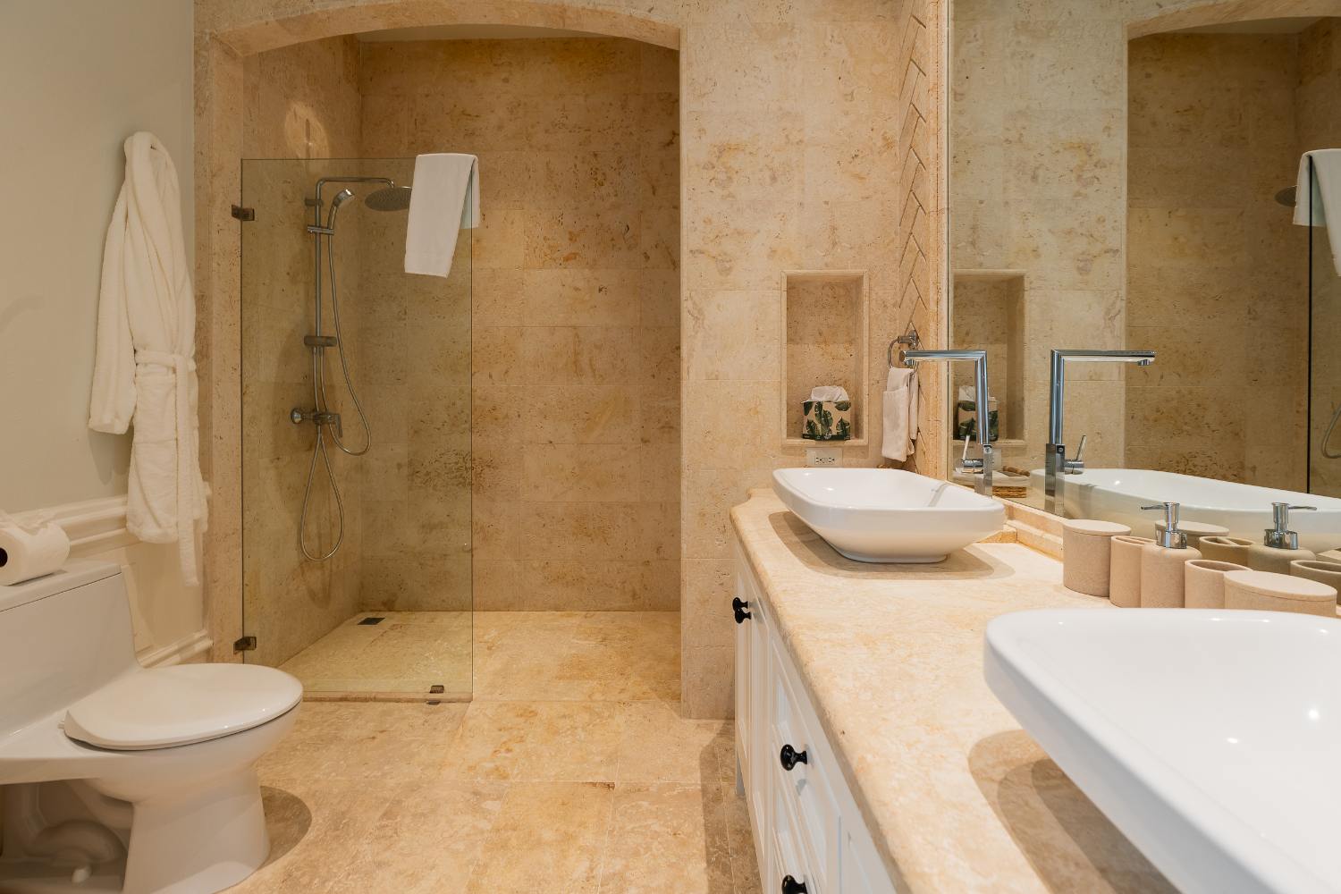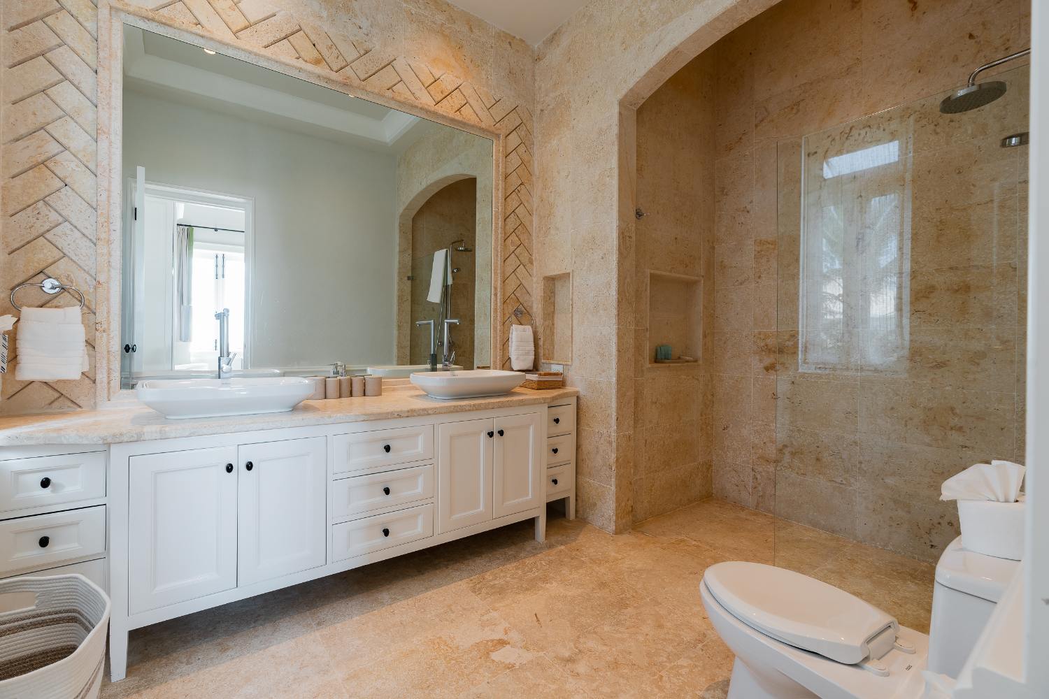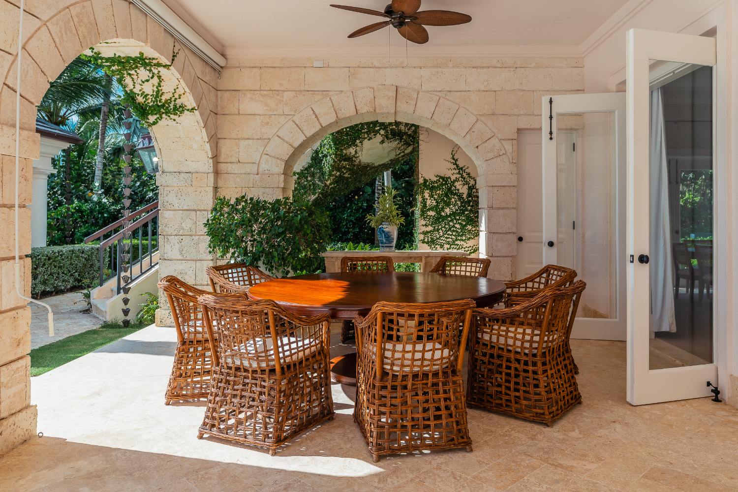 Seven beautifully furnished bedrooms resemble private suites. The main oceanfront suite has a large bathroom and dressing area that allow you to unwind into the evening, and it opens to a private terrace for first-light color and last-light tranquility. With spa-bright en suite bathrooms, ample wardrobes, quiet climate control, and cool linens against sun-warmed skin, companion suites—some featuring lounge areas and terrace or garden access—are designed for genuine relaxation. Couples withdraw to their areas of light and breeze, families spread out without interfering with each other’s rhythms, and everyone re-connects where the pool meets the sea.